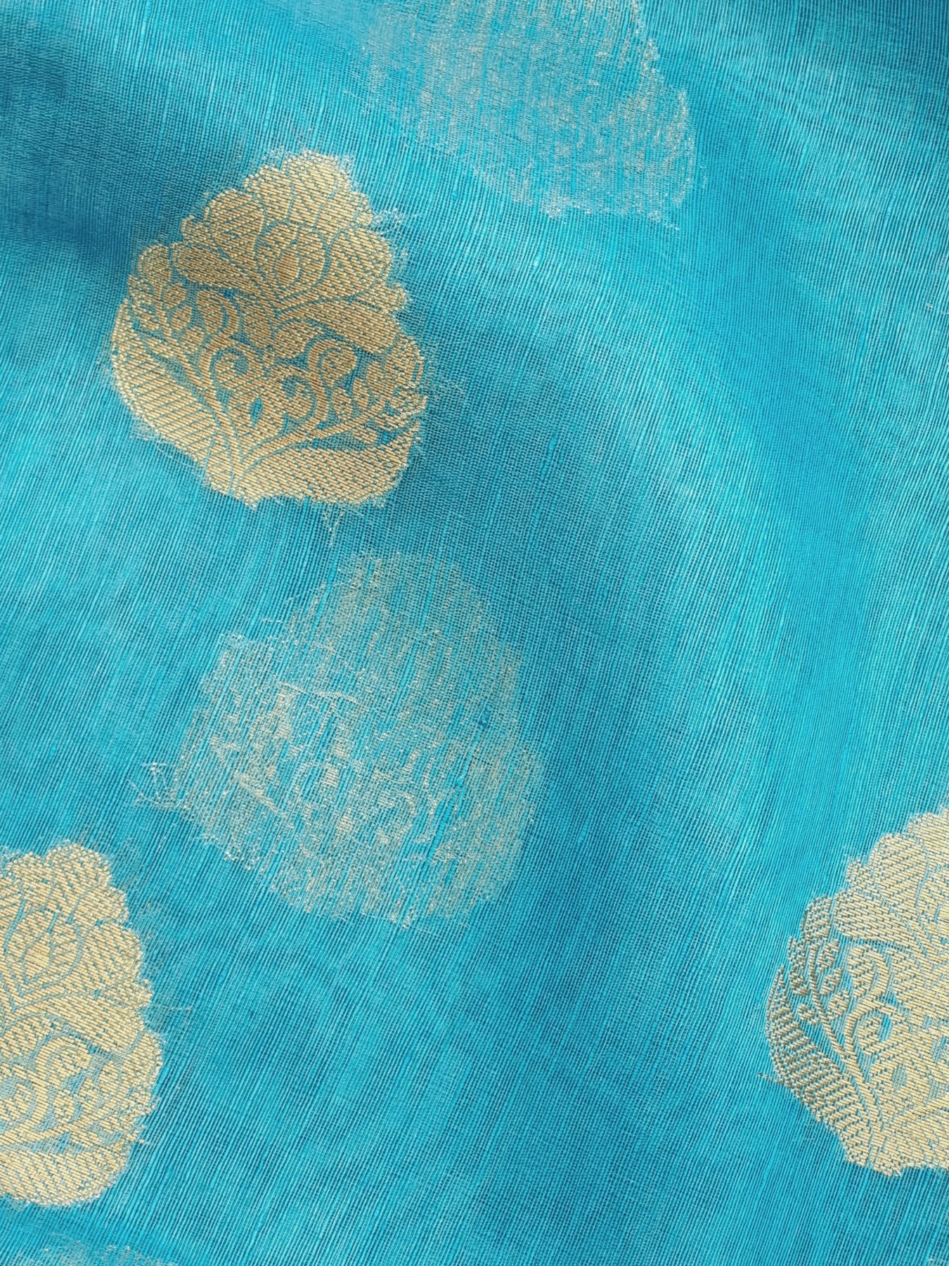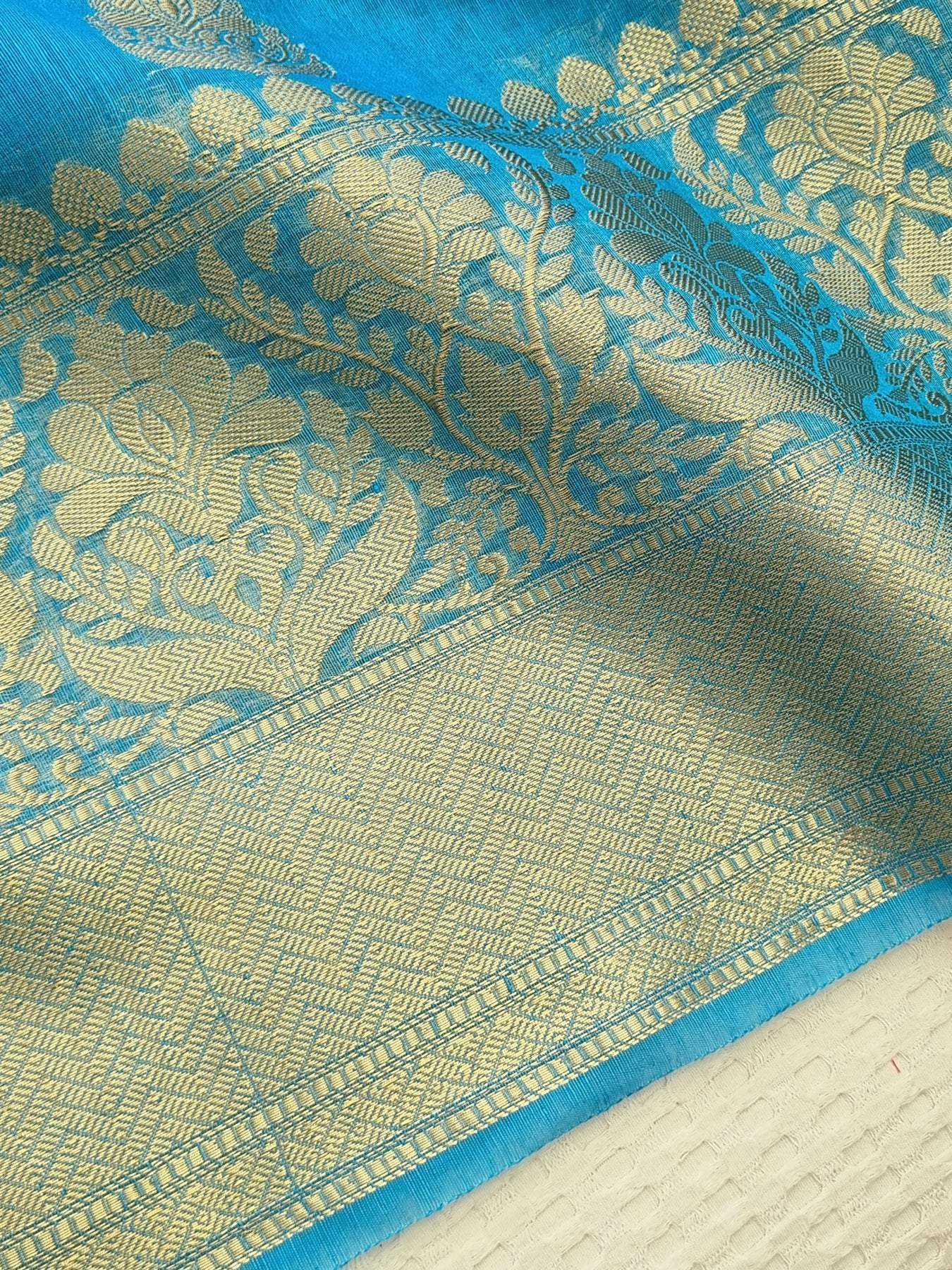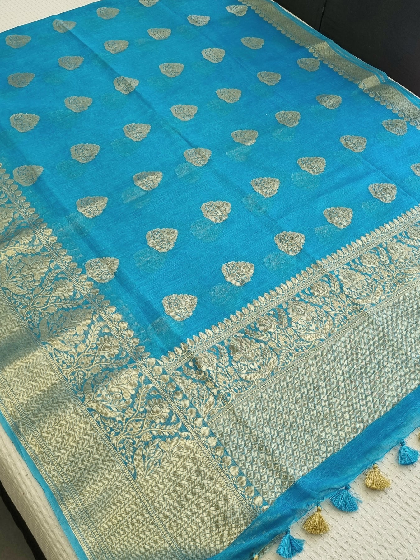 Handloom Blue Silk Linen Saree with Banarasi borders and Pallu