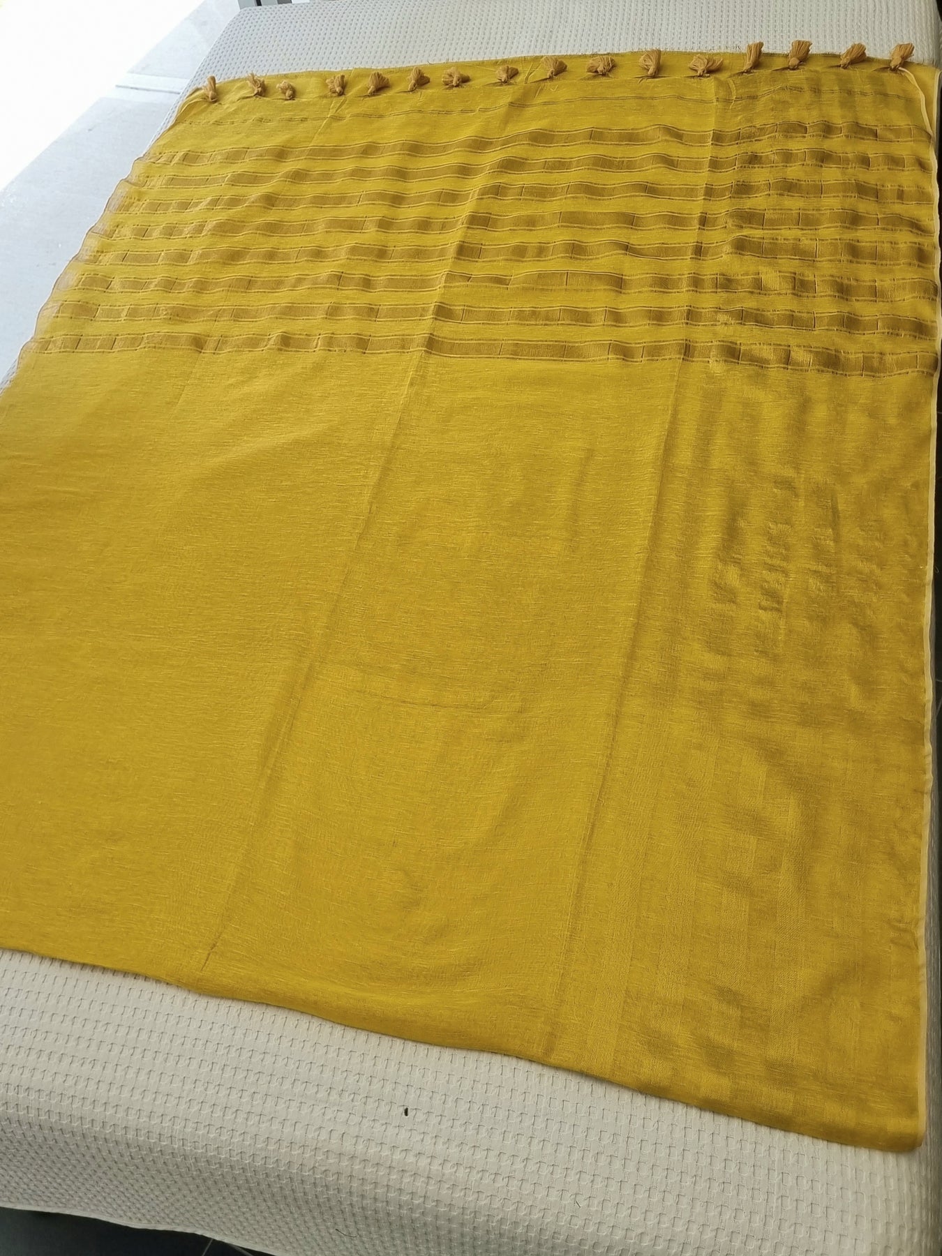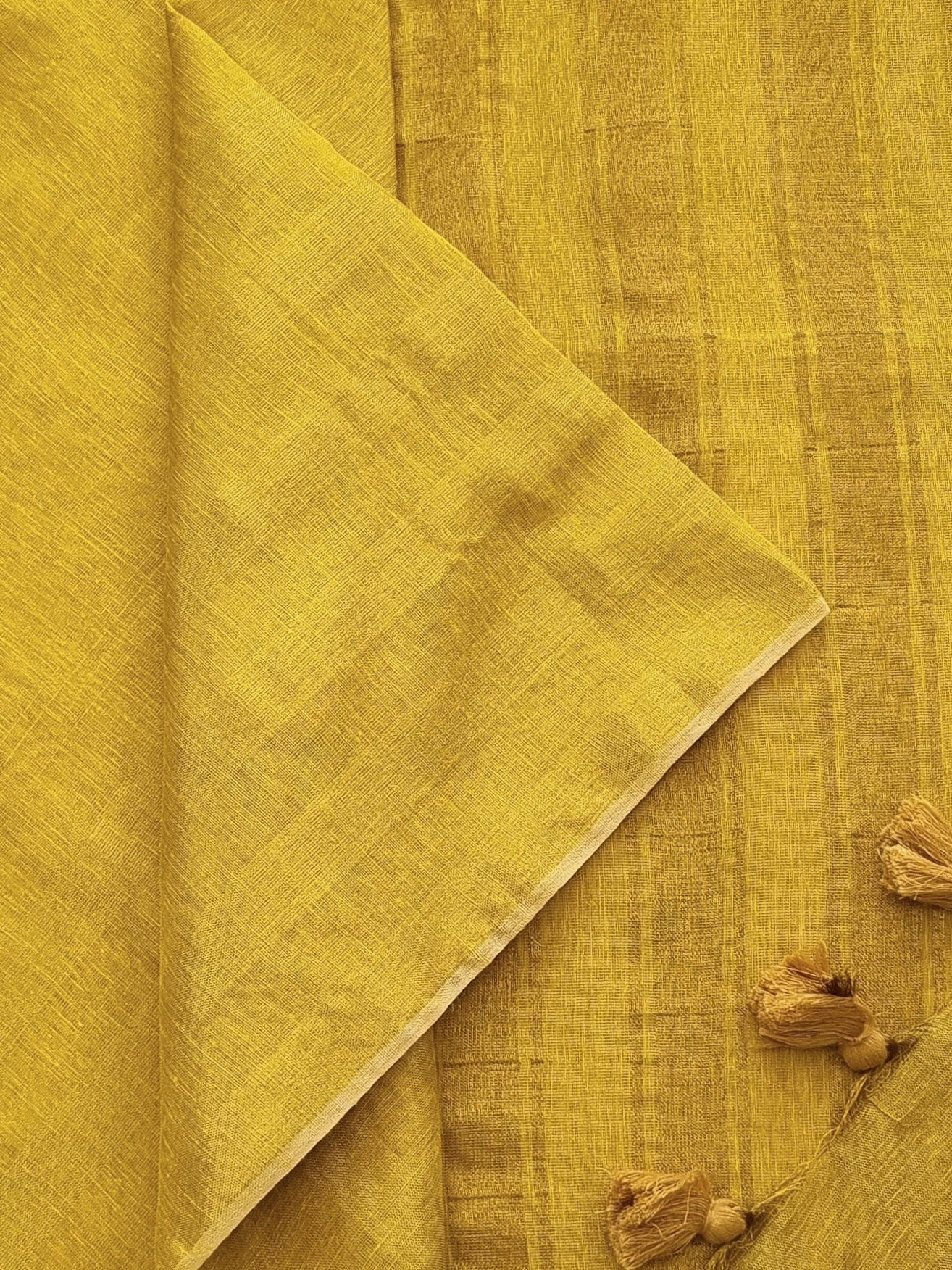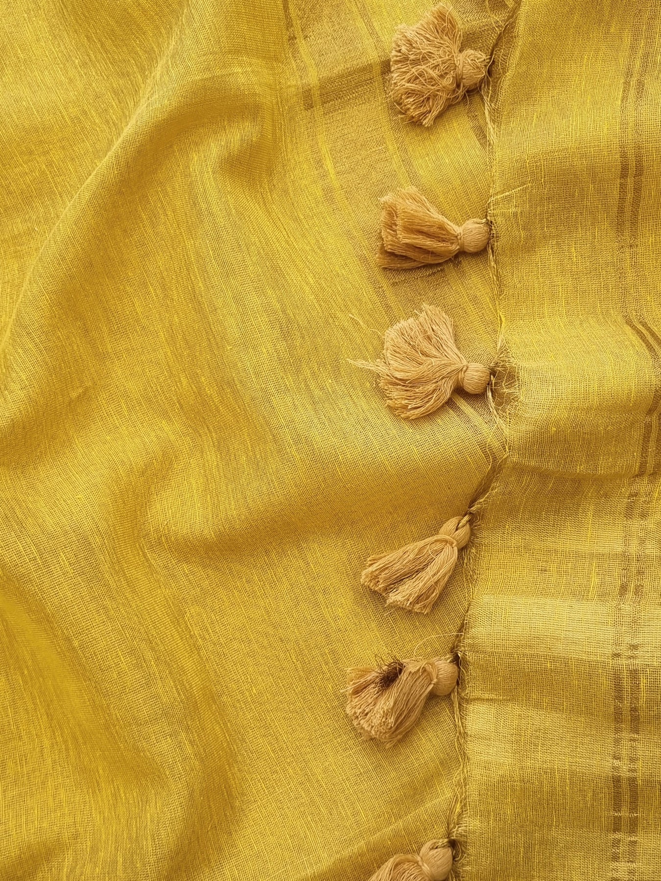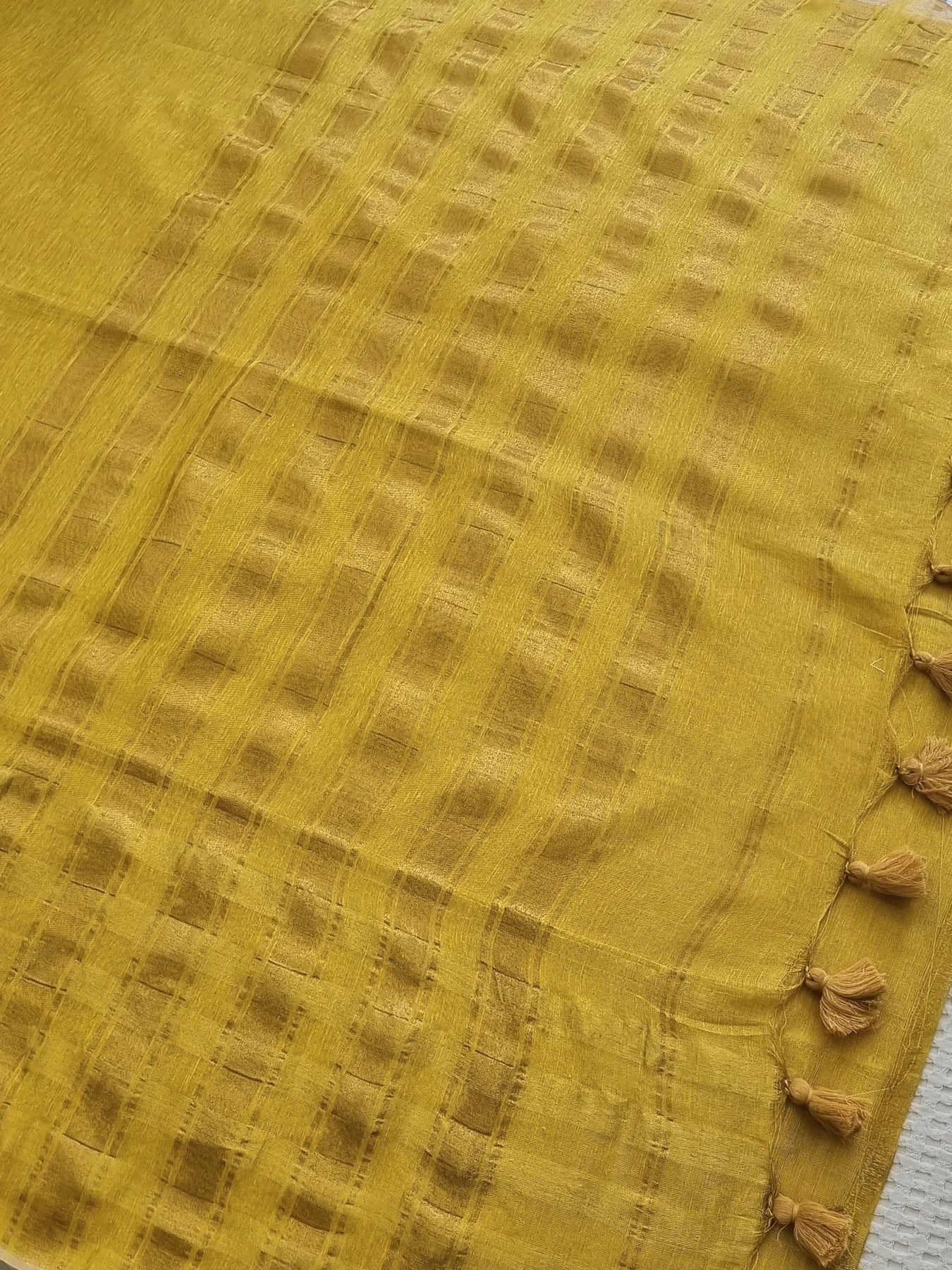 Woven from Tissue Linen with striped golden borders and pallu, adorned with tassels, this linen saree showcases ethnic elegance