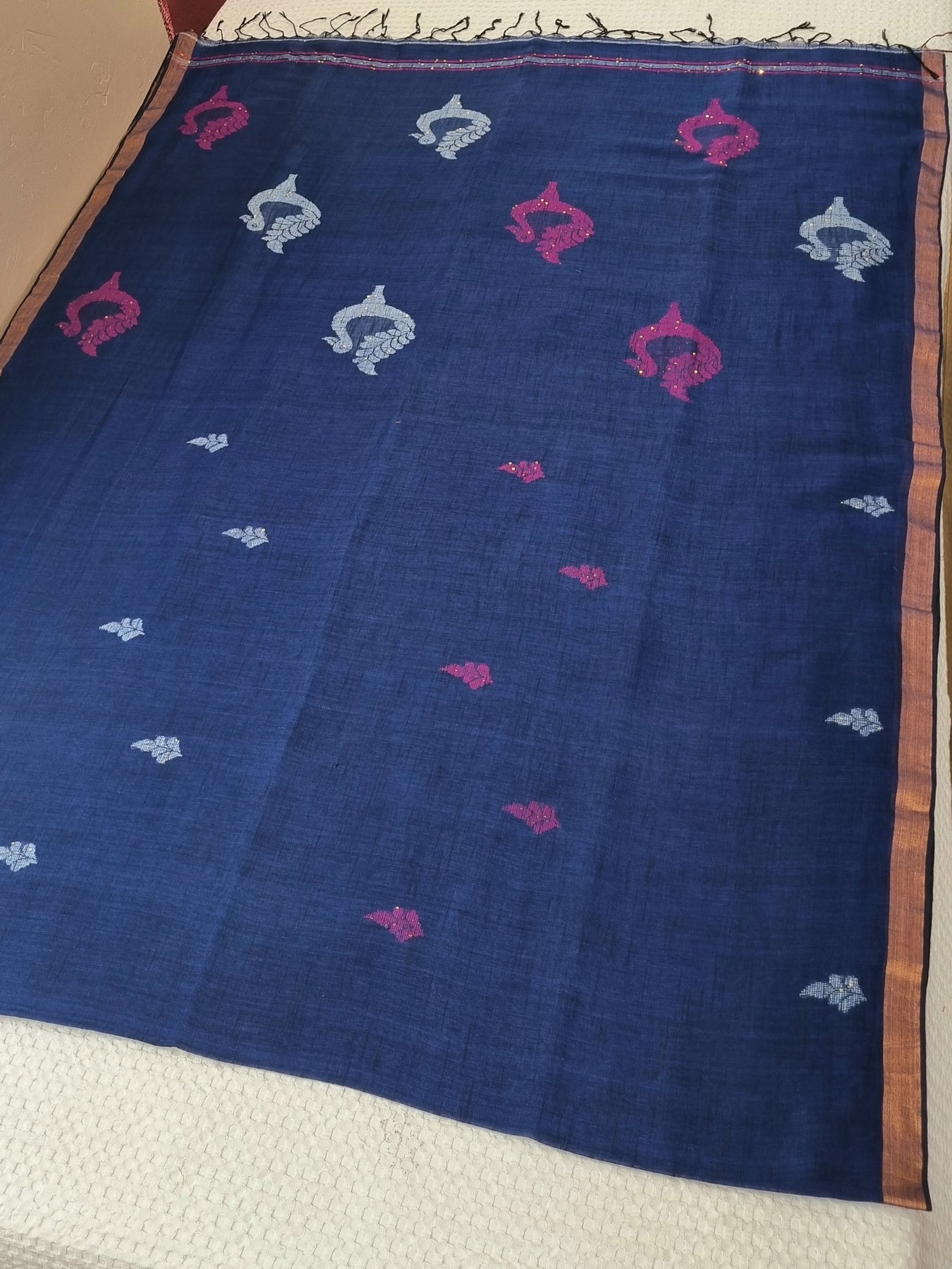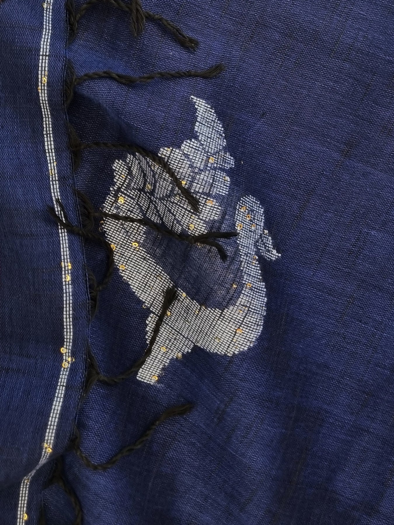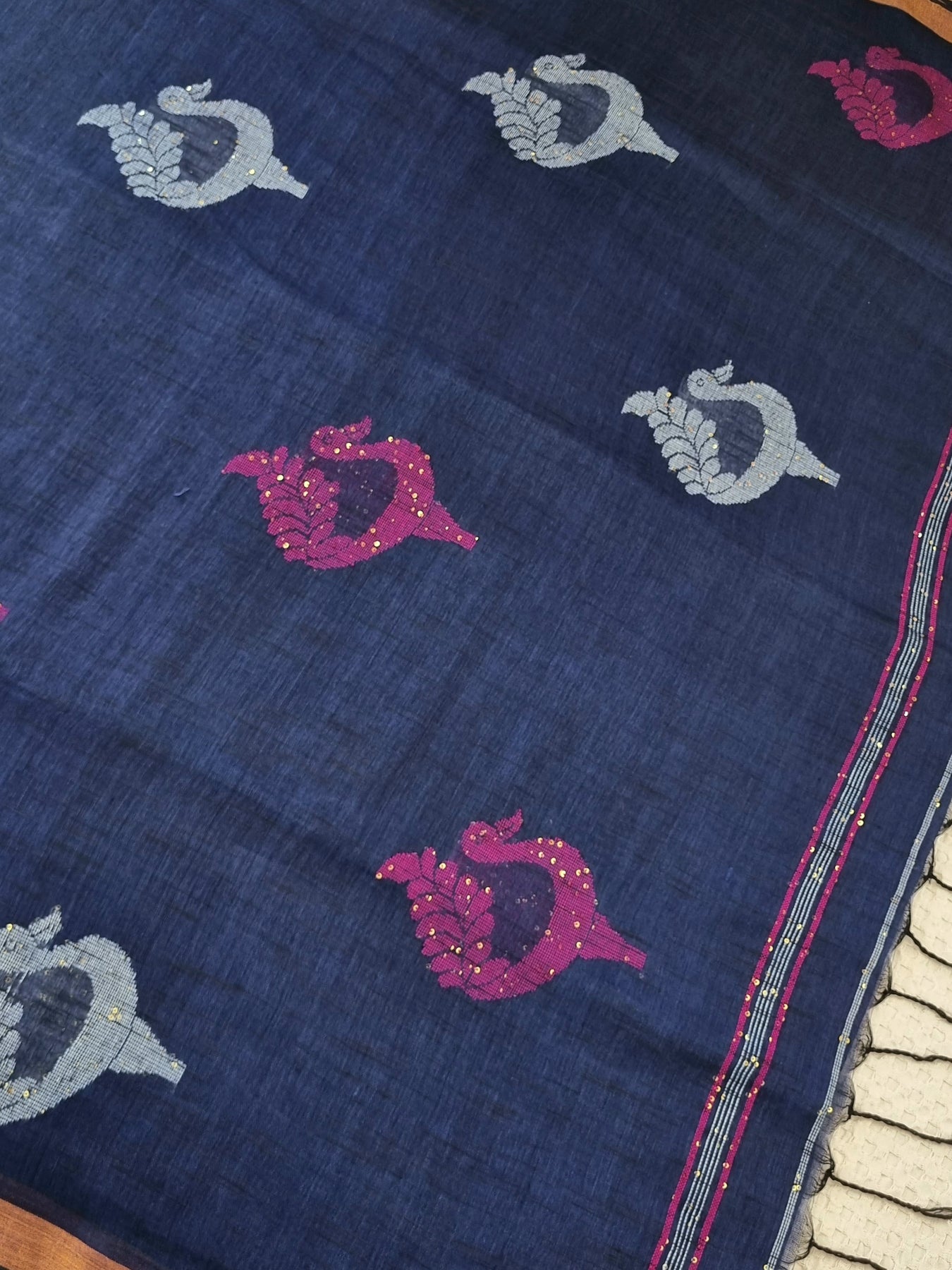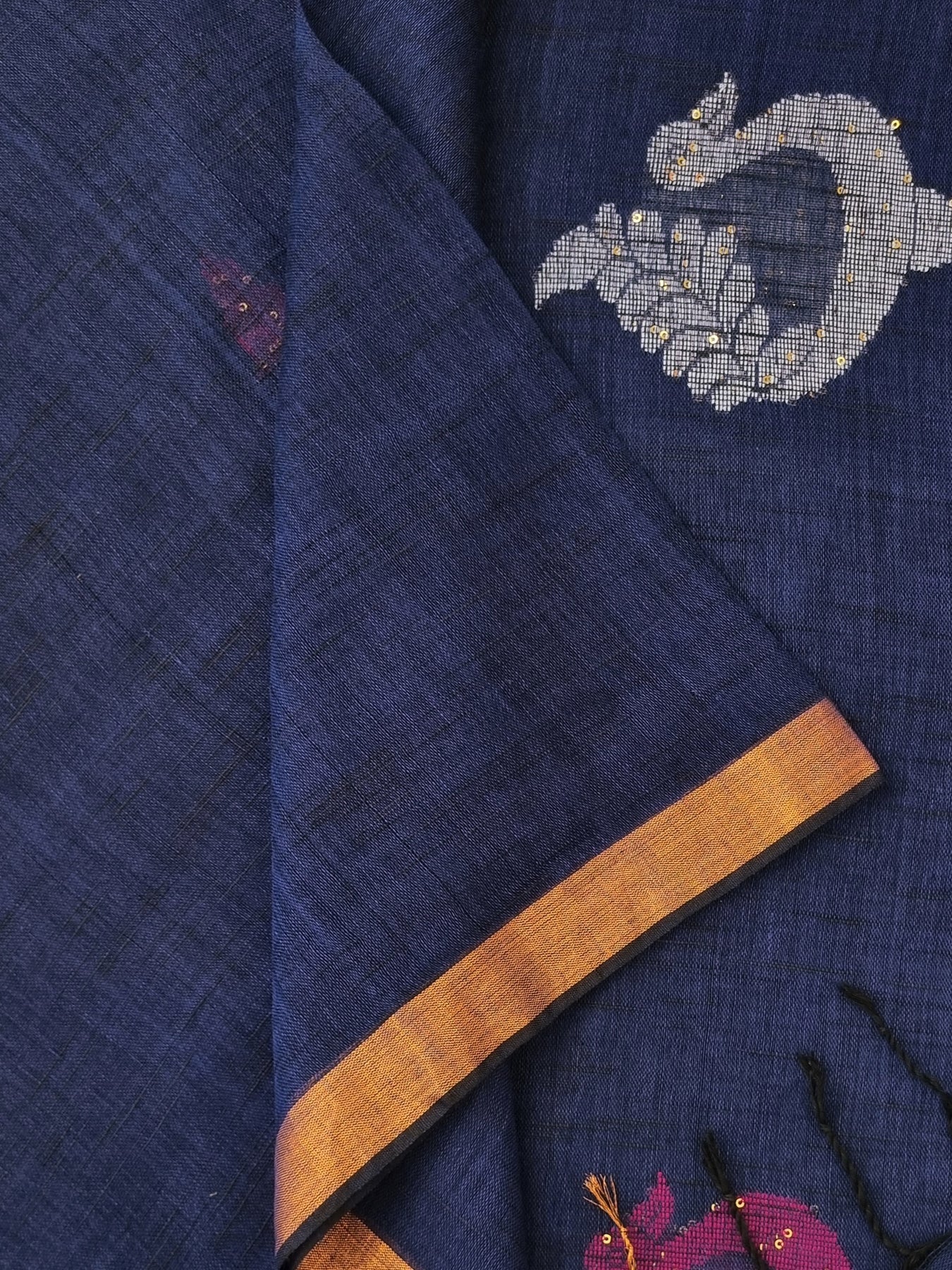 Woven from pure linen and adorned with contrastly embroidered motifs and sequins, this elegant royal blue linen saree is a great addition to your ethnic wardrobe