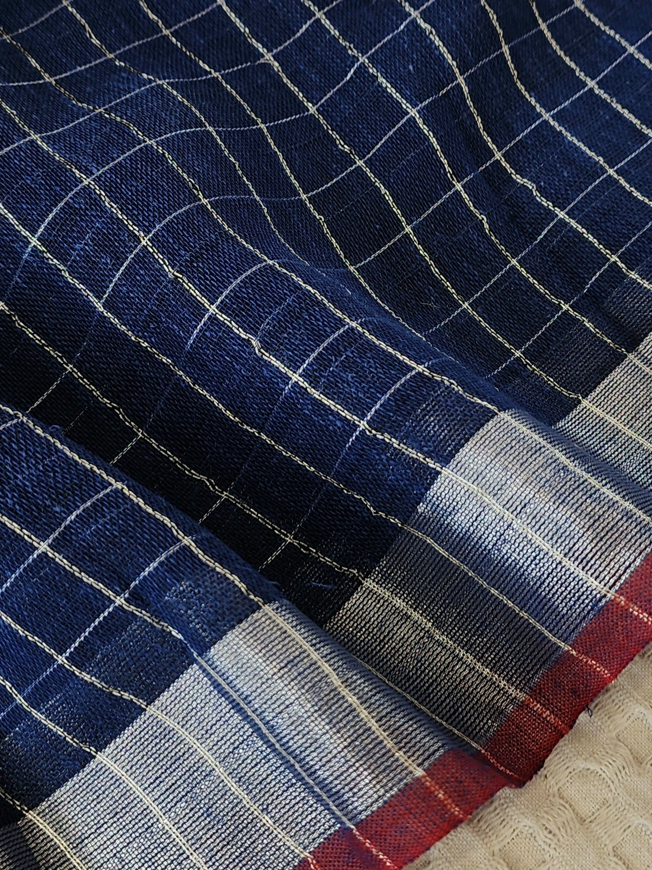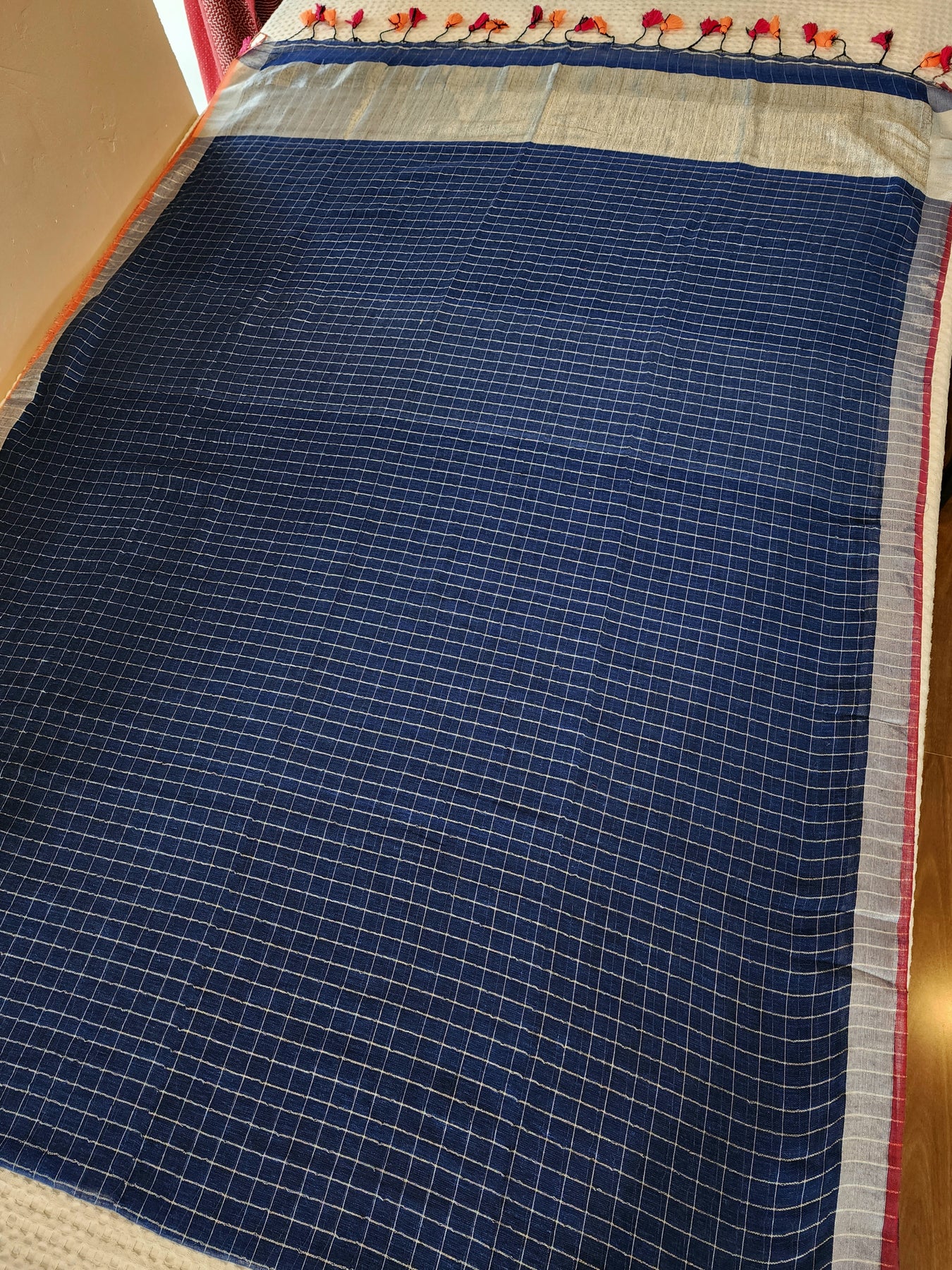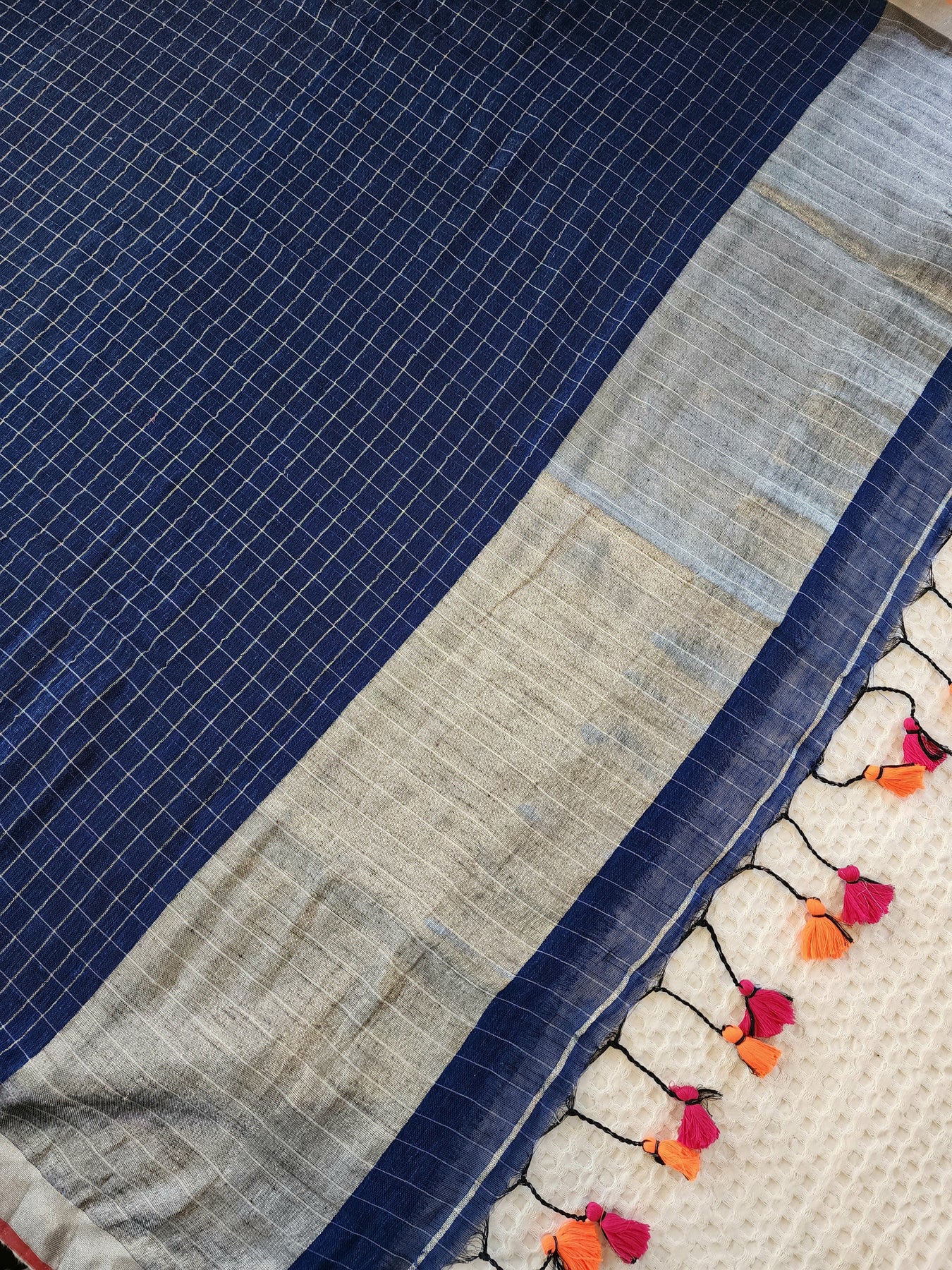 • Navy Blue checked body with silver pallu and dual toned contrast edging