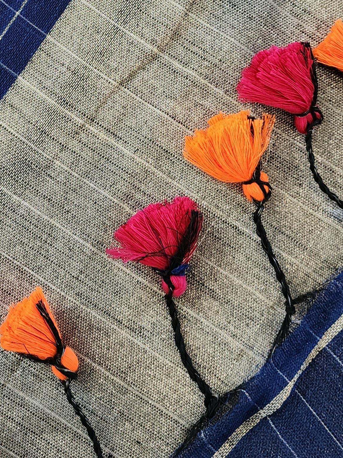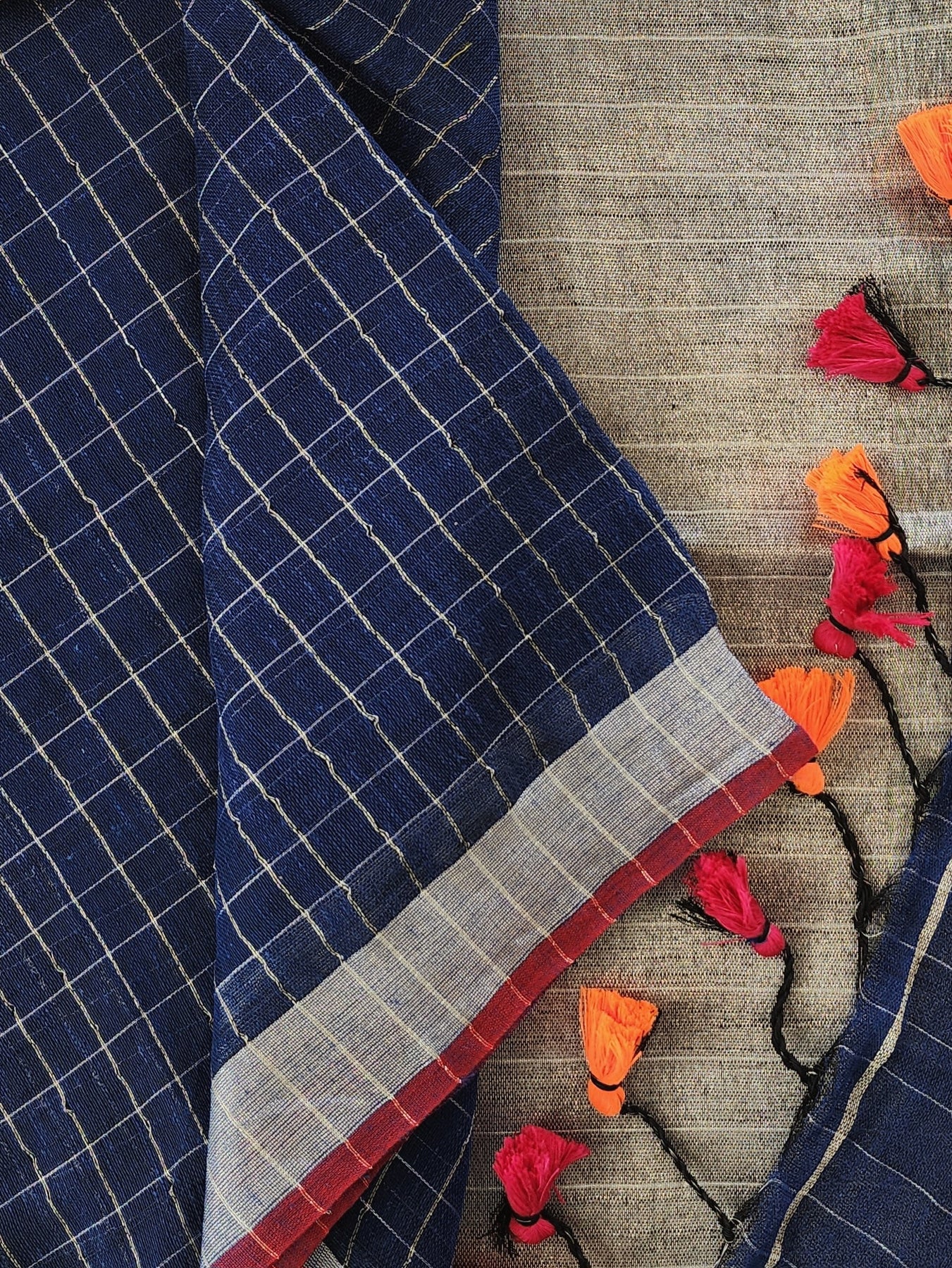 • Woven from pure linen and adorned with Borders, a checked body, and tassels, this handloom linen saree showcases ethnic elegance