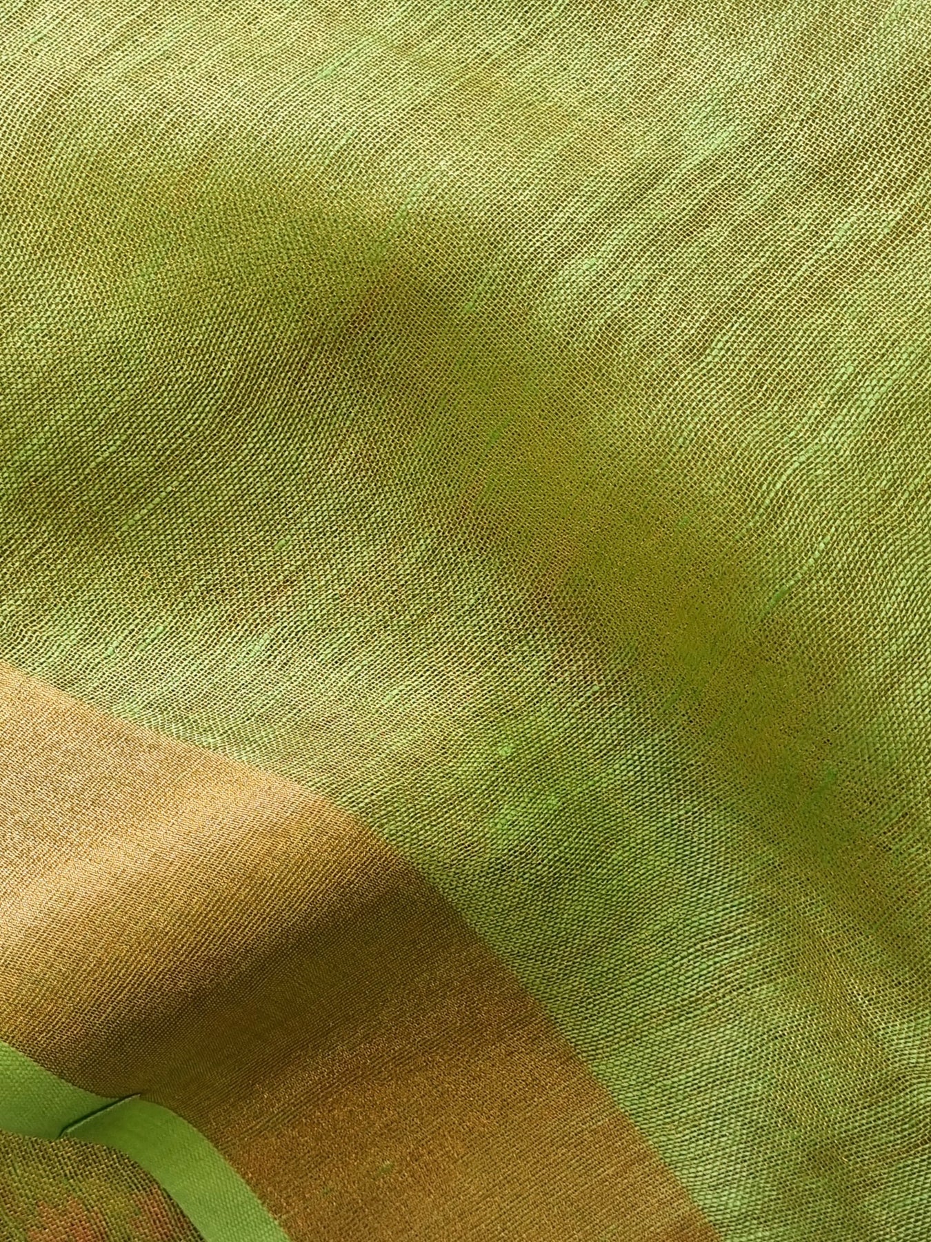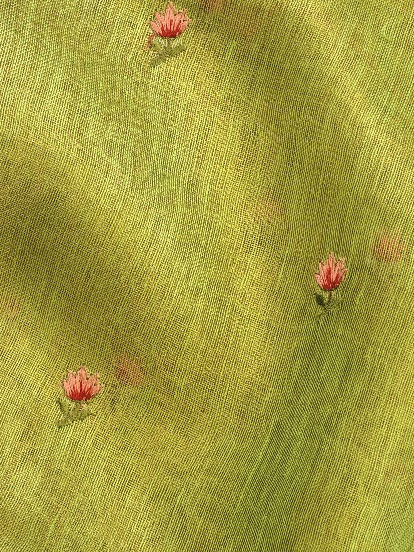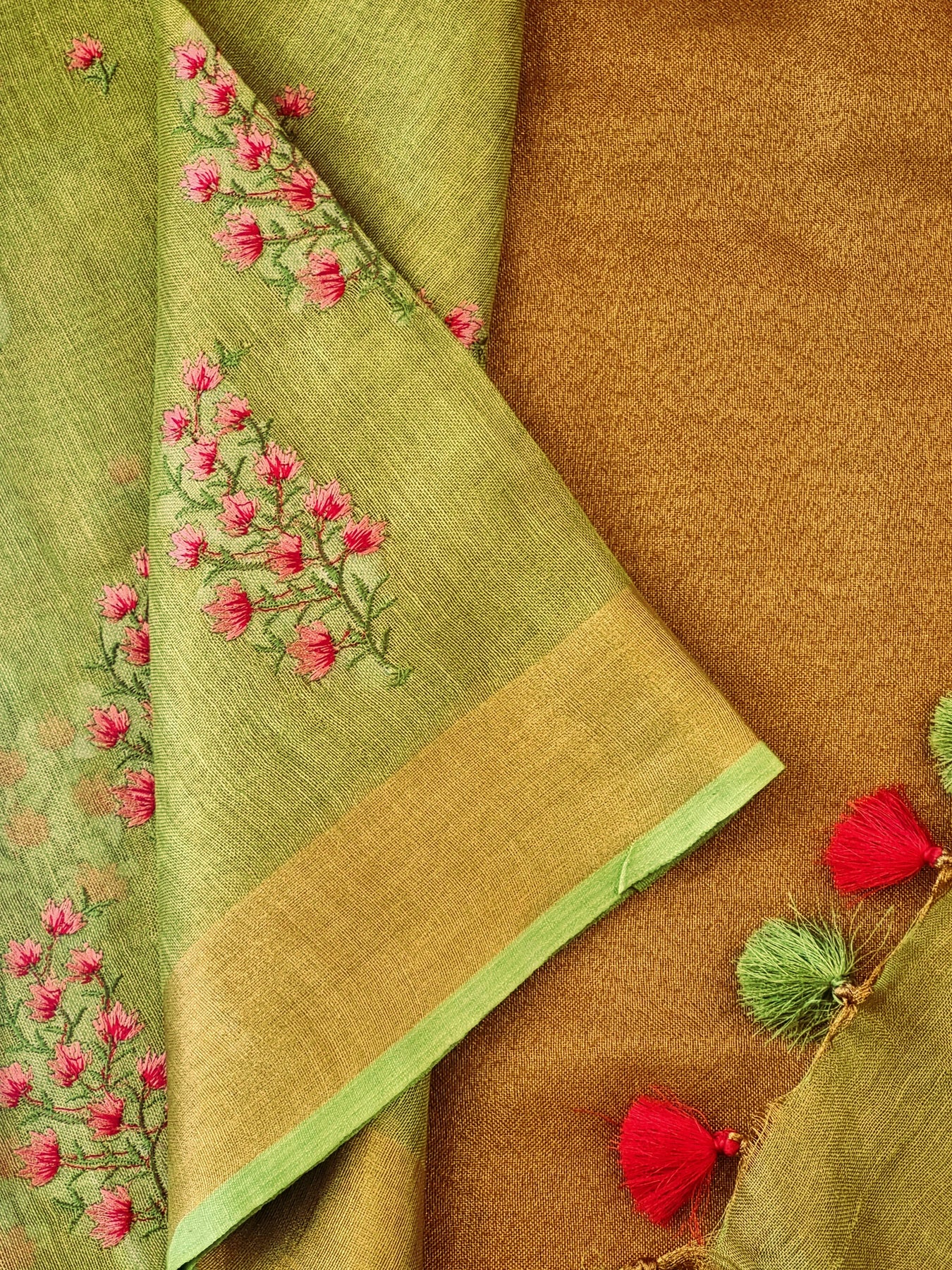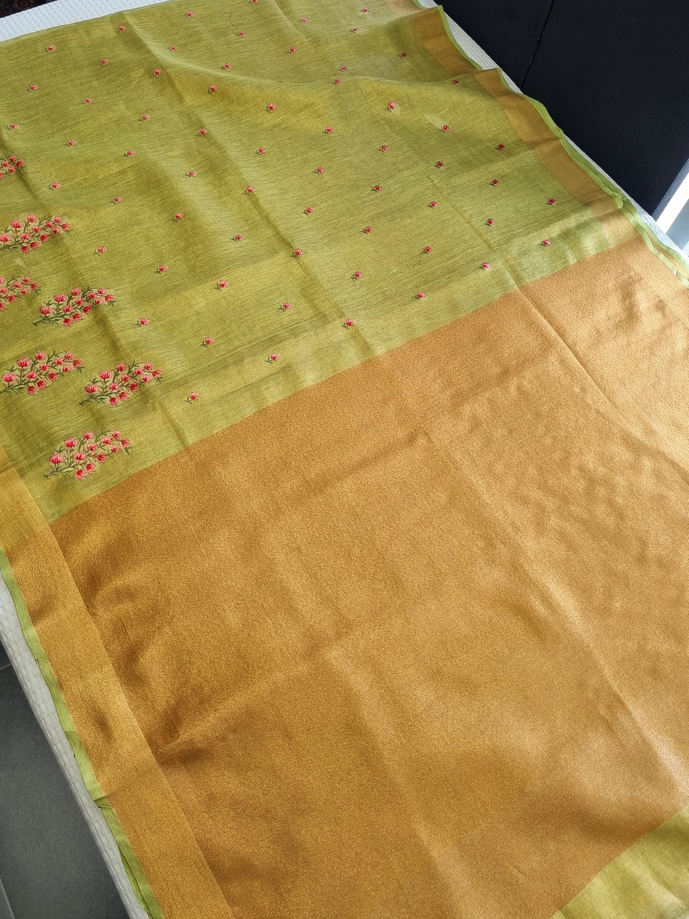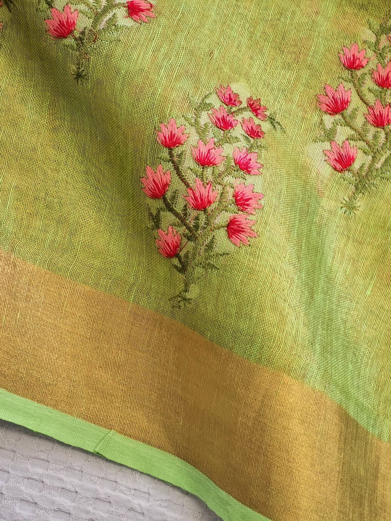 Masterly crafted floral embroidery, this Green tissue linen Saree has a modern appeal