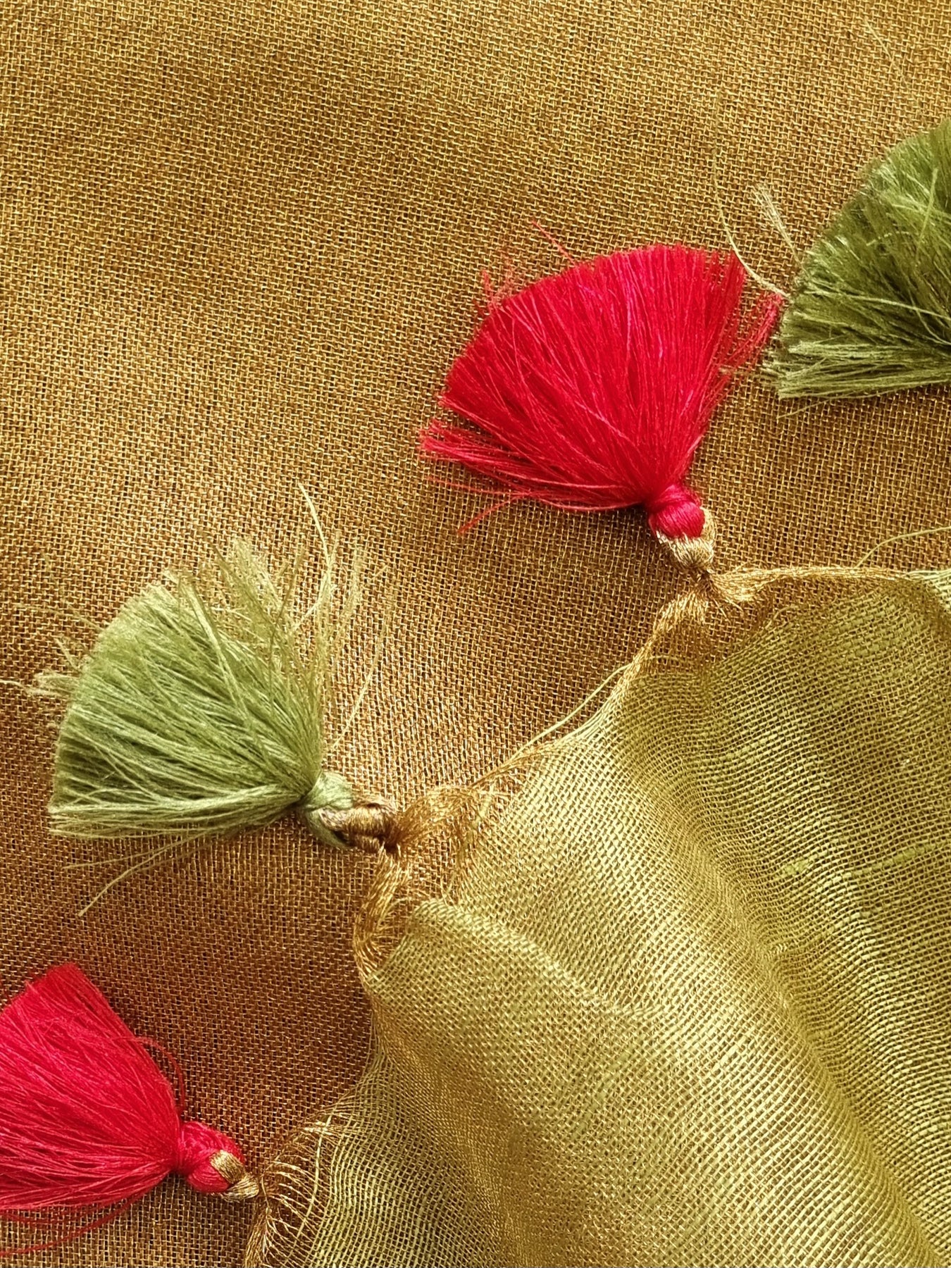Dual toned body with Gold Borders and a Rich Gold Pallu, beautifully finished with tassels