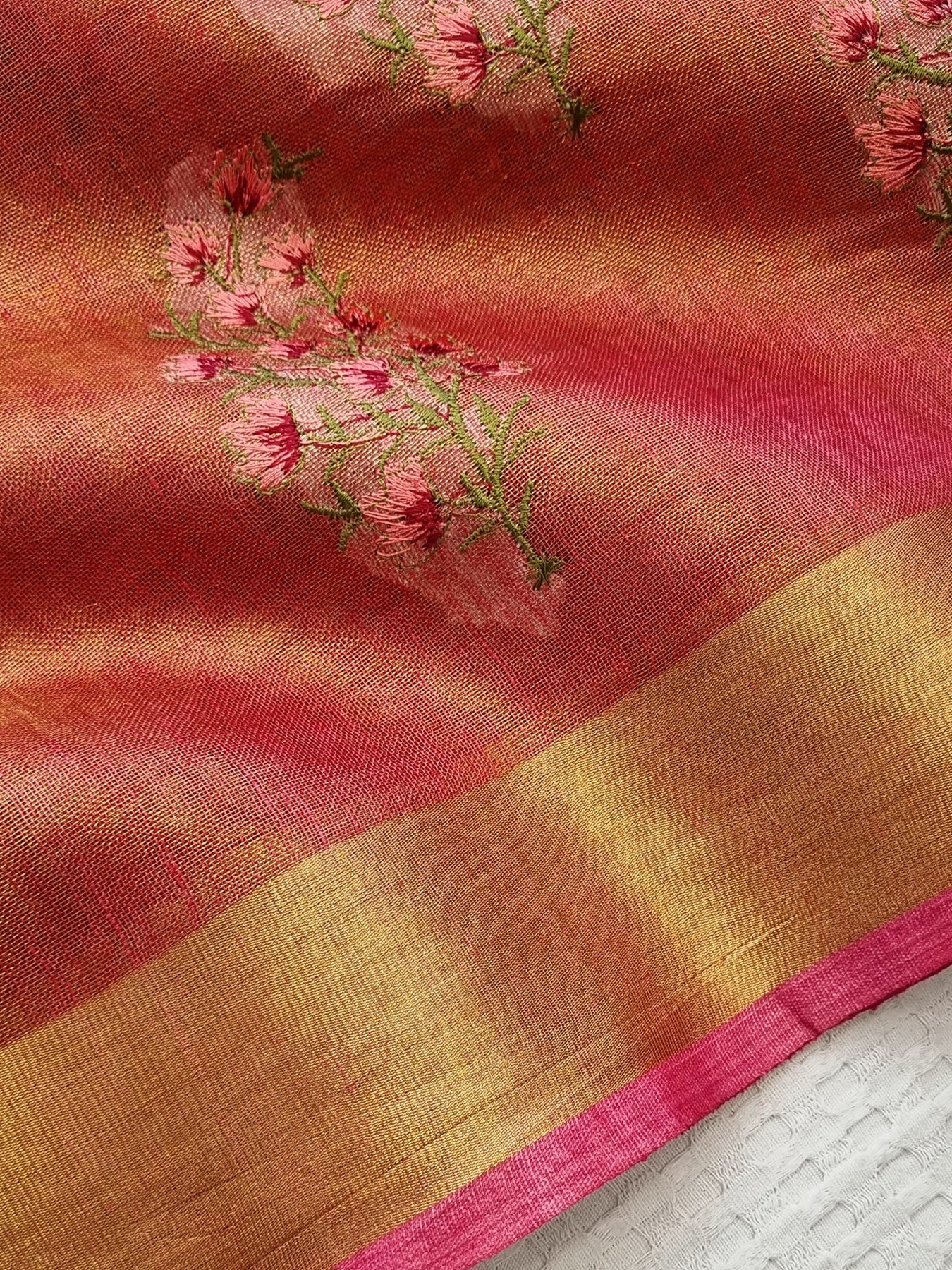 Masterly crafted floral embroidery, this Pink tissue linen Saree has a modern appeal
