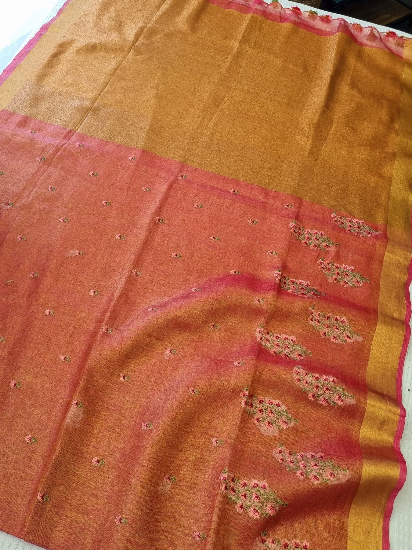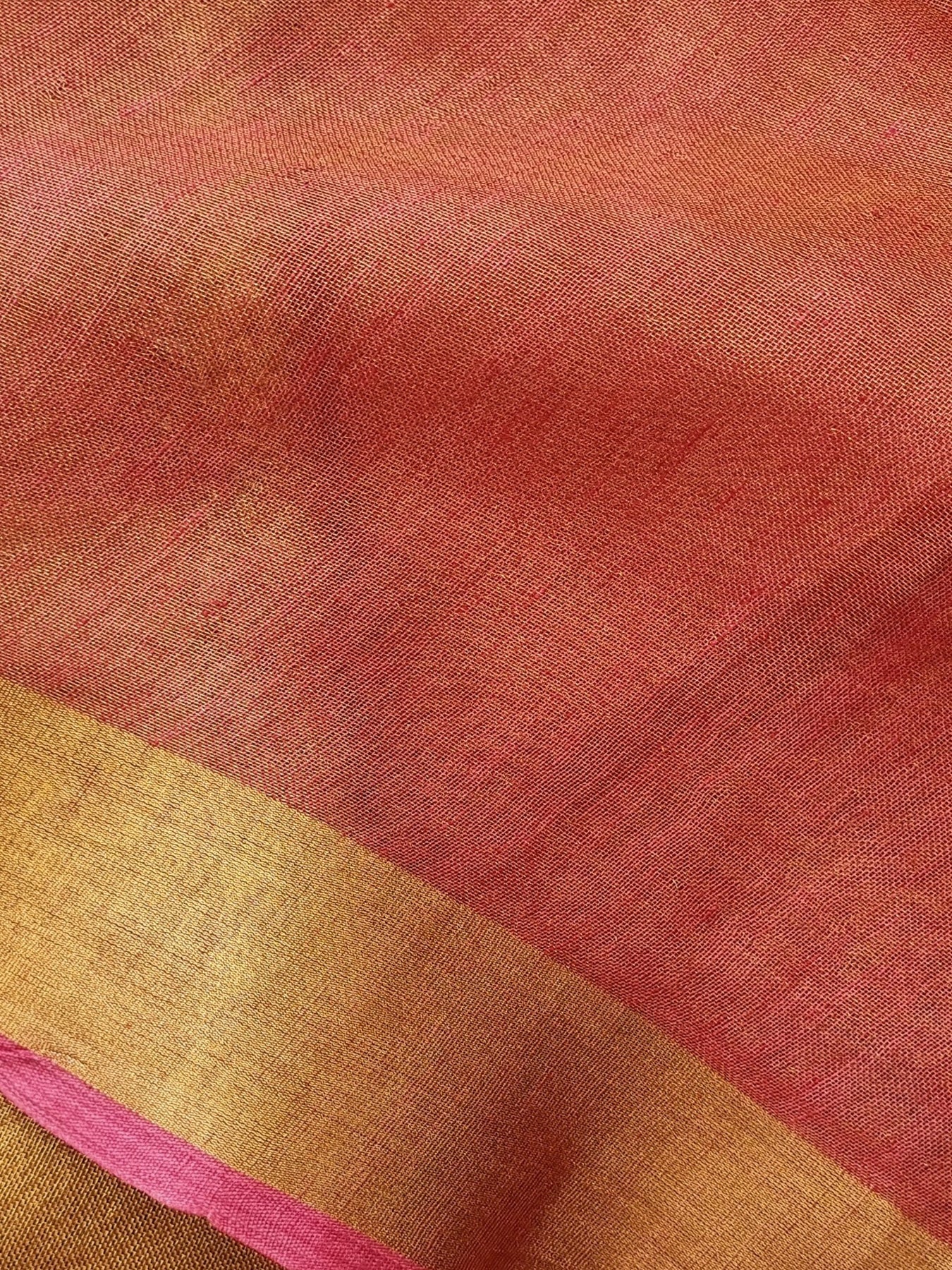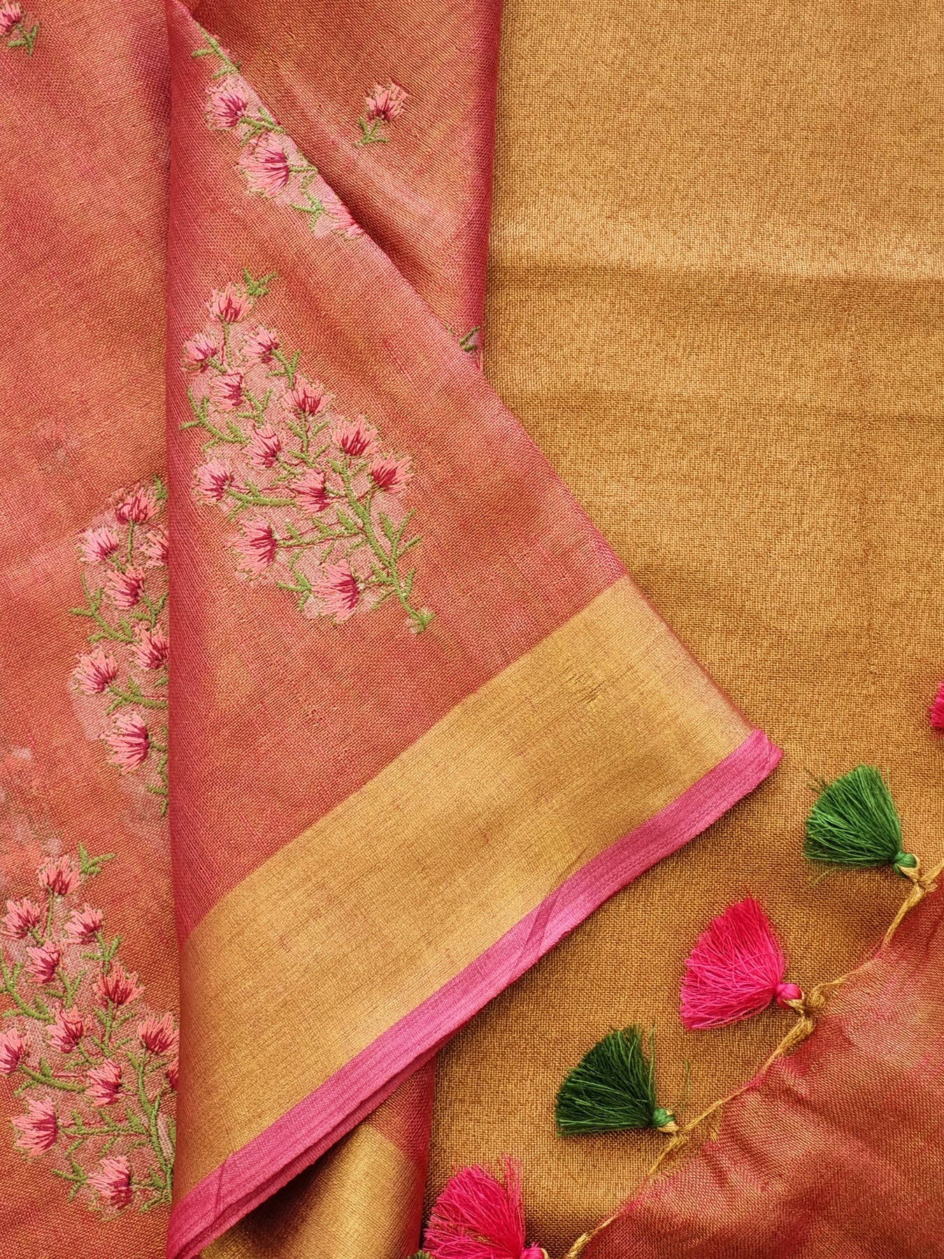 Dual toned body with Gold Borders and a Rich Gold Pallu, beautifully finished with tassels