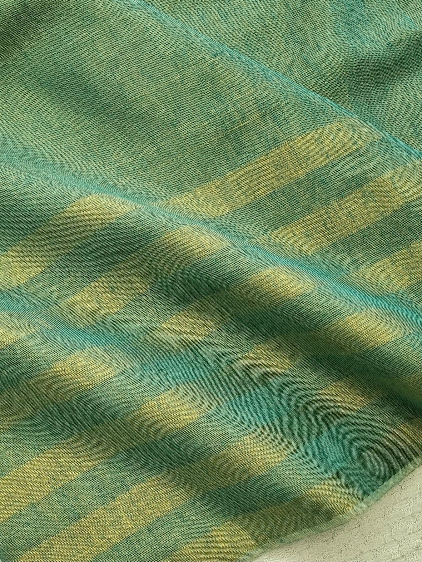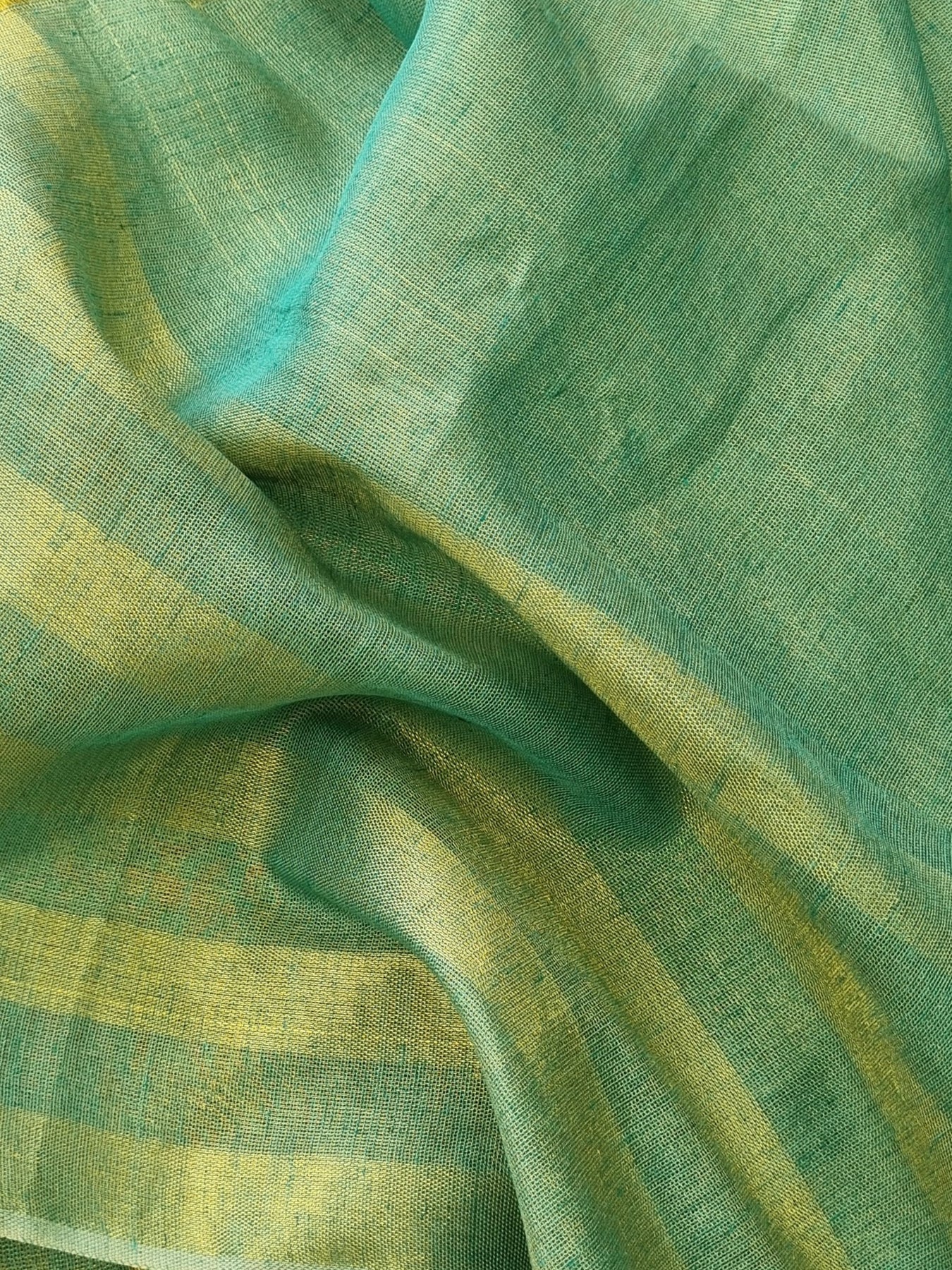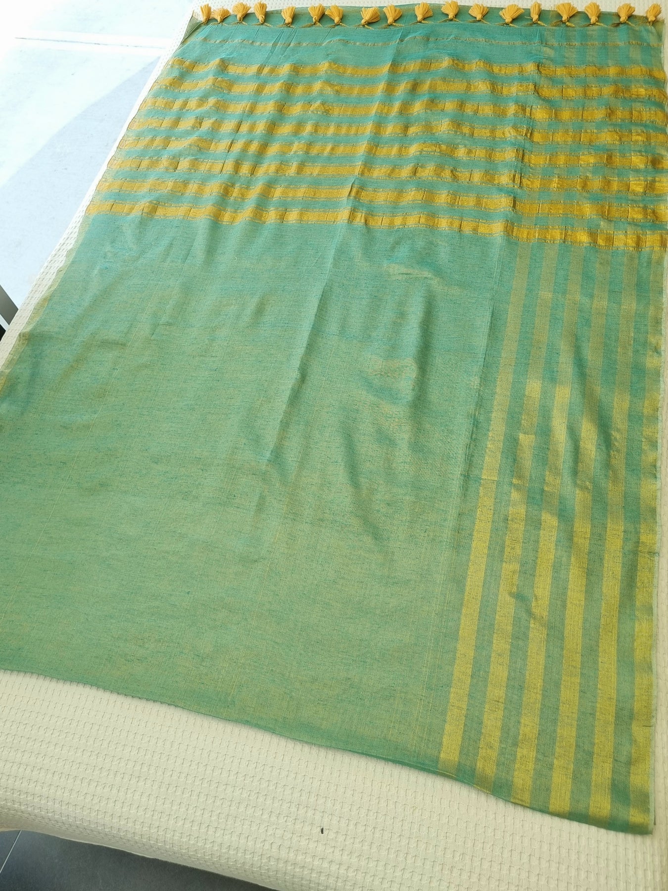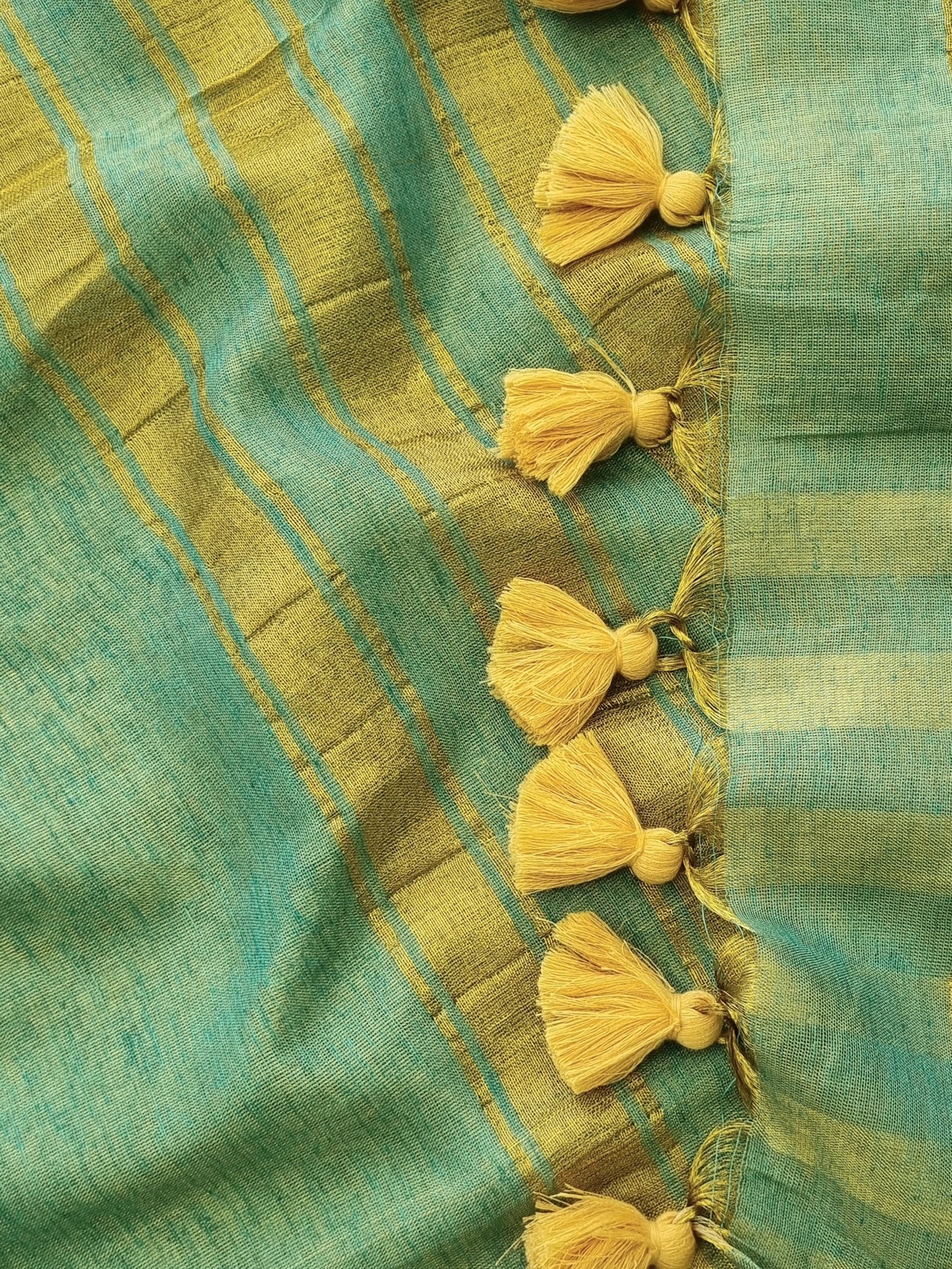 Woven from Tissue Linen with striped golden borders and pallu, adorned with tassels, this linen saree showcases ethnic elegance