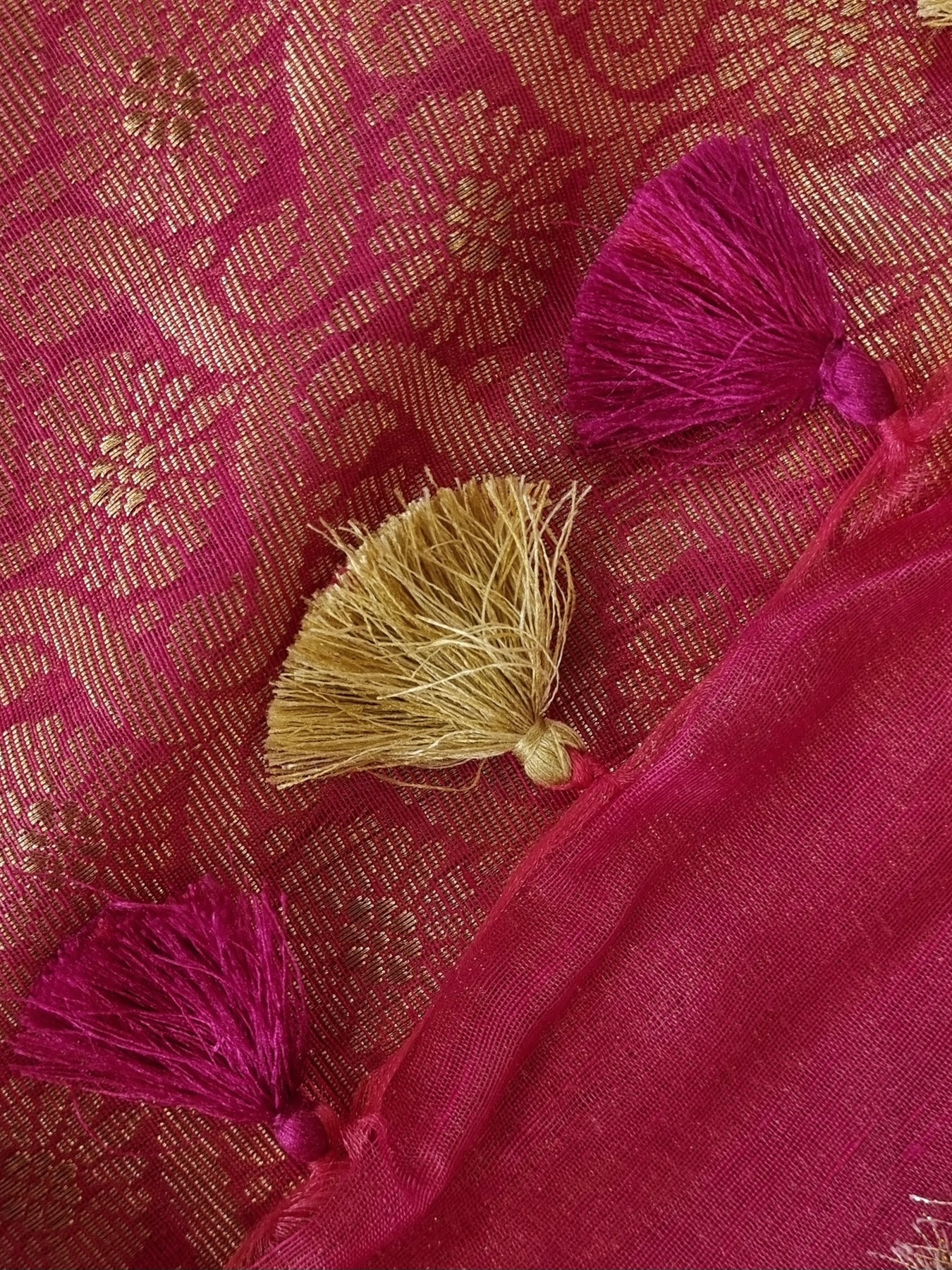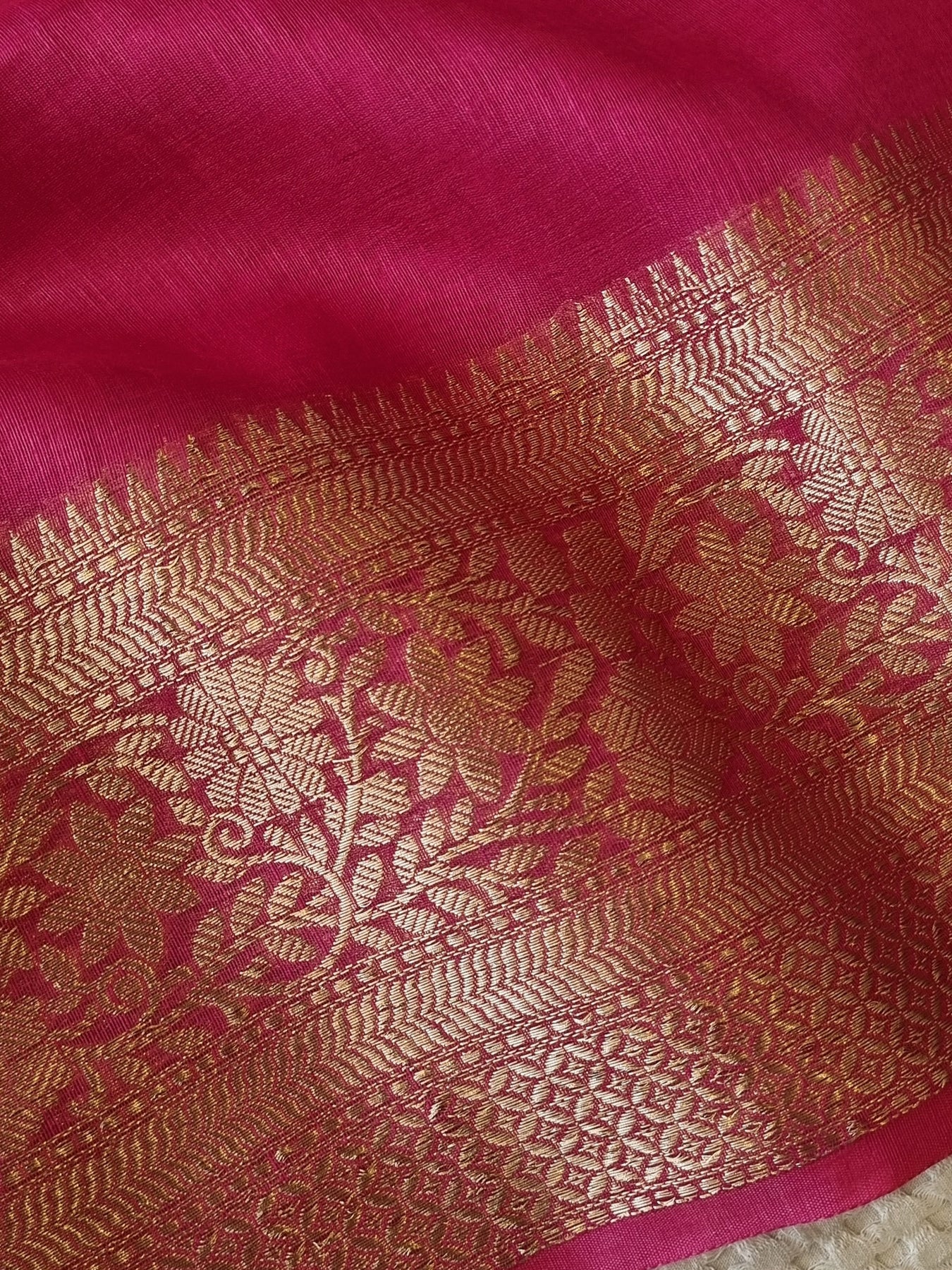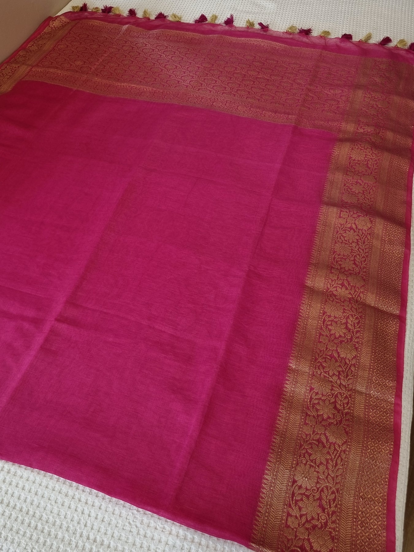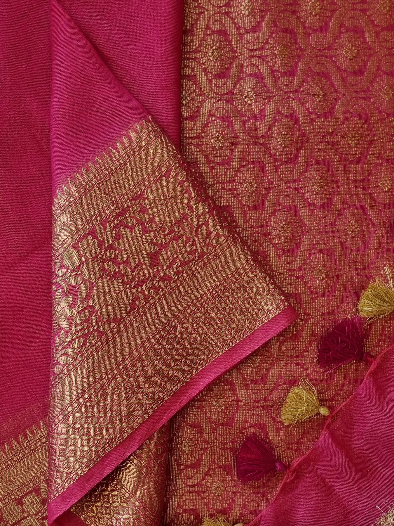 Handloom Pink Silk Linen Saree with Banarassi borders and Pallu