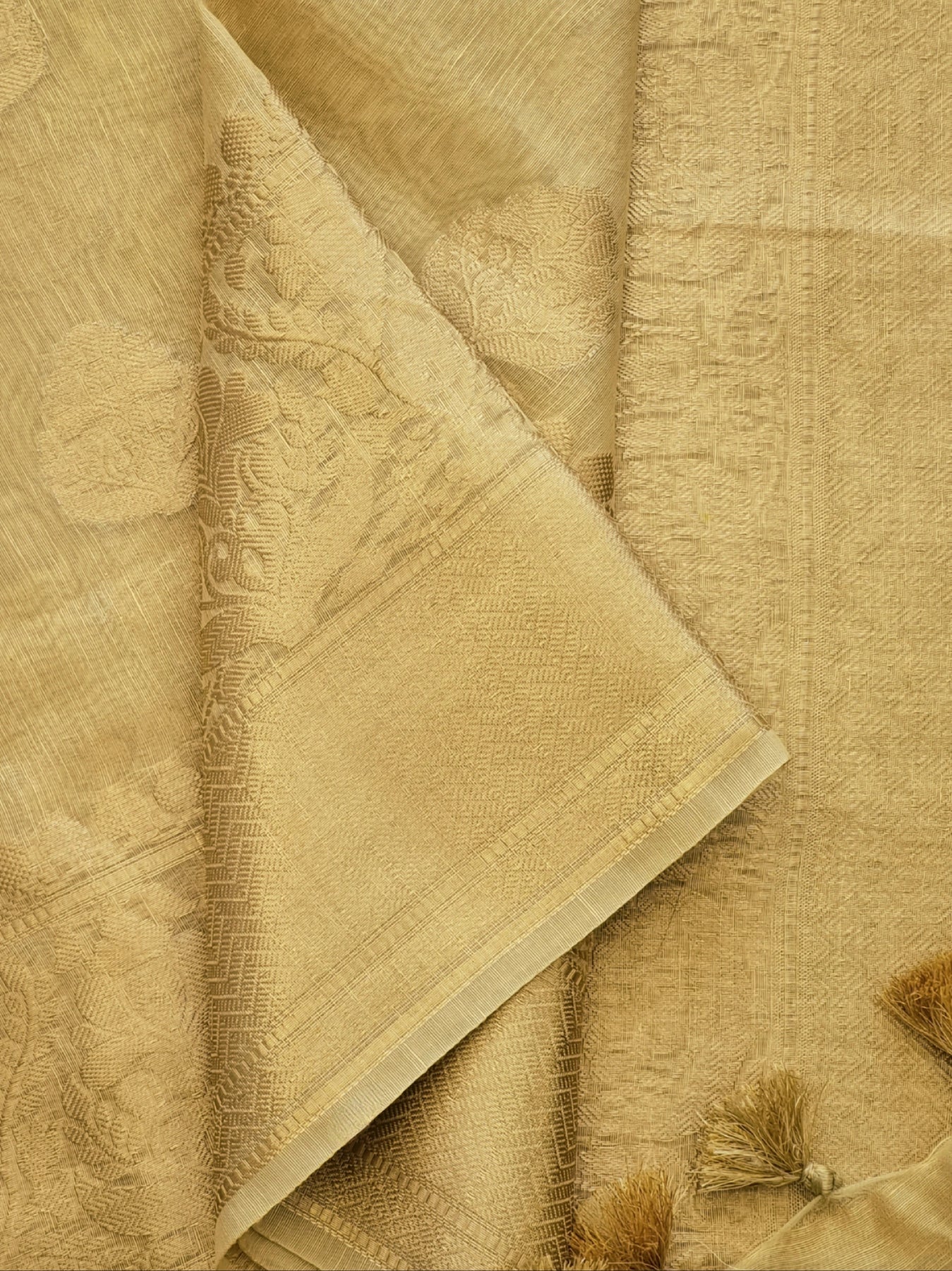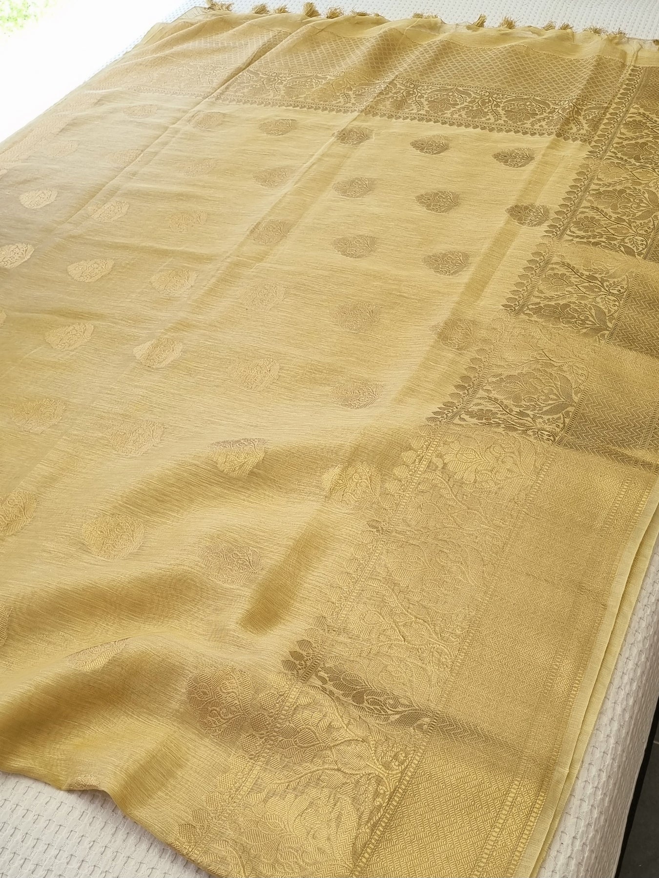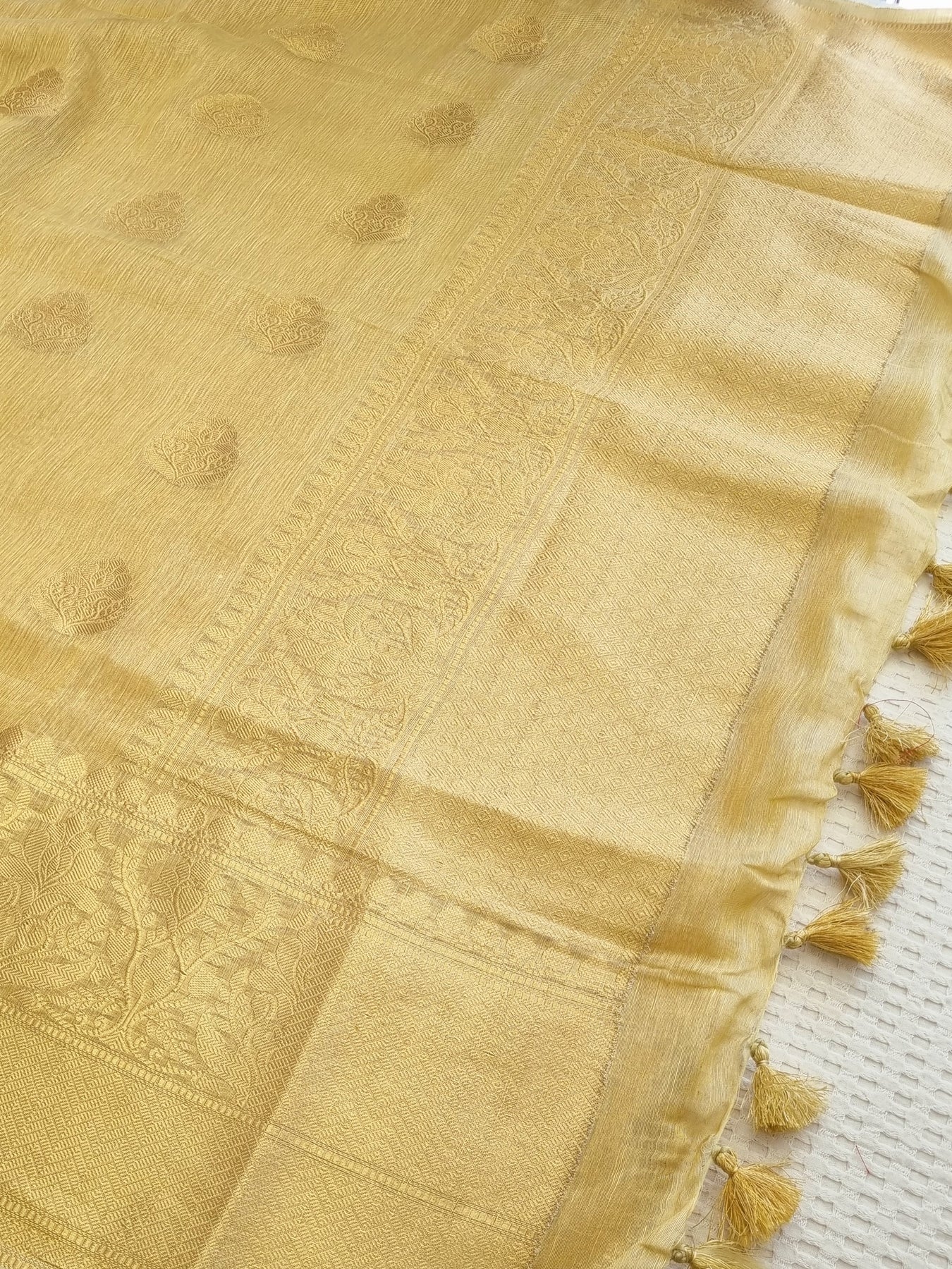 • Handloom Gold Silk Linen Saree with Banarasi borders and Pallu