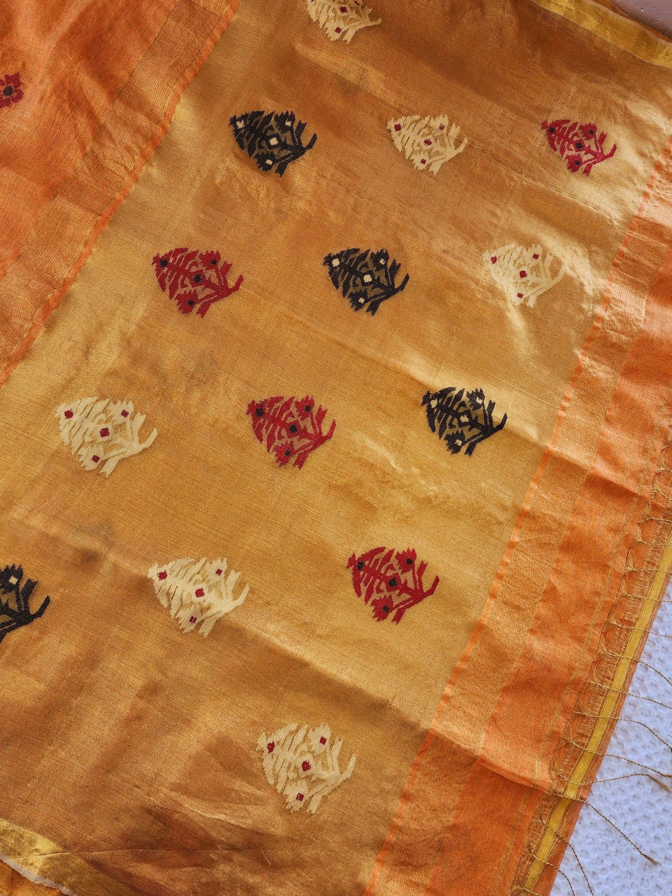 Woven from pure linen and tissue and adorned with contrastly embroidered motifs, this elegant linen saree is a great addition to your ethnic wardrobe