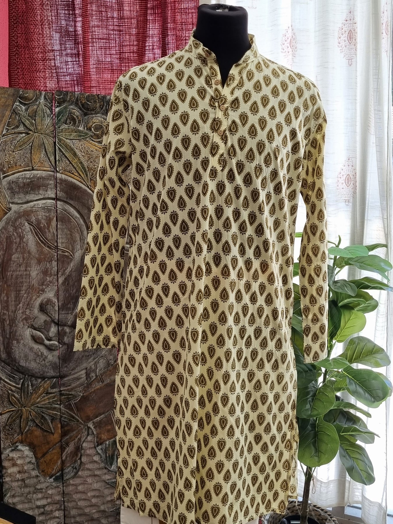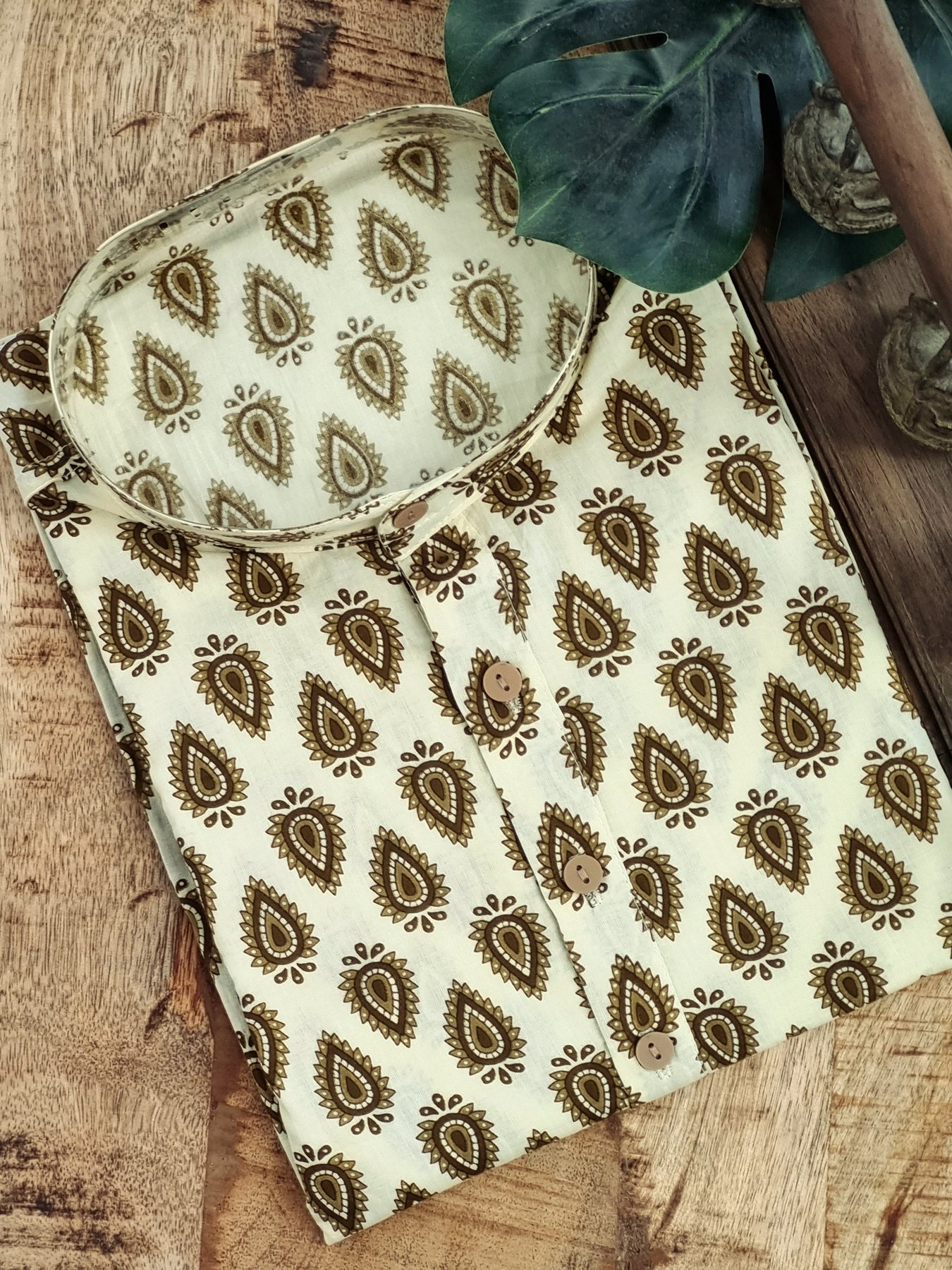 Mandarin Collar Long Cotton Kurta with Block Prints