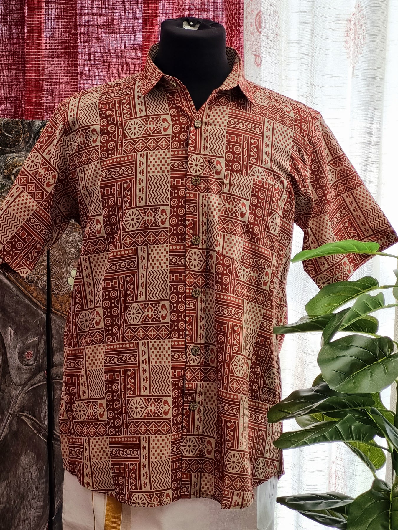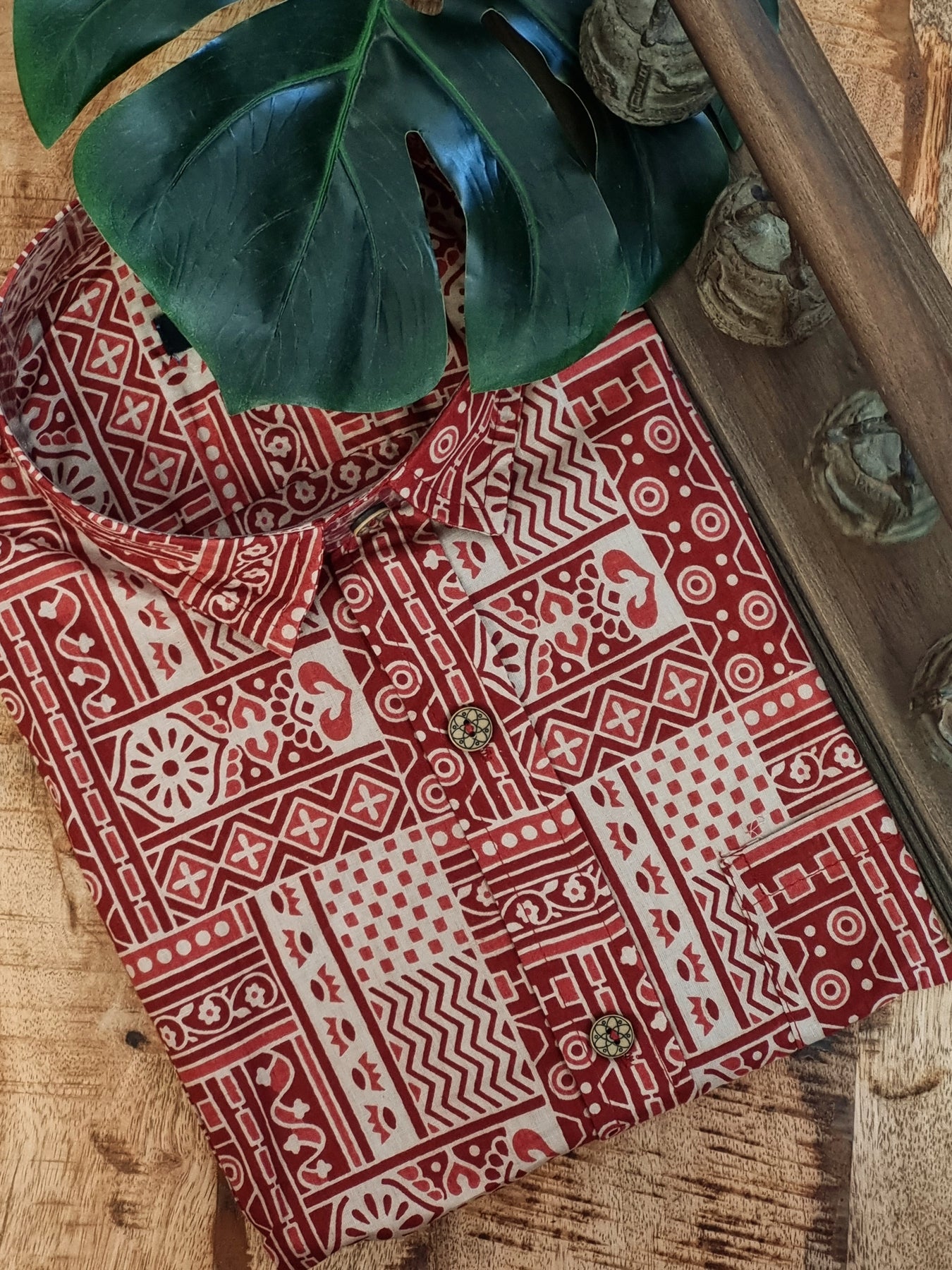 White Cotton Shirt with Maroon & Red Geomtric Block Prints