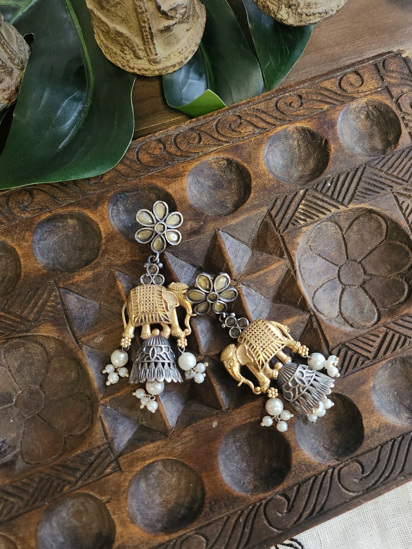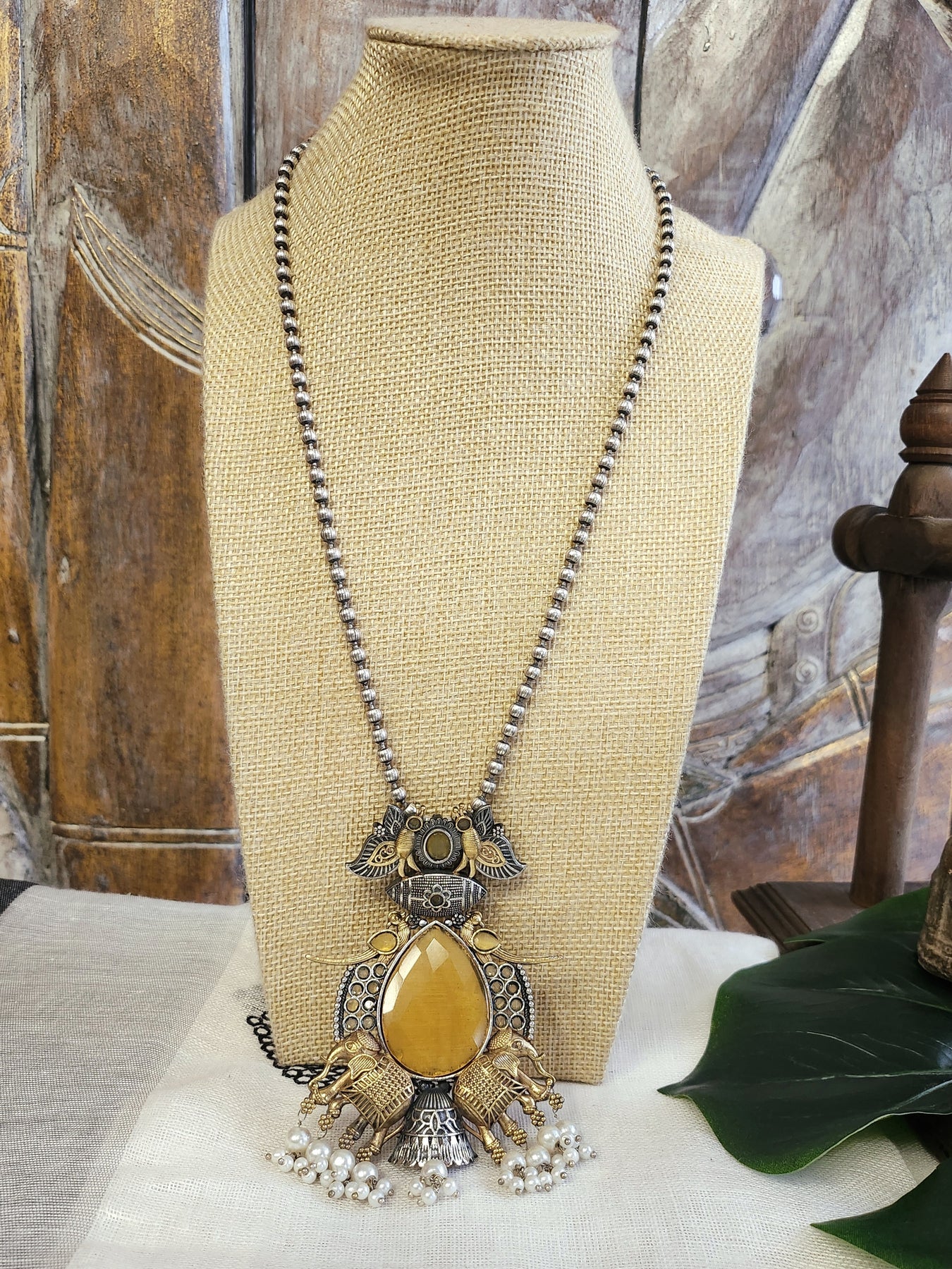 Dual Tone German Silver necklace with yellow stones and pearls paired with Earrings