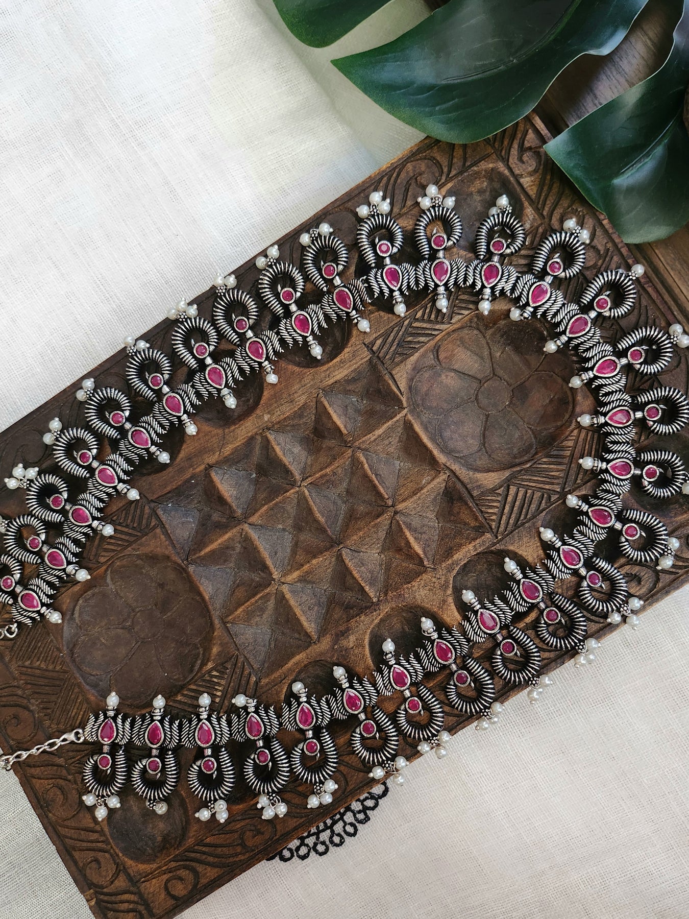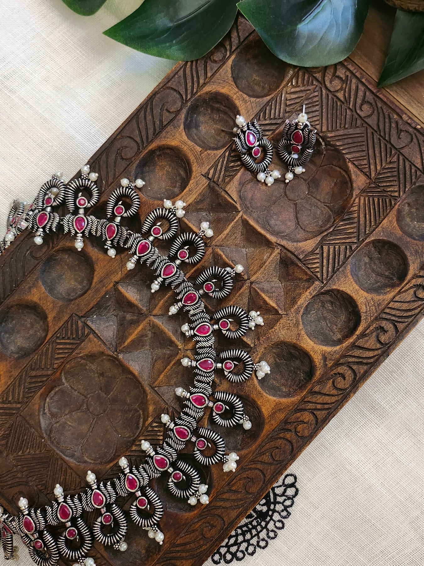 Oxidised Silver Stone Necklace with rani pink stones and pearls paired with matching Earrings