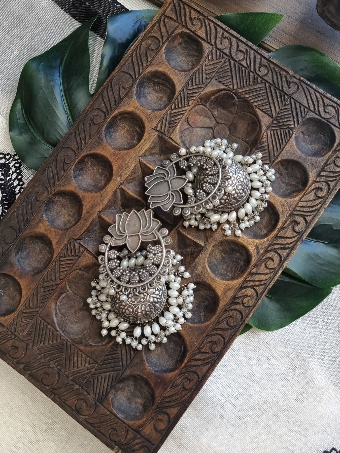 Premium Quality German Silver Jhumkas ornated with Pearls