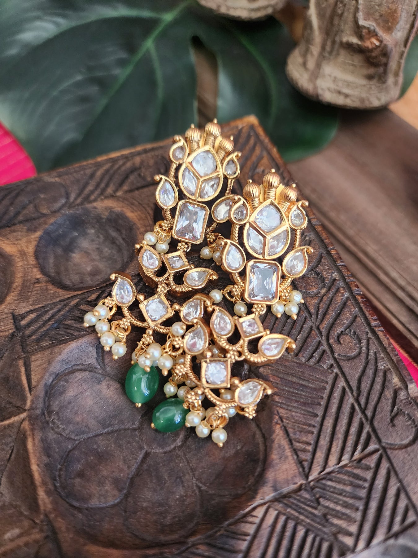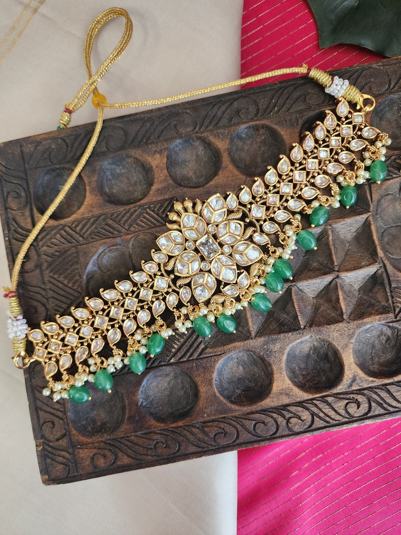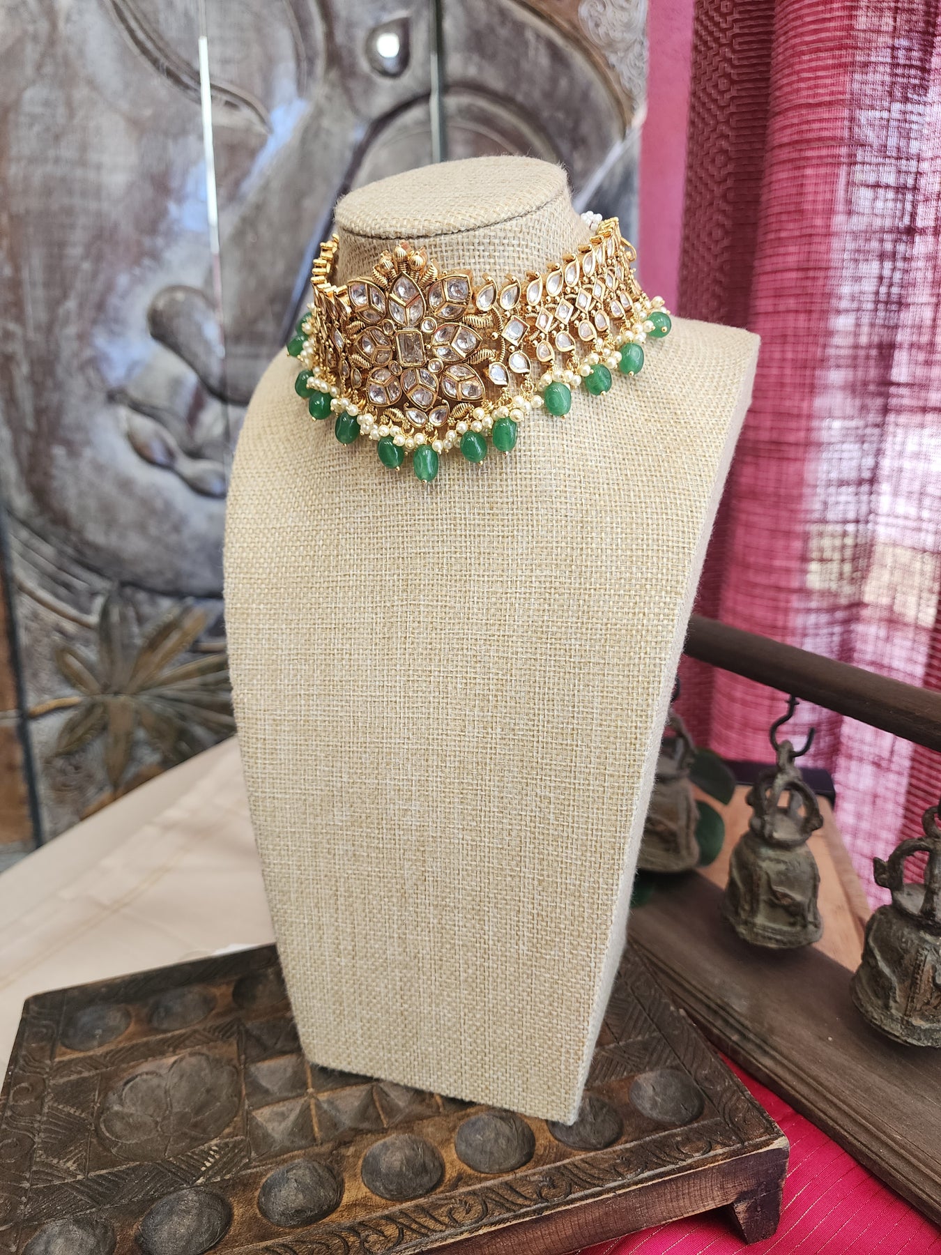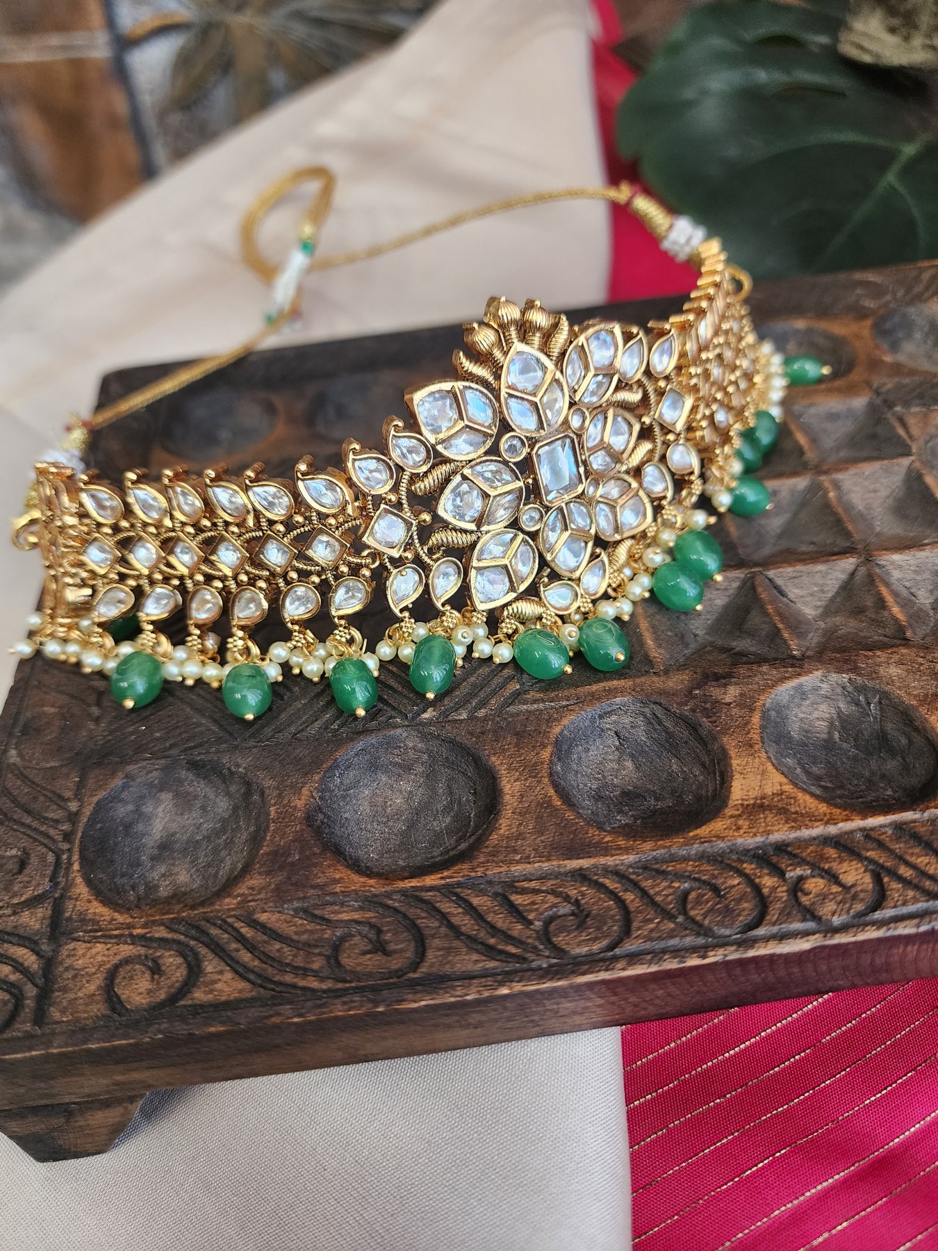 This is a beautiful set comprising of a choker necklace ornated with Real Kundan Stones, and paired with earrings