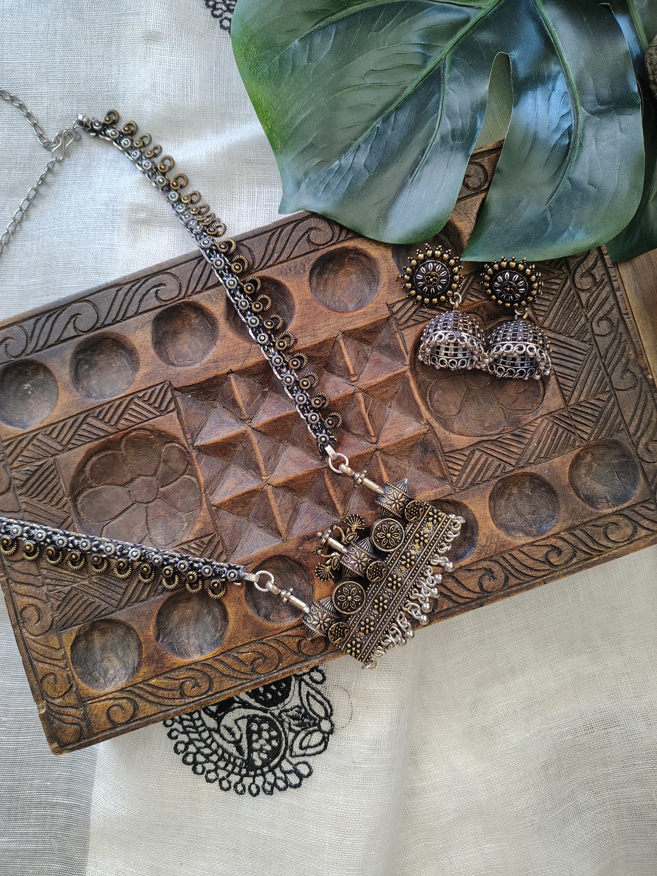 Oxidized Silver Necklace paired with matching Jhumkas