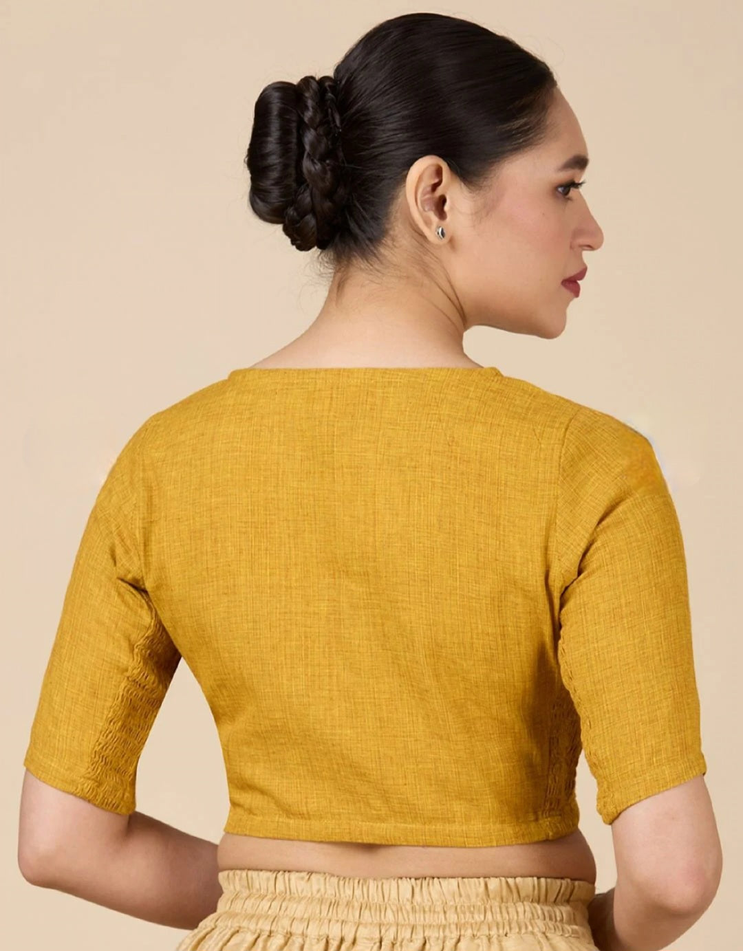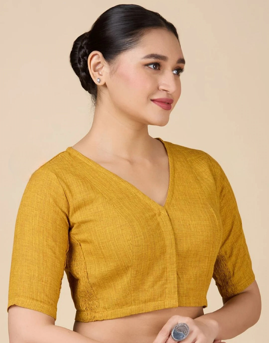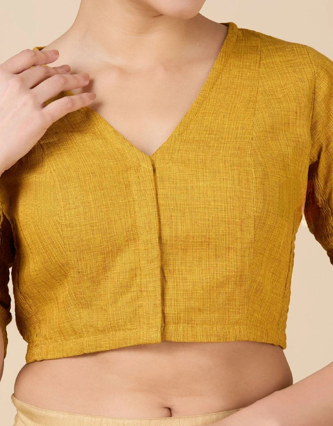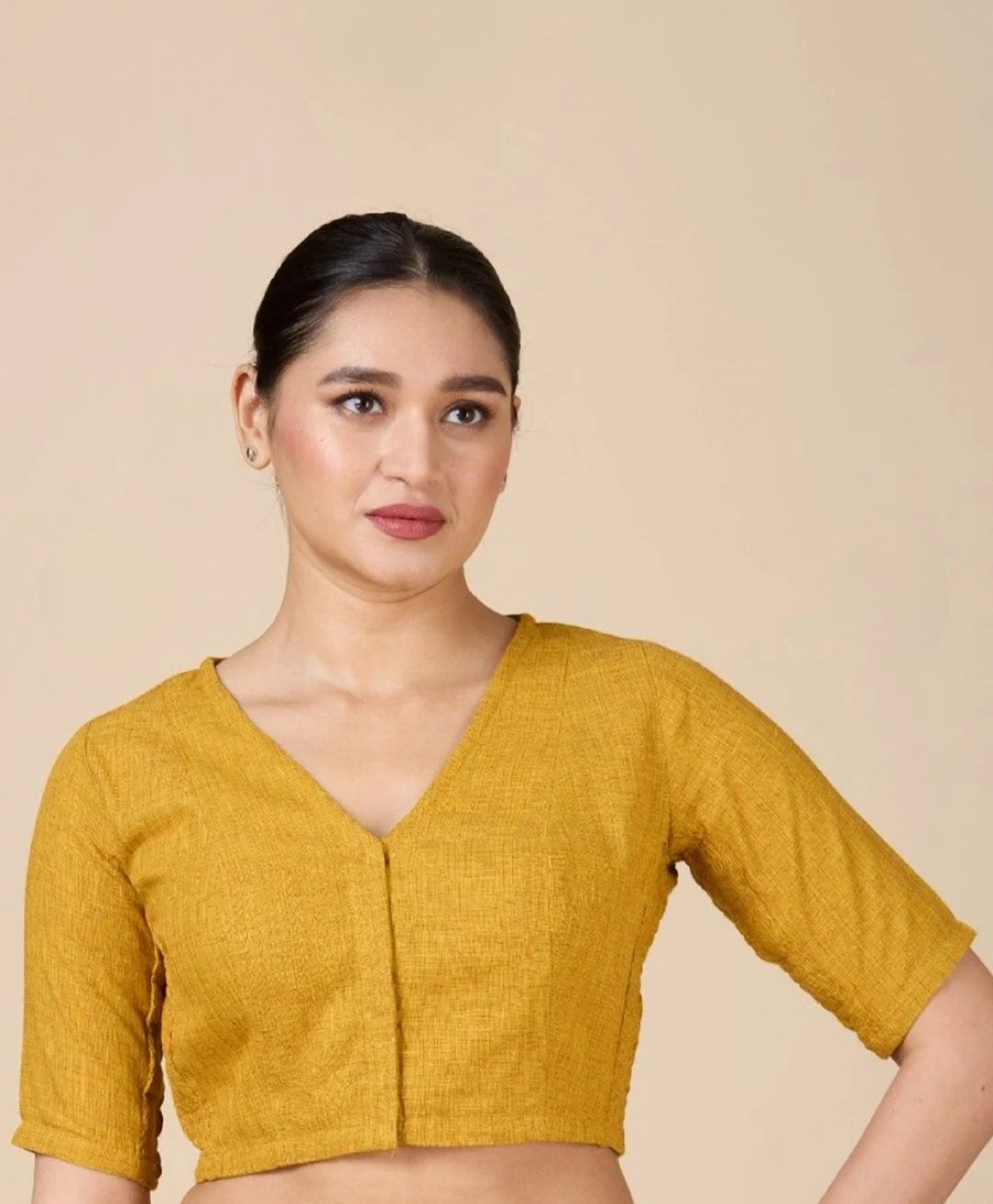 Mustard Yellow V-Neck Stretchable Blouse with Elbow Length Sleeves