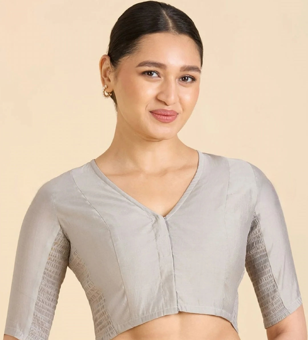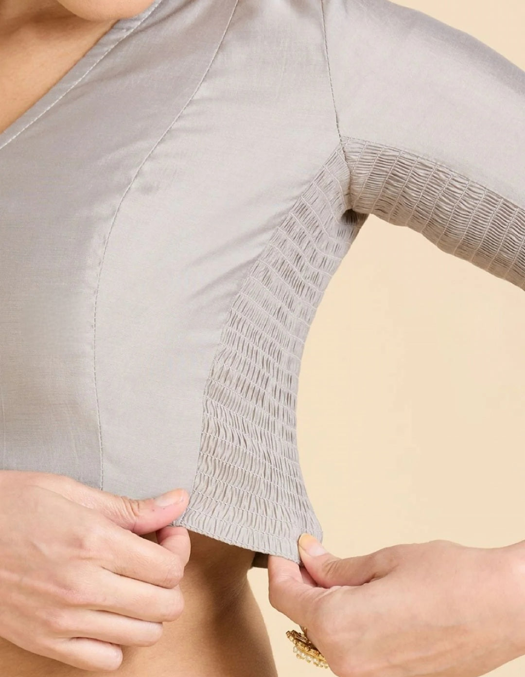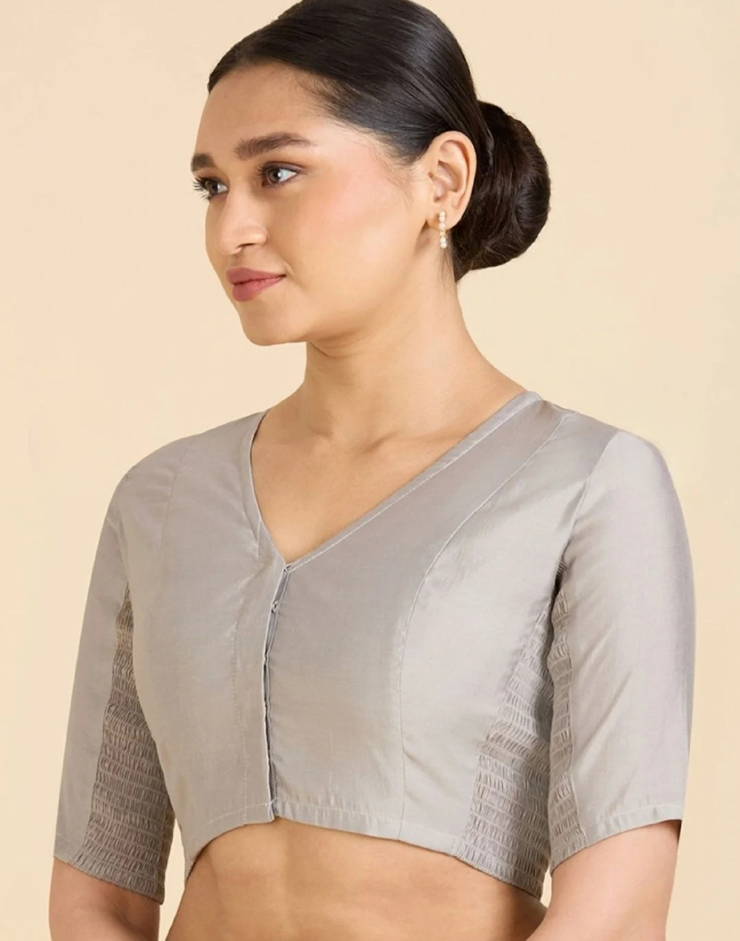 Grey V-Neck Stretchable Blouse with Elbow Length Sleeves