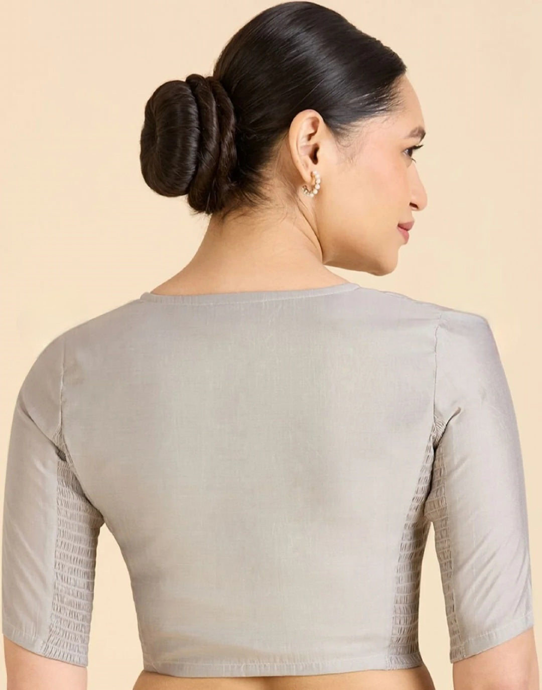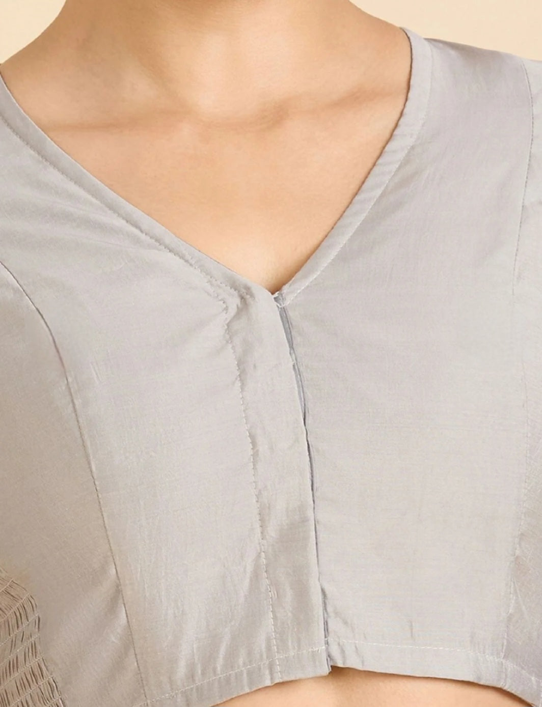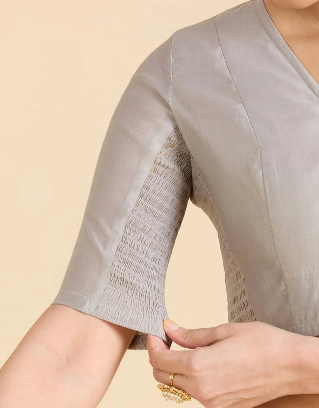 Grey V-Neck Stretchable Blouse with Elbow Length Sleeves