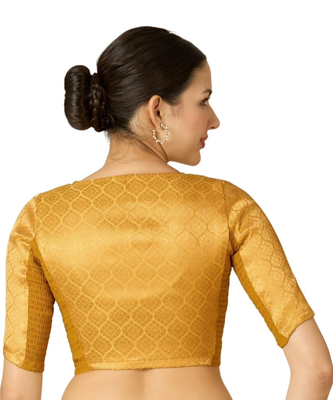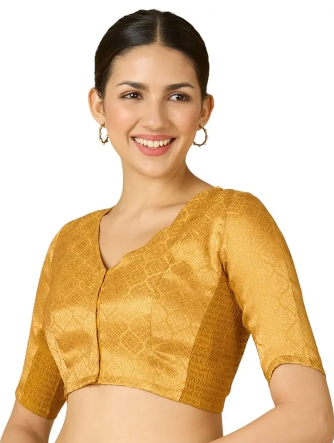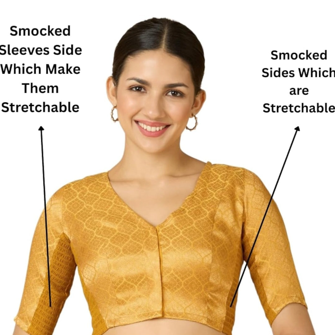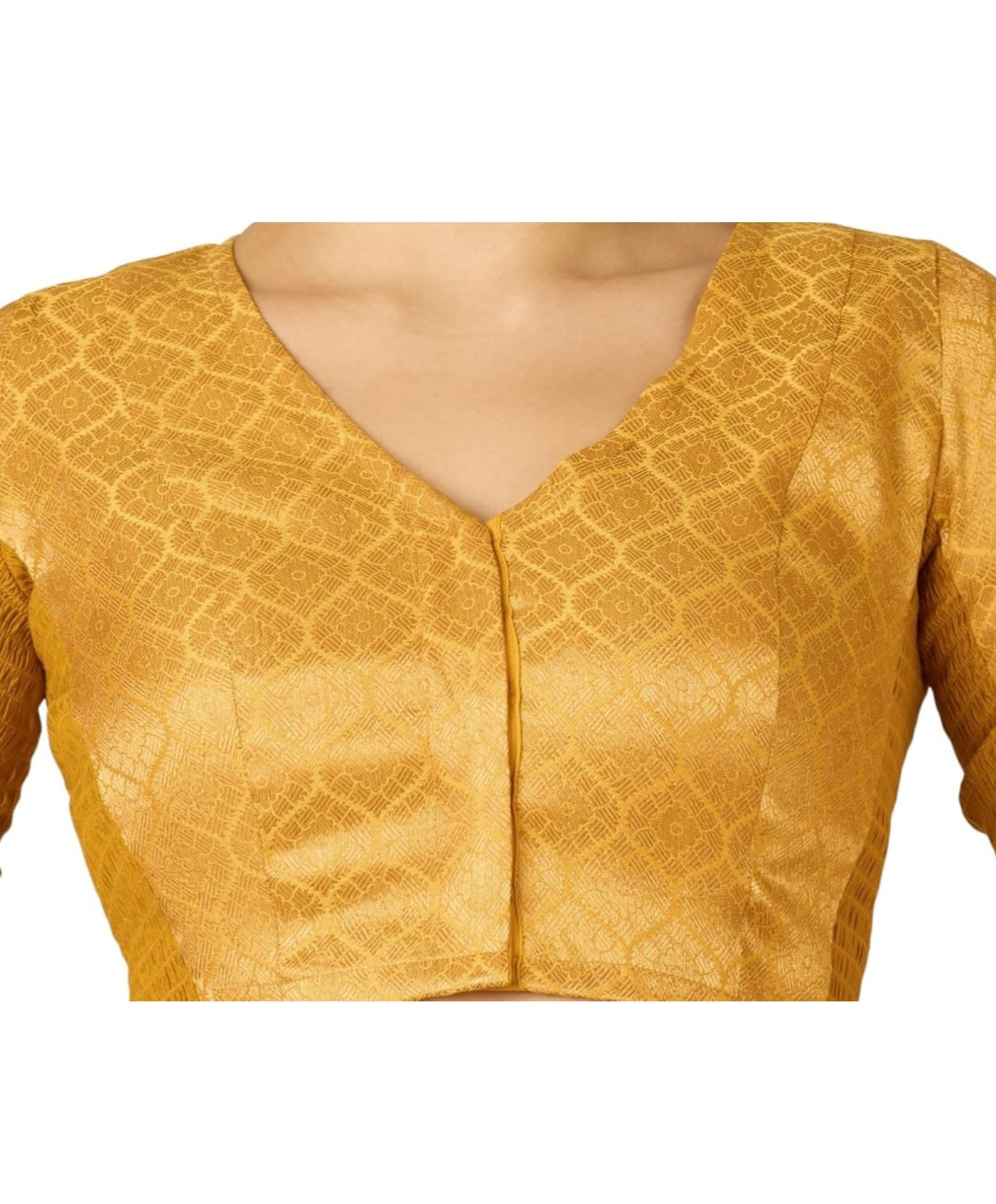 Gold Brocade V-Neck Stretchable Blouse with Elbow Length Sleeves