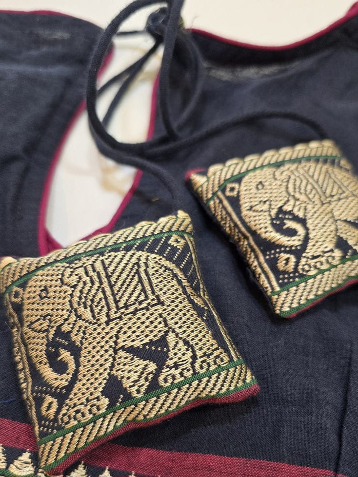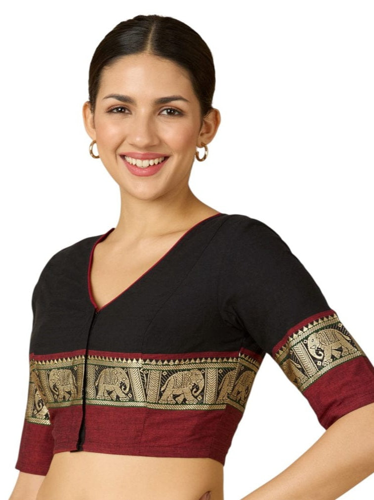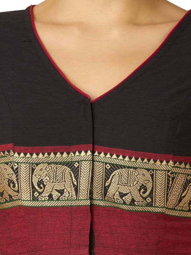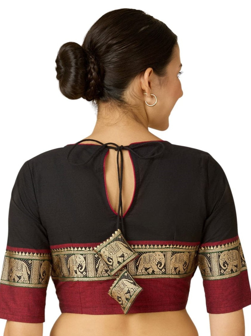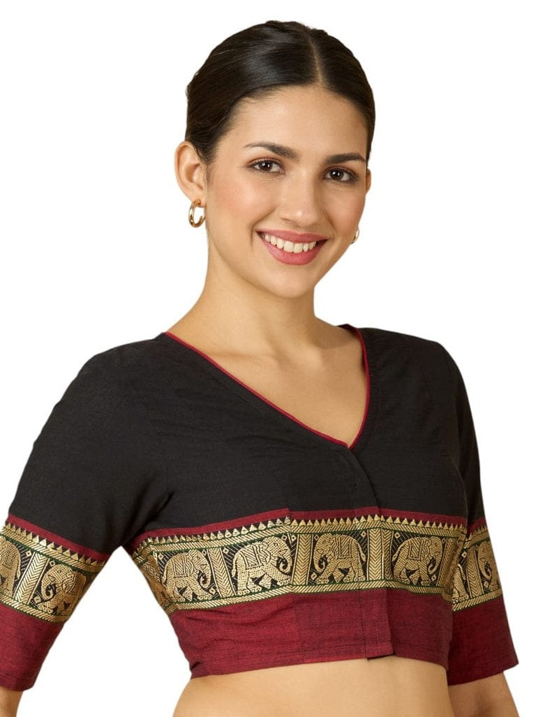 Black Woven Pure Cotton Blouse with Woven Elephant & Temple Motifs along the borders