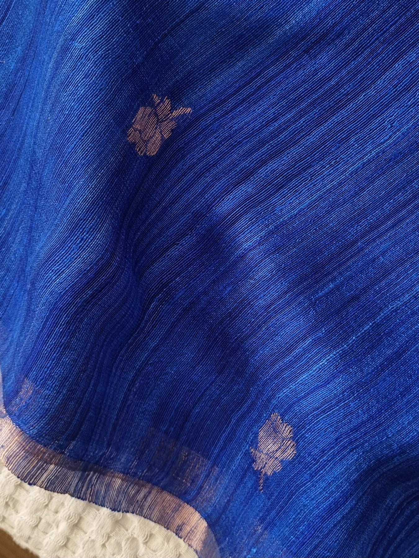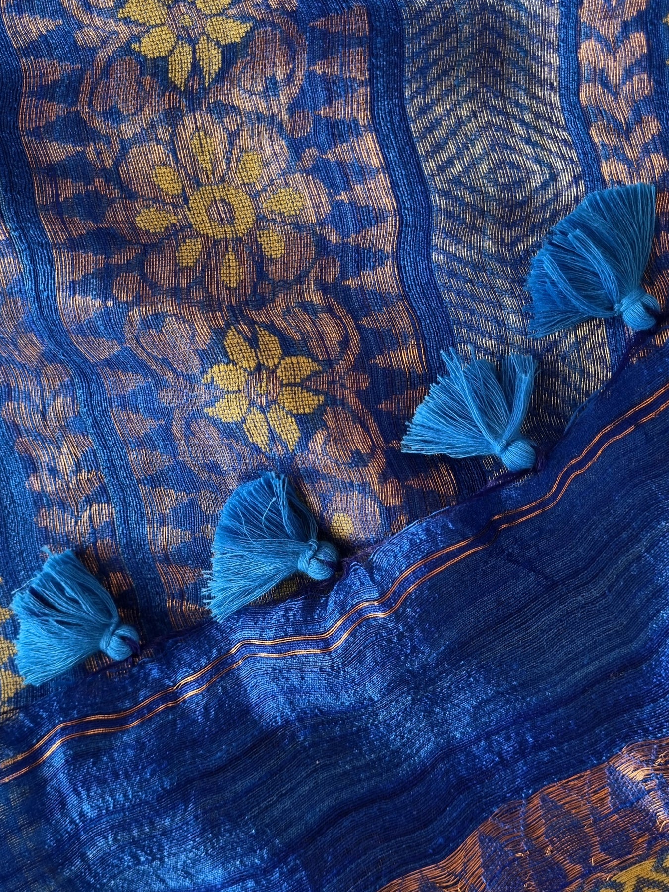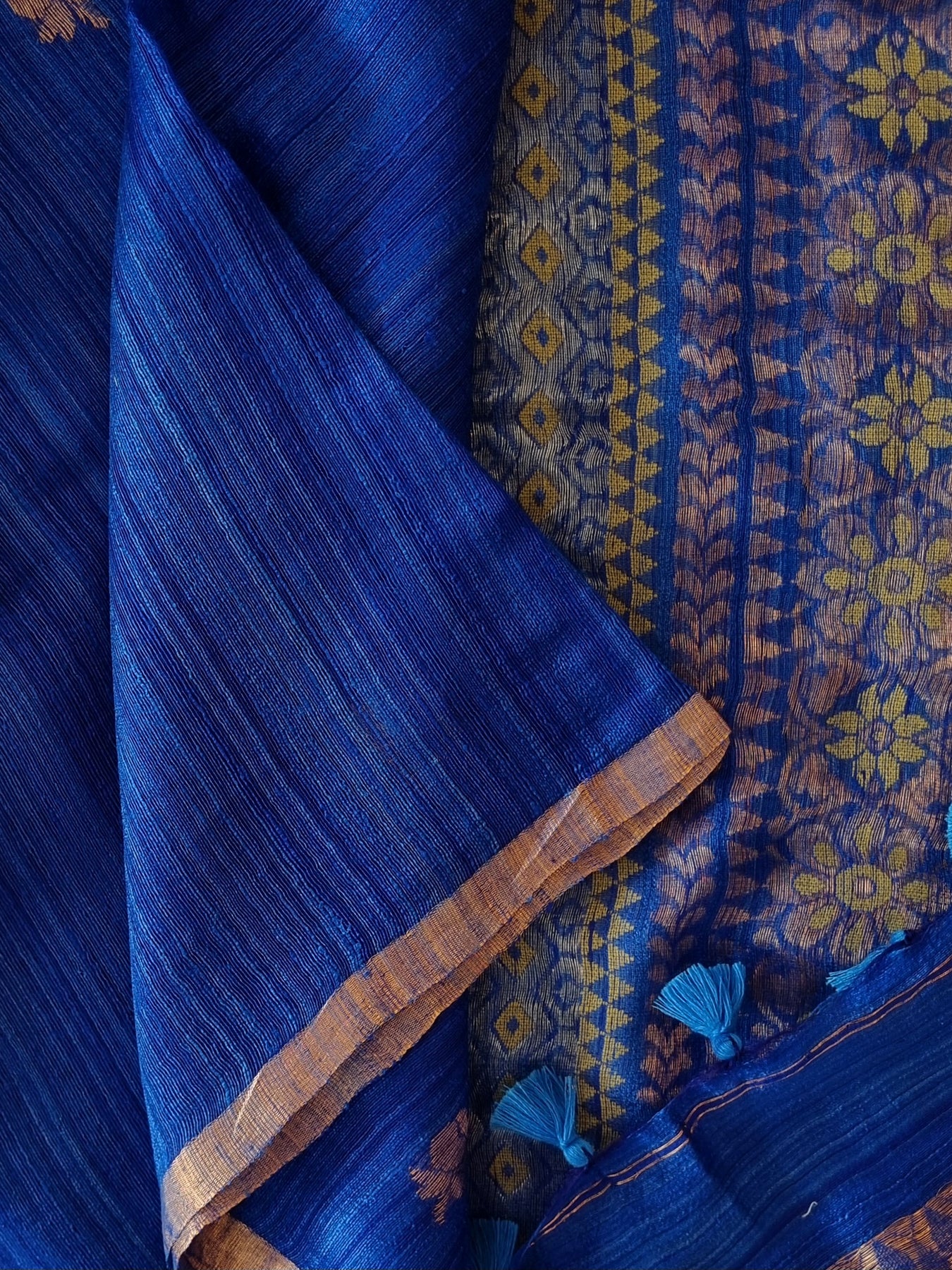 An elegant Cobalt Blue Pure Matka Silk Saree with a pallu, beautifully finished with tassels