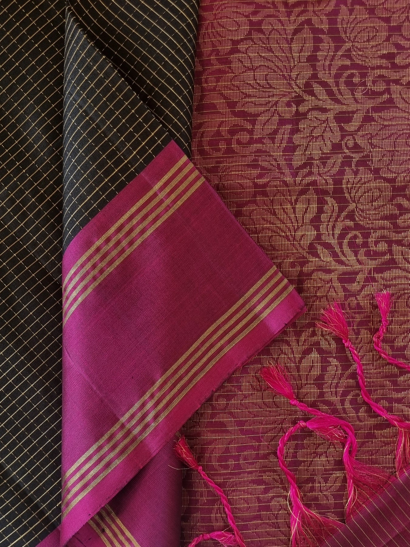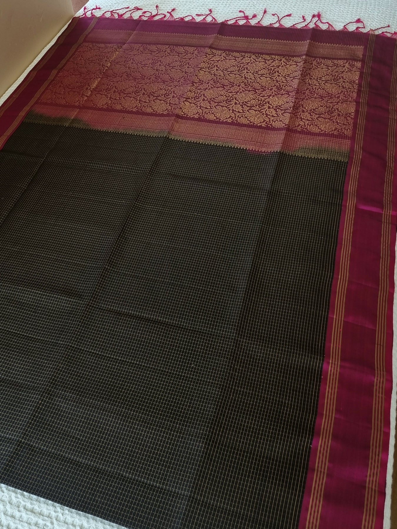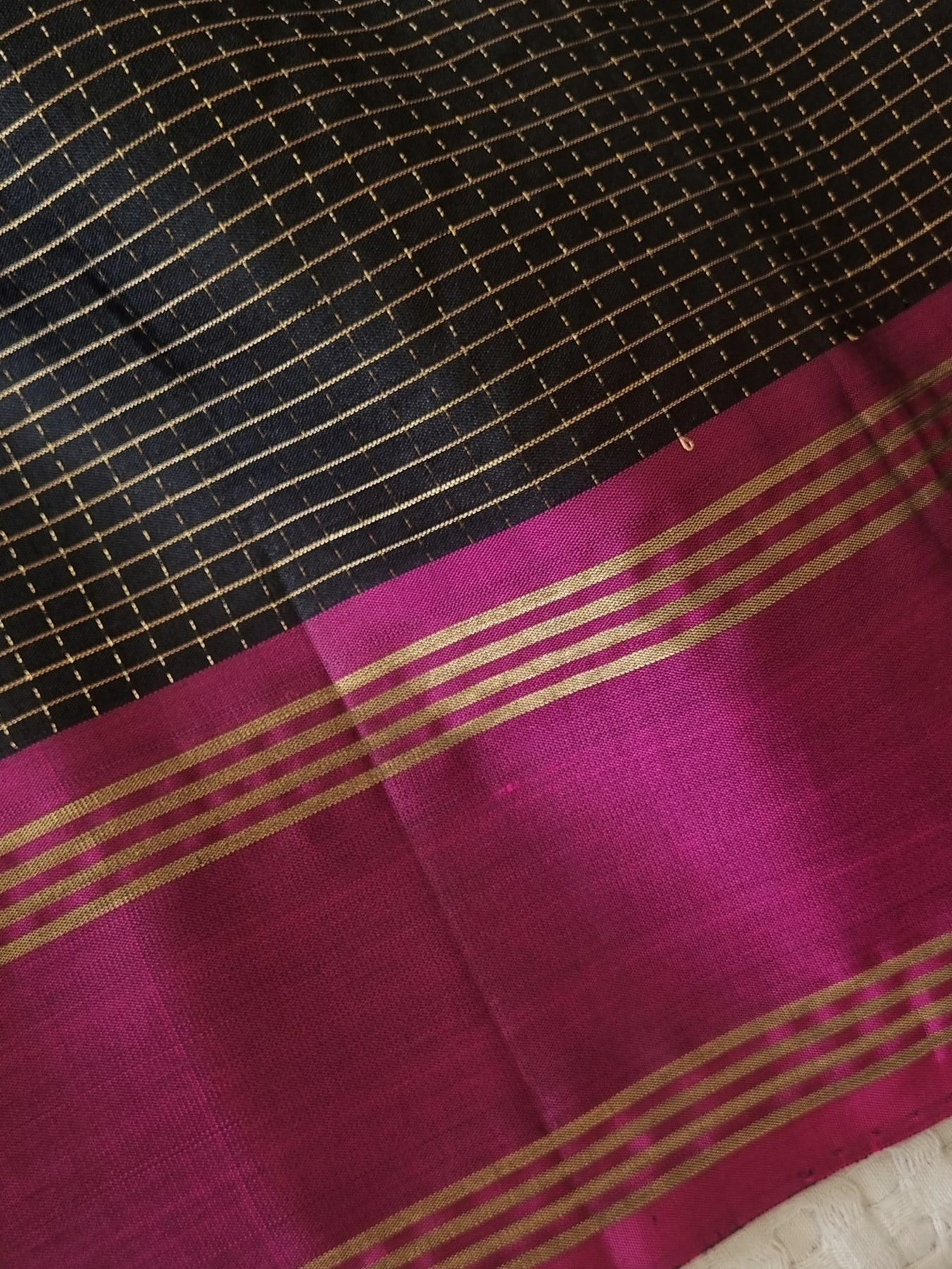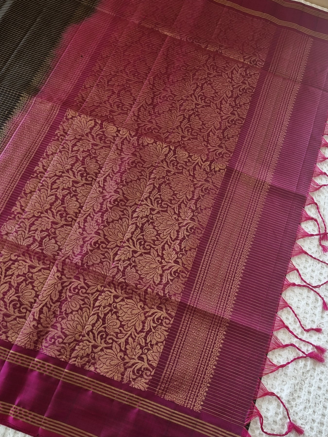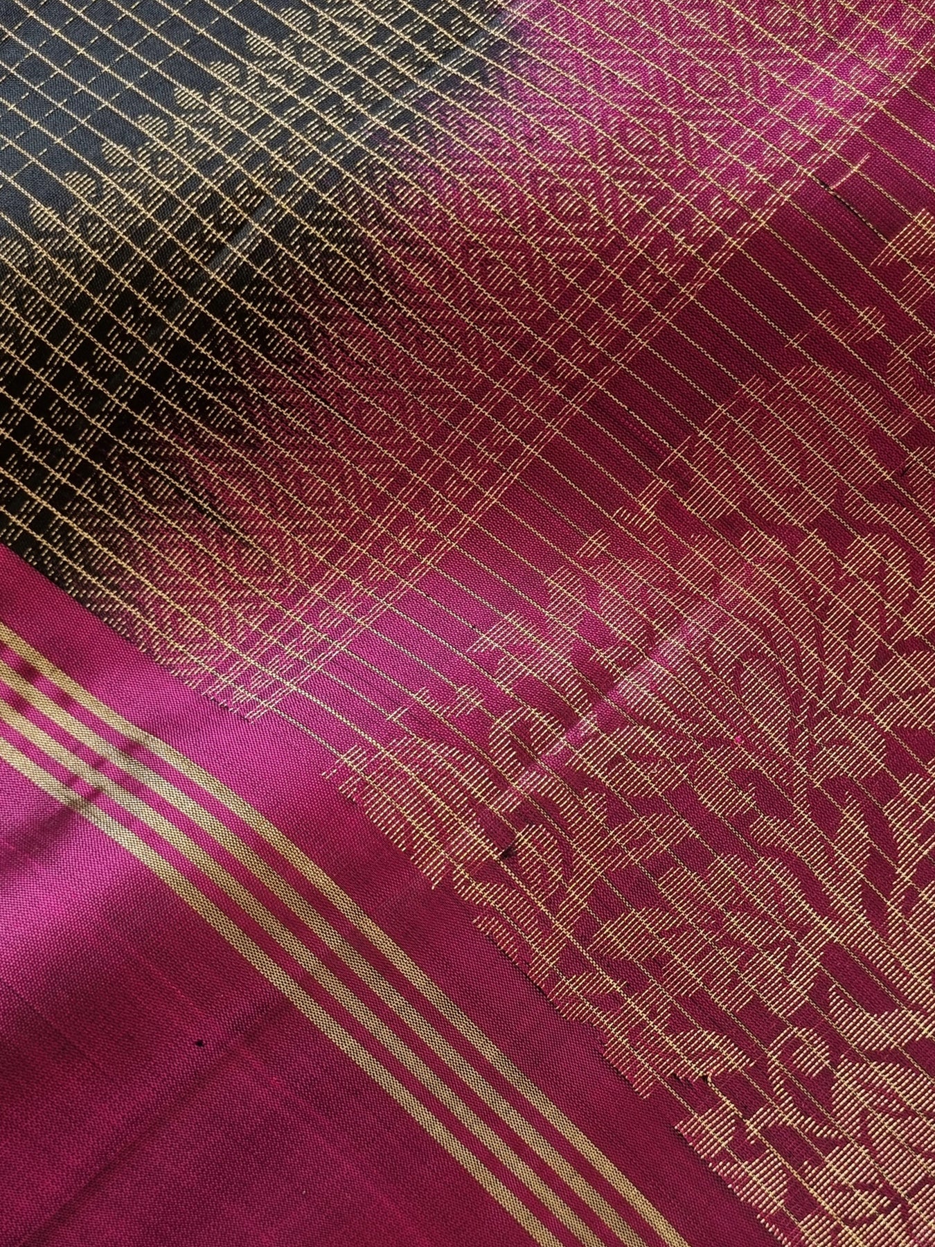 Beautiful Handwoven Soft Silk Saree with an elegant checked body and intricately woven gold motifs on the body and a rich contrast pallu