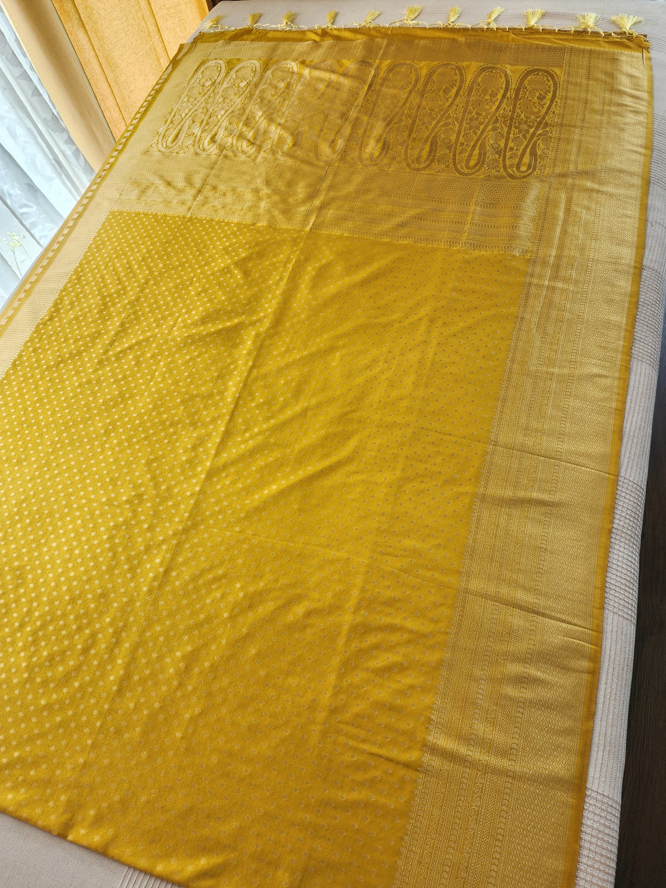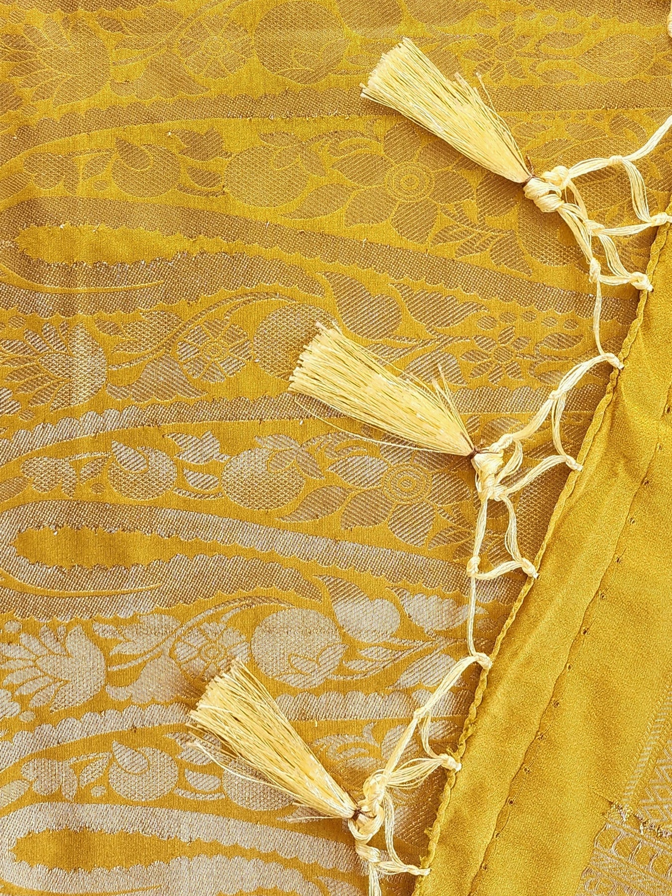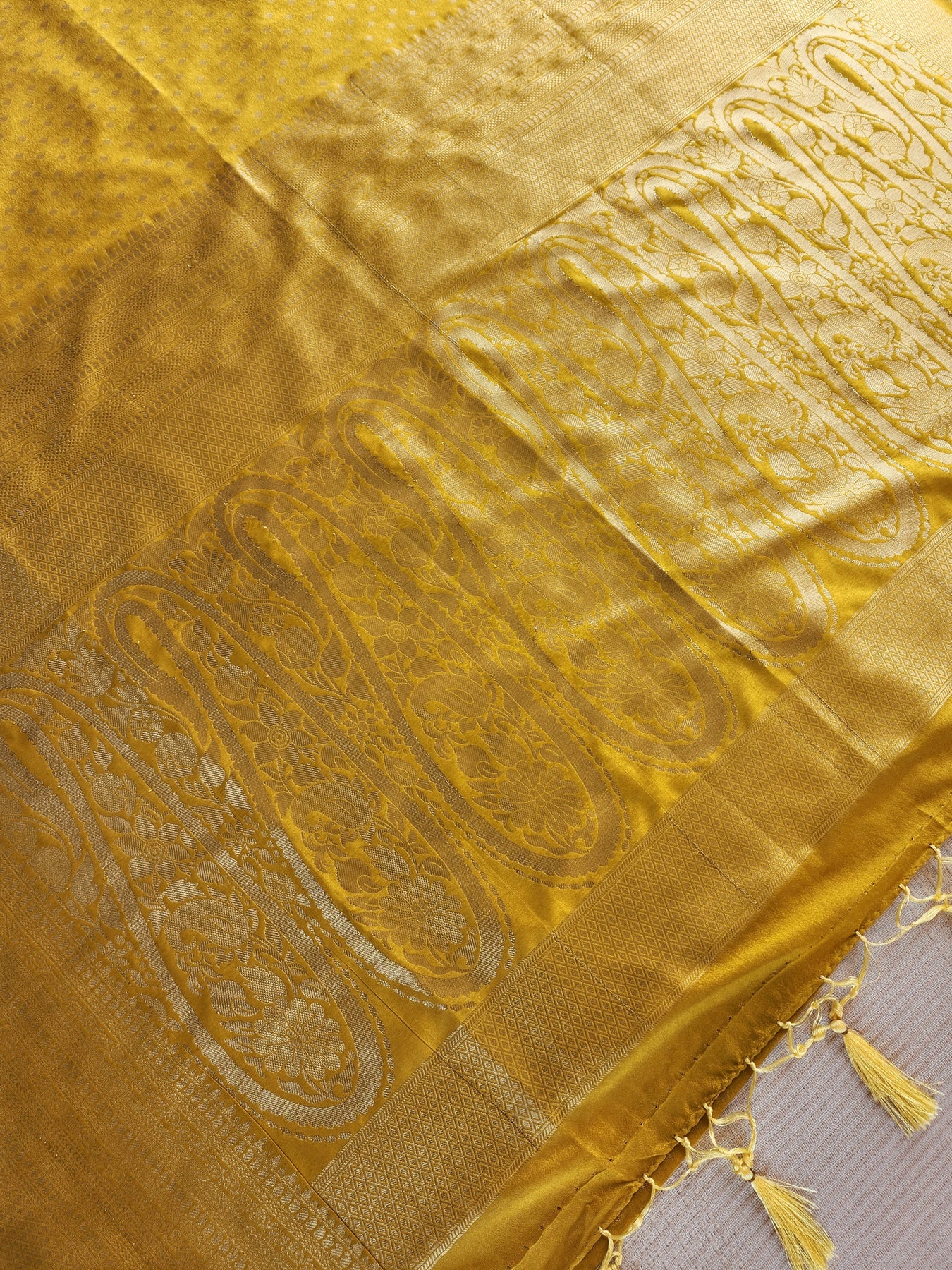 Yellow Semi-Silk Saree with Gold Banarasi Borders and intricately woven motifs on the body and a contrast pallu, beautifully finished with tassels
