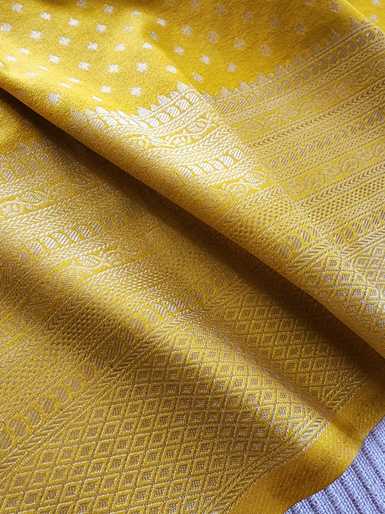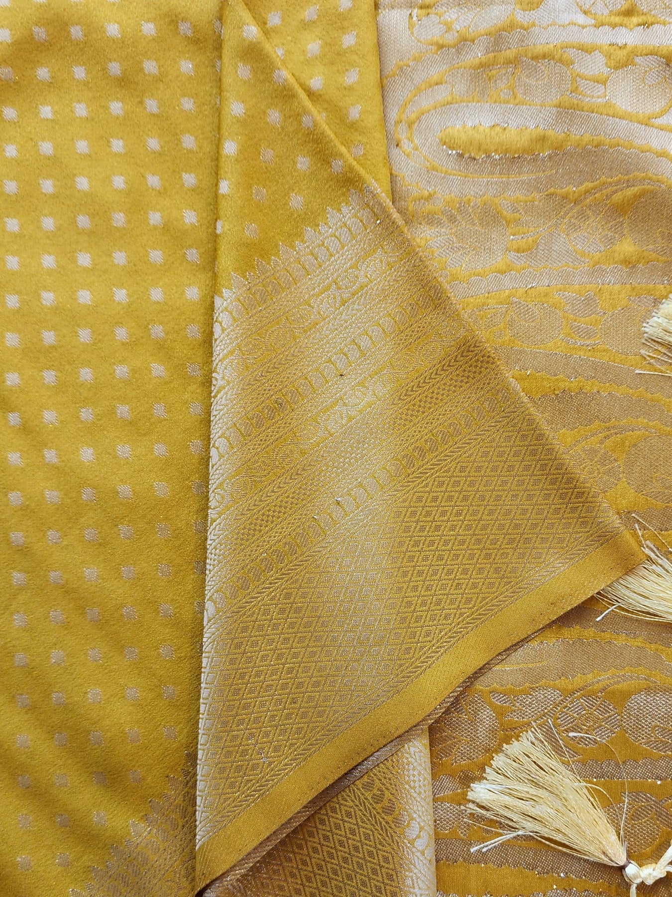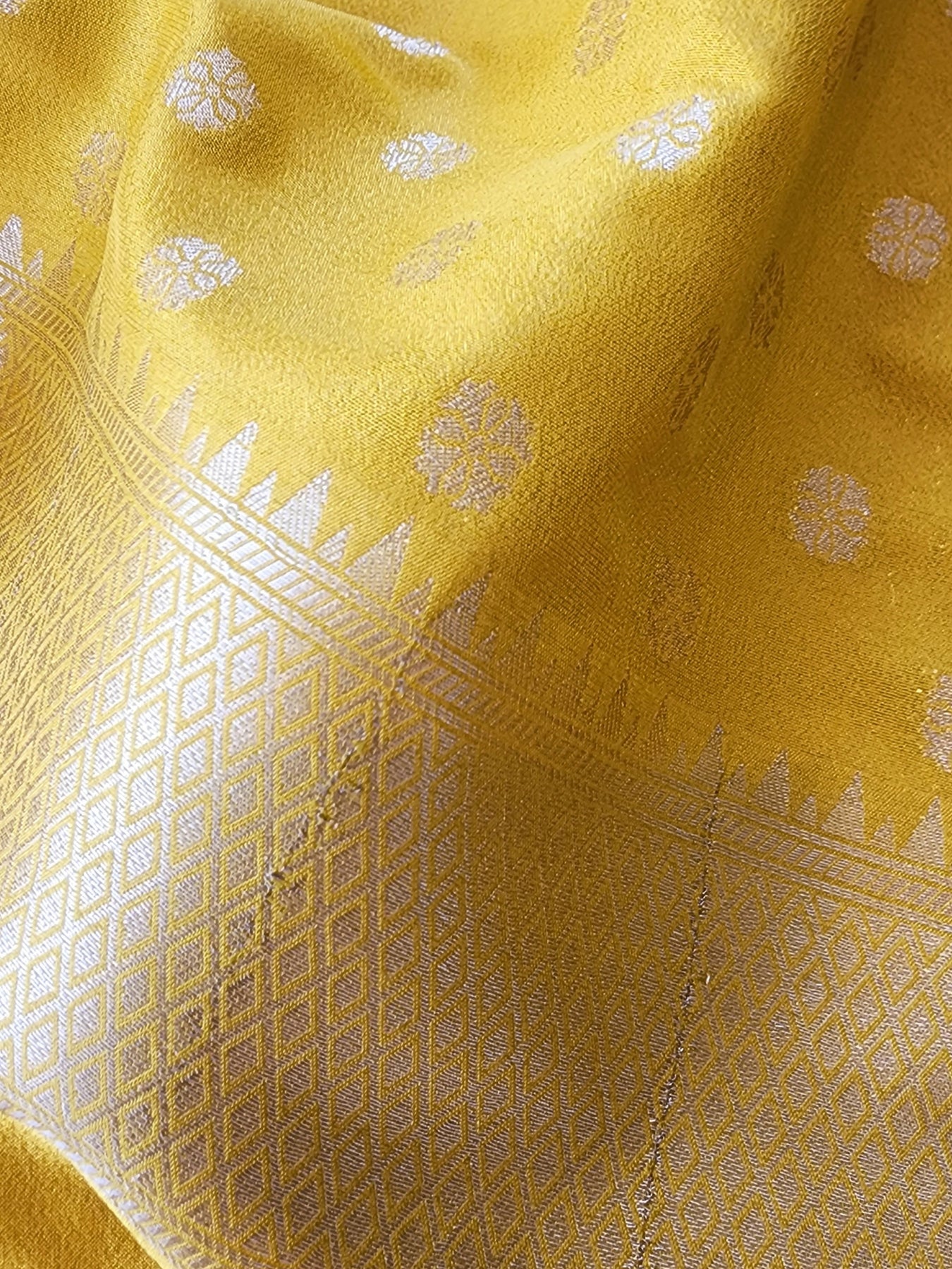 Yellow Semi-Silk Saree with Gold Banarasi Borders and intricately woven motifs on the body and a contrast pallu, beautifully finished with tassels