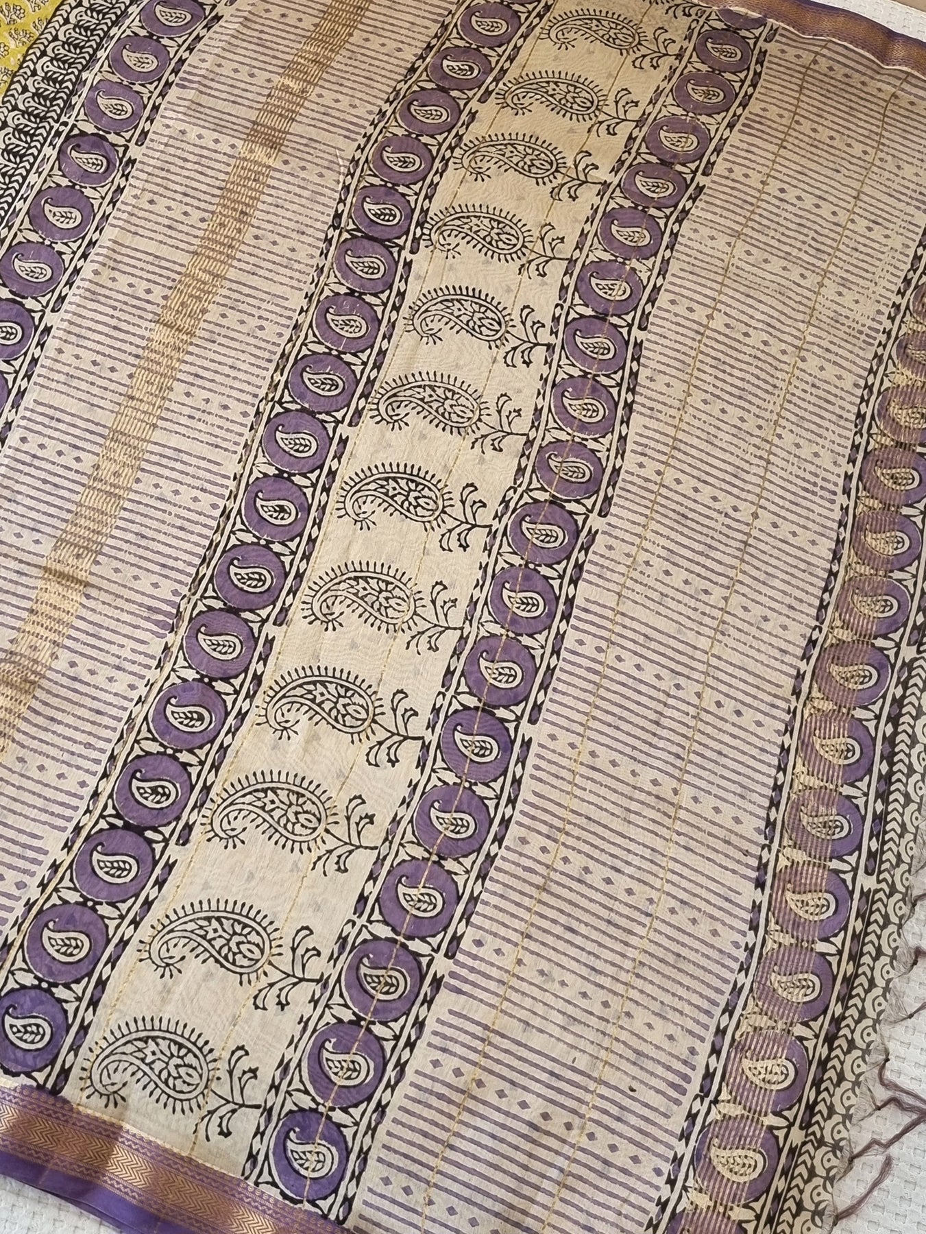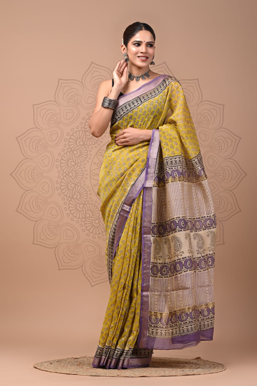 An elegant Maheshwari Silk Cotton Saree Handblock Prints