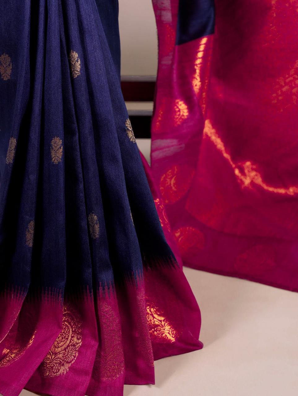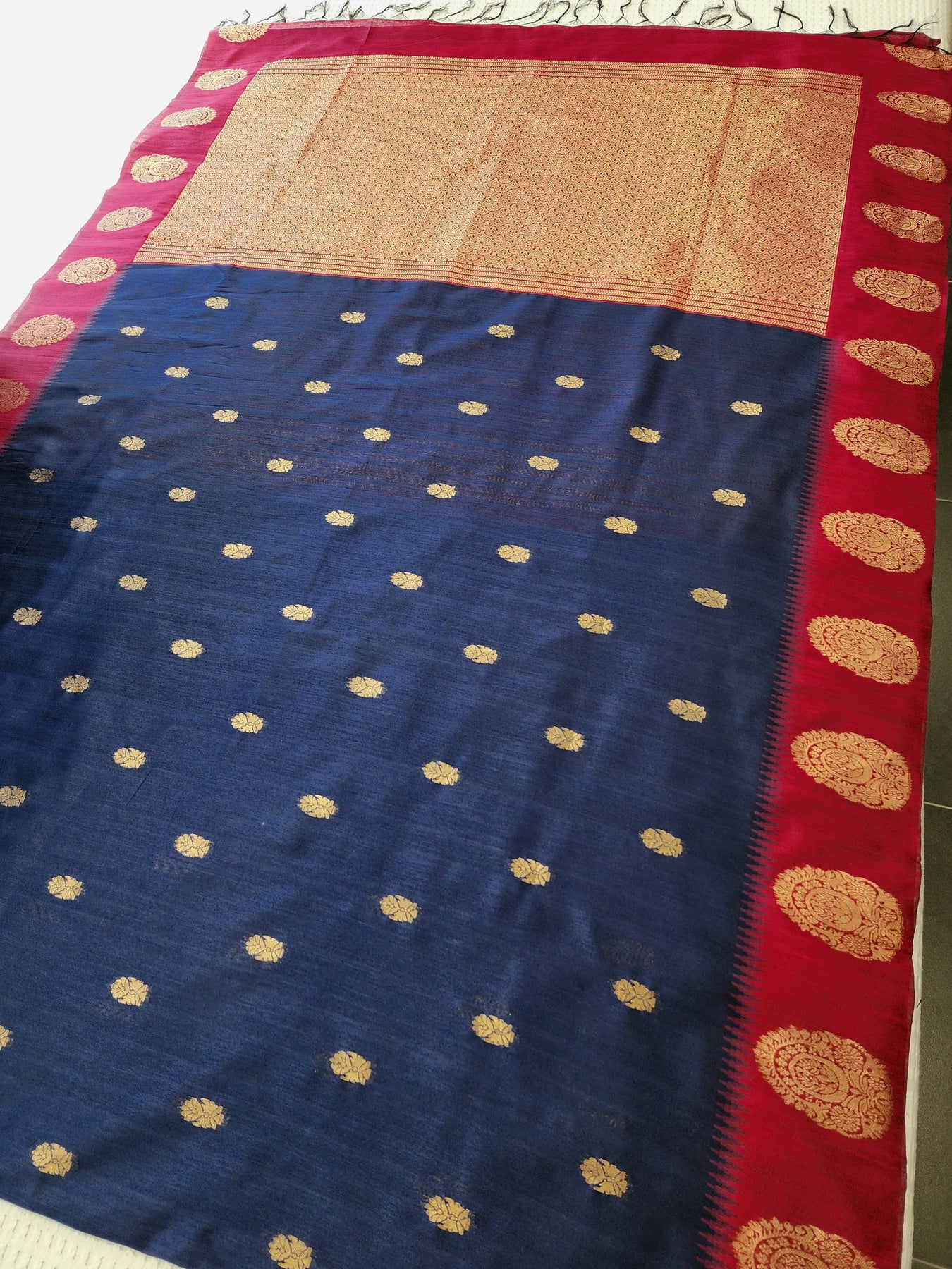 Navy Blue Semi Raw Silk Saree with contrast borders and pallu, beautifully finished with tassels