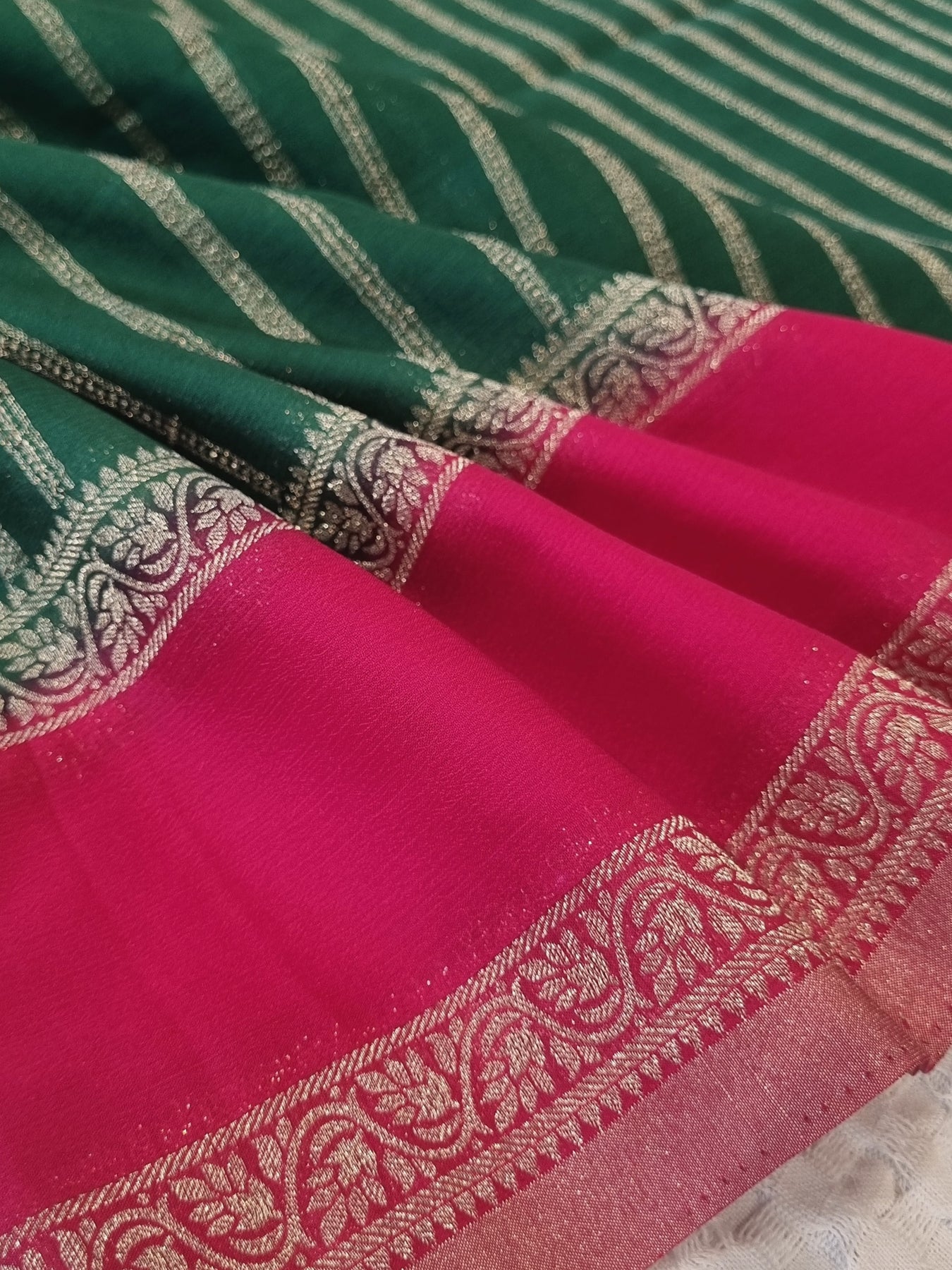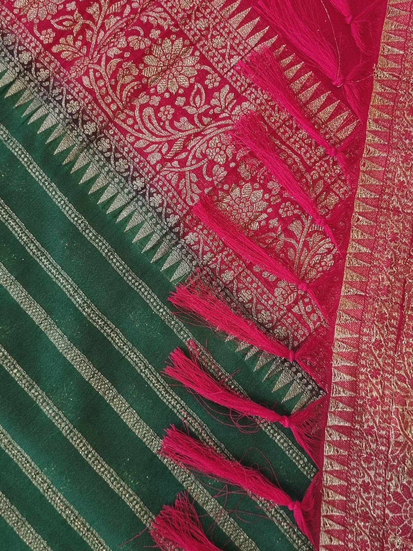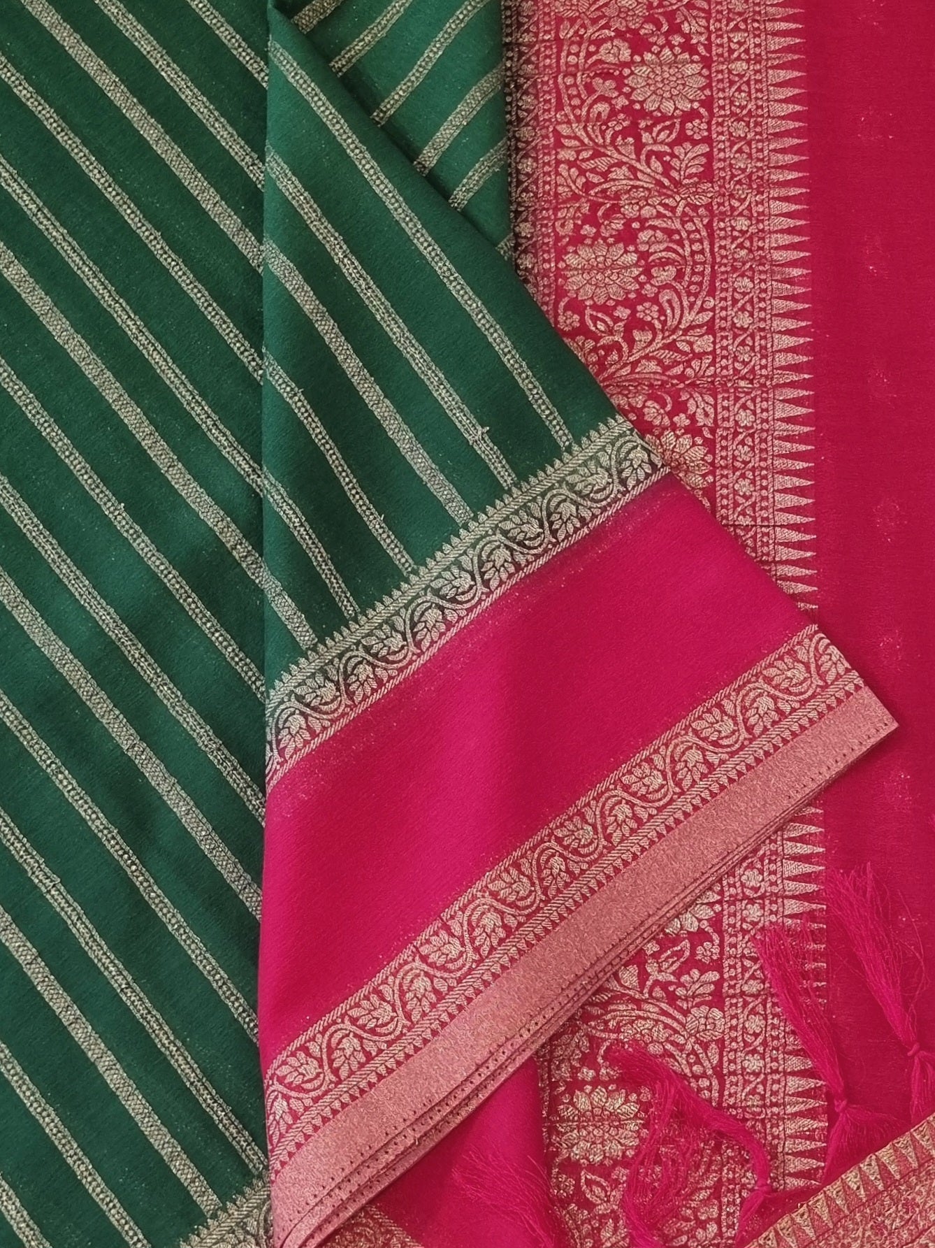 • Green Semi Crepe Silk Saree, with Pink Contrast Borders, paired with a Contrast Blouse fabric