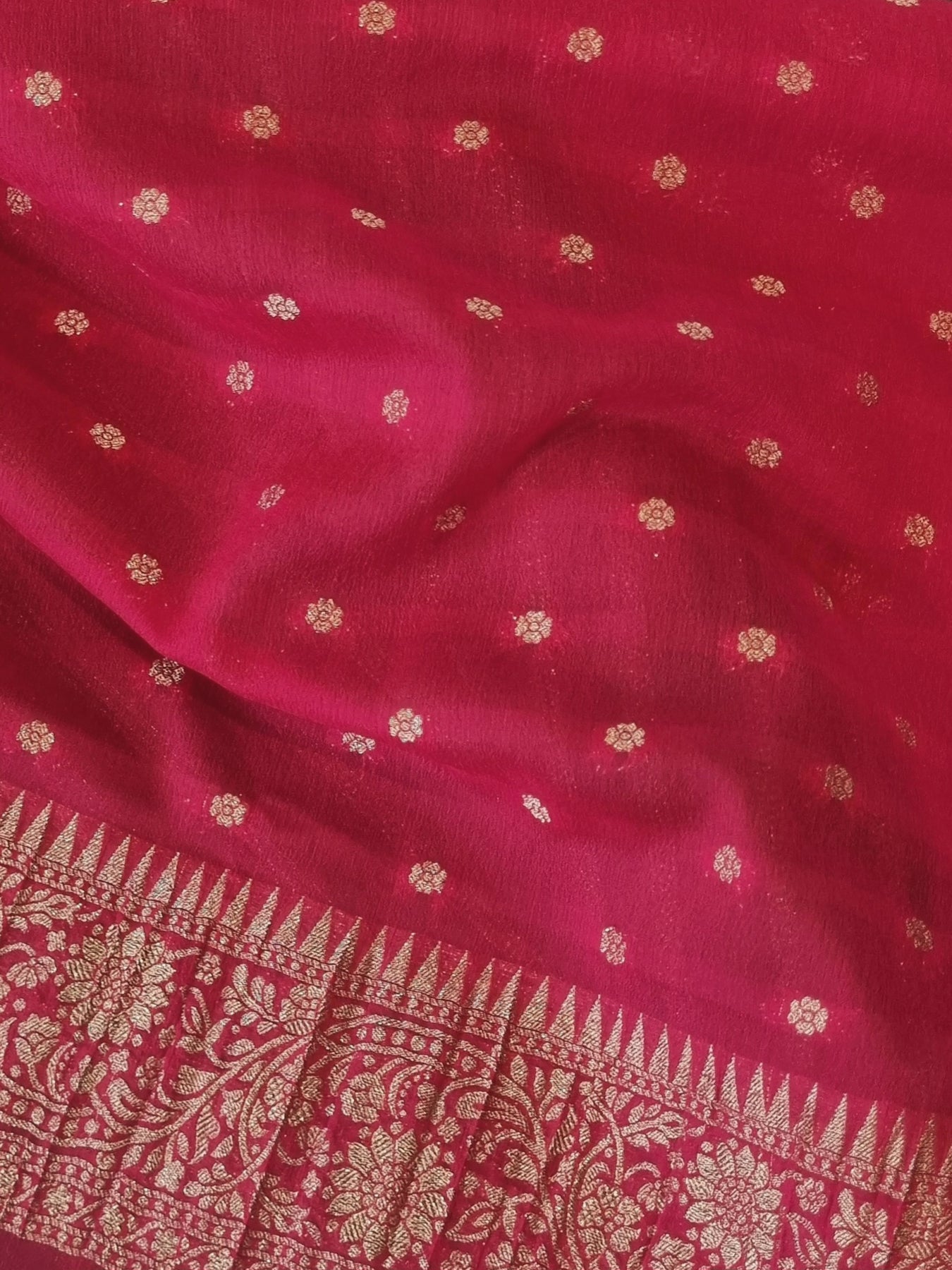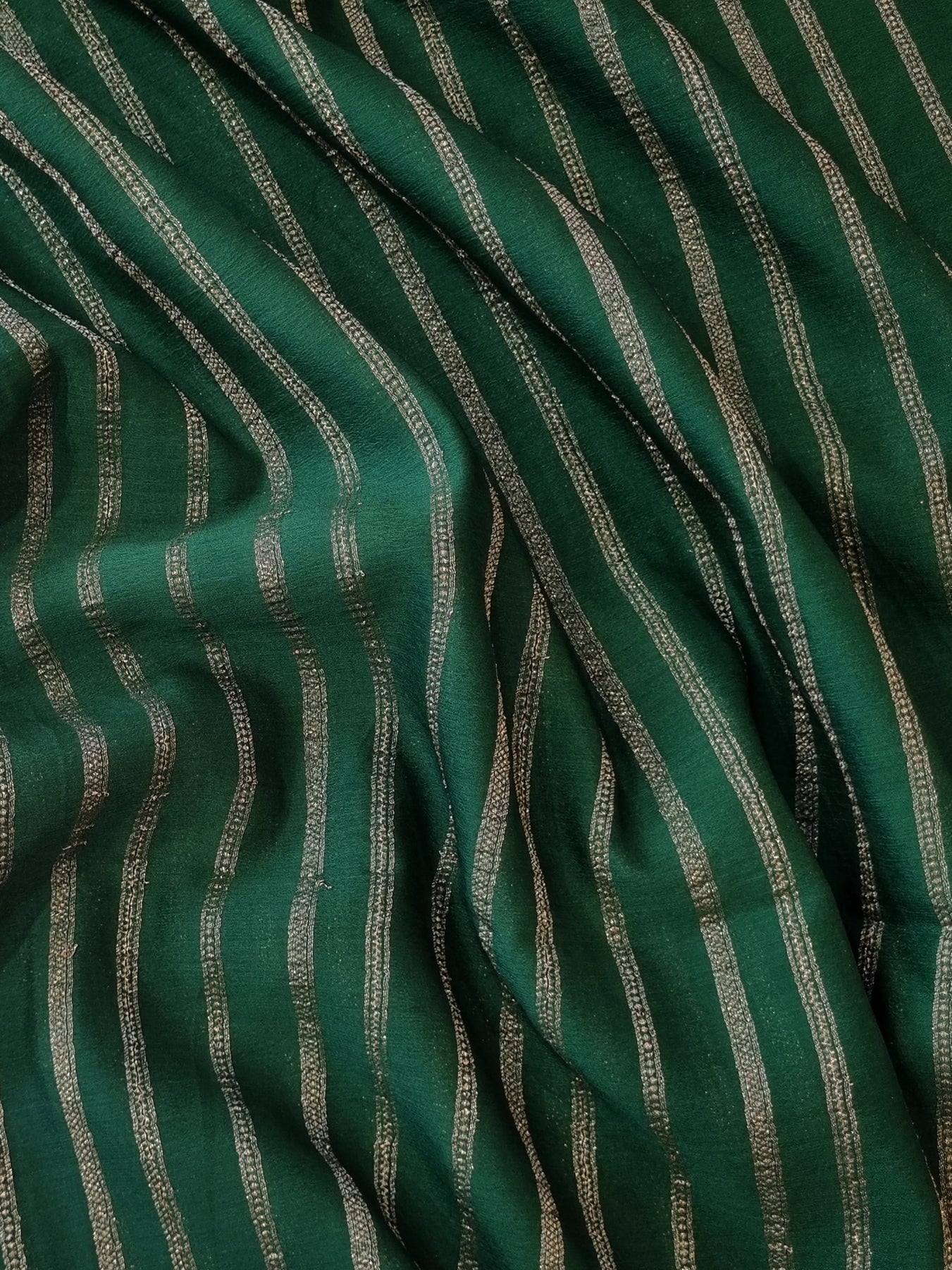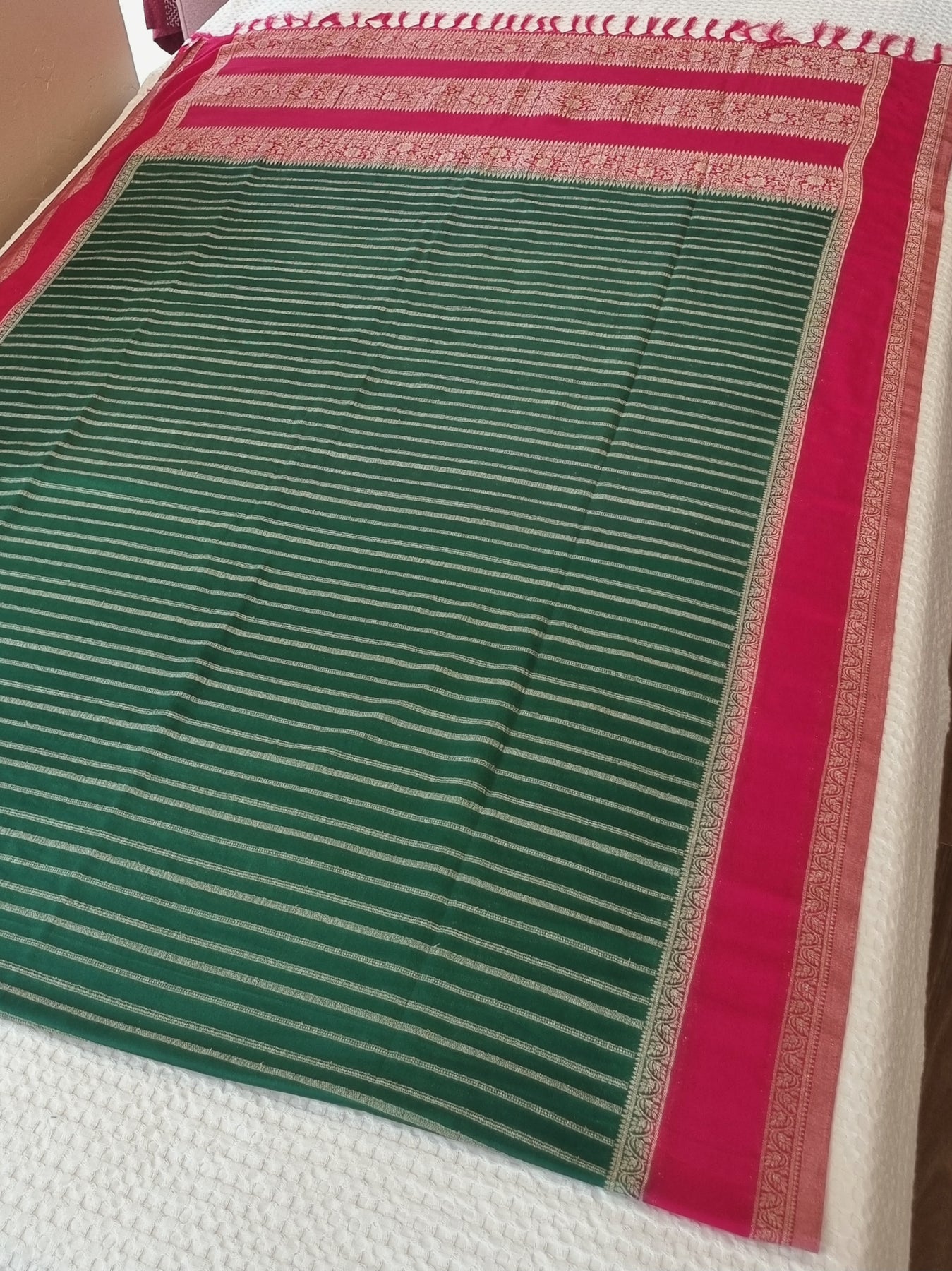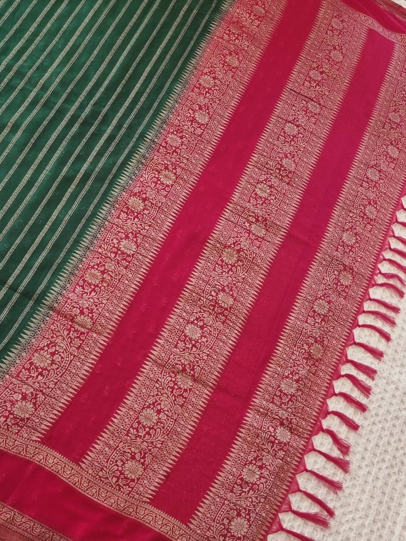 • Green Semi Crepe Silk Saree, with Pink Contrast Borders, paired with a Contrast Blouse fabric