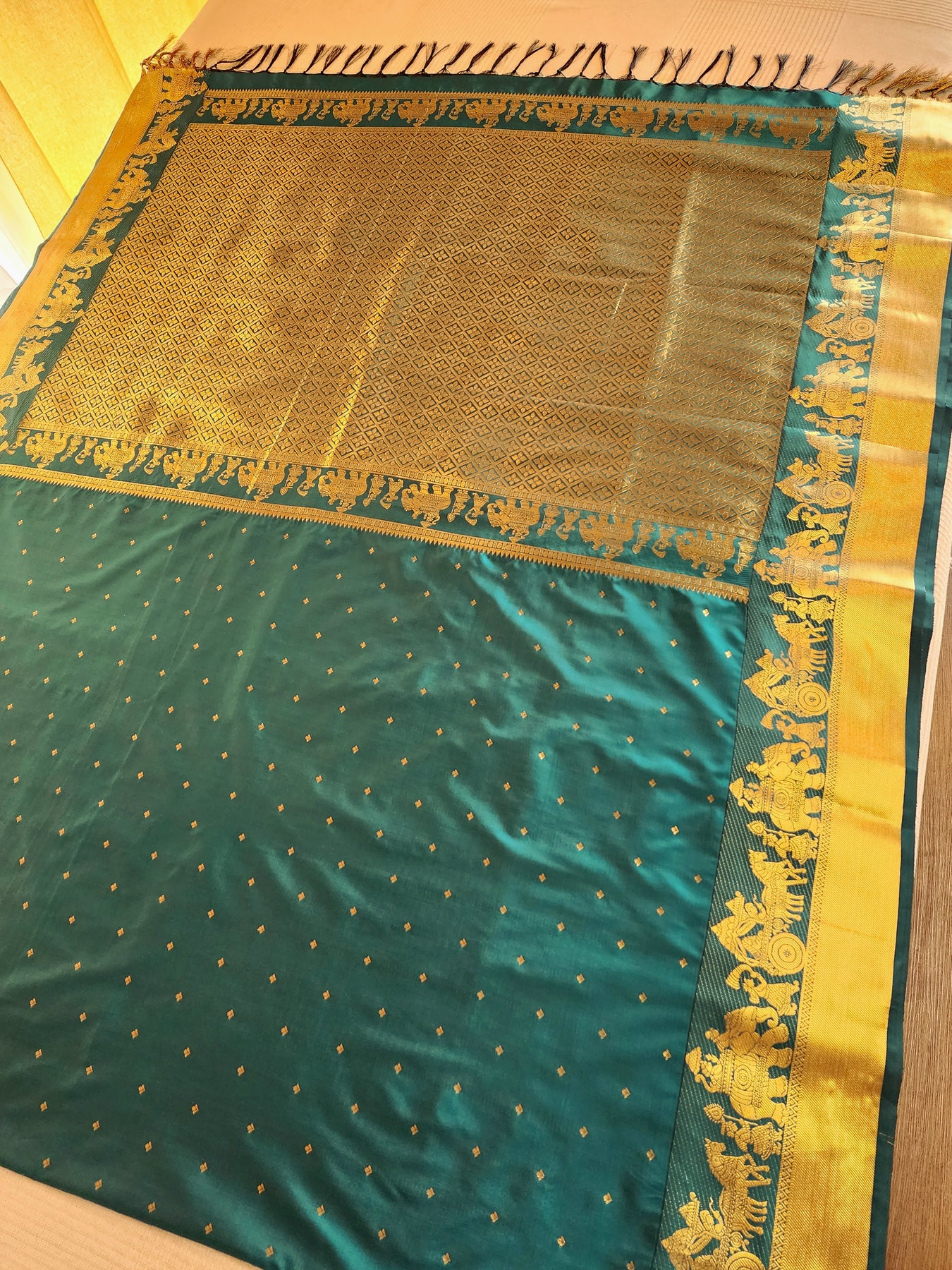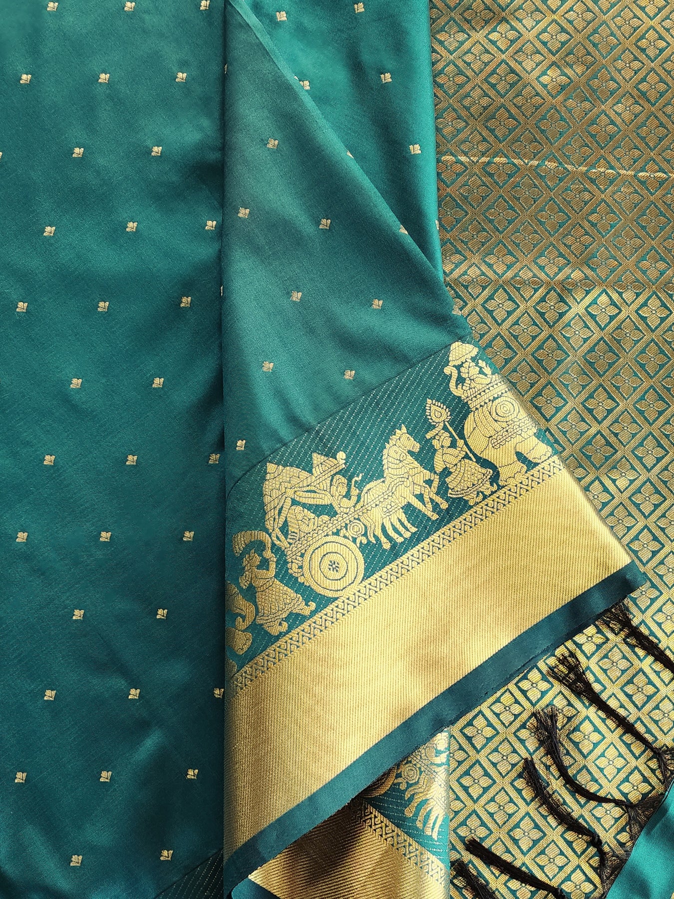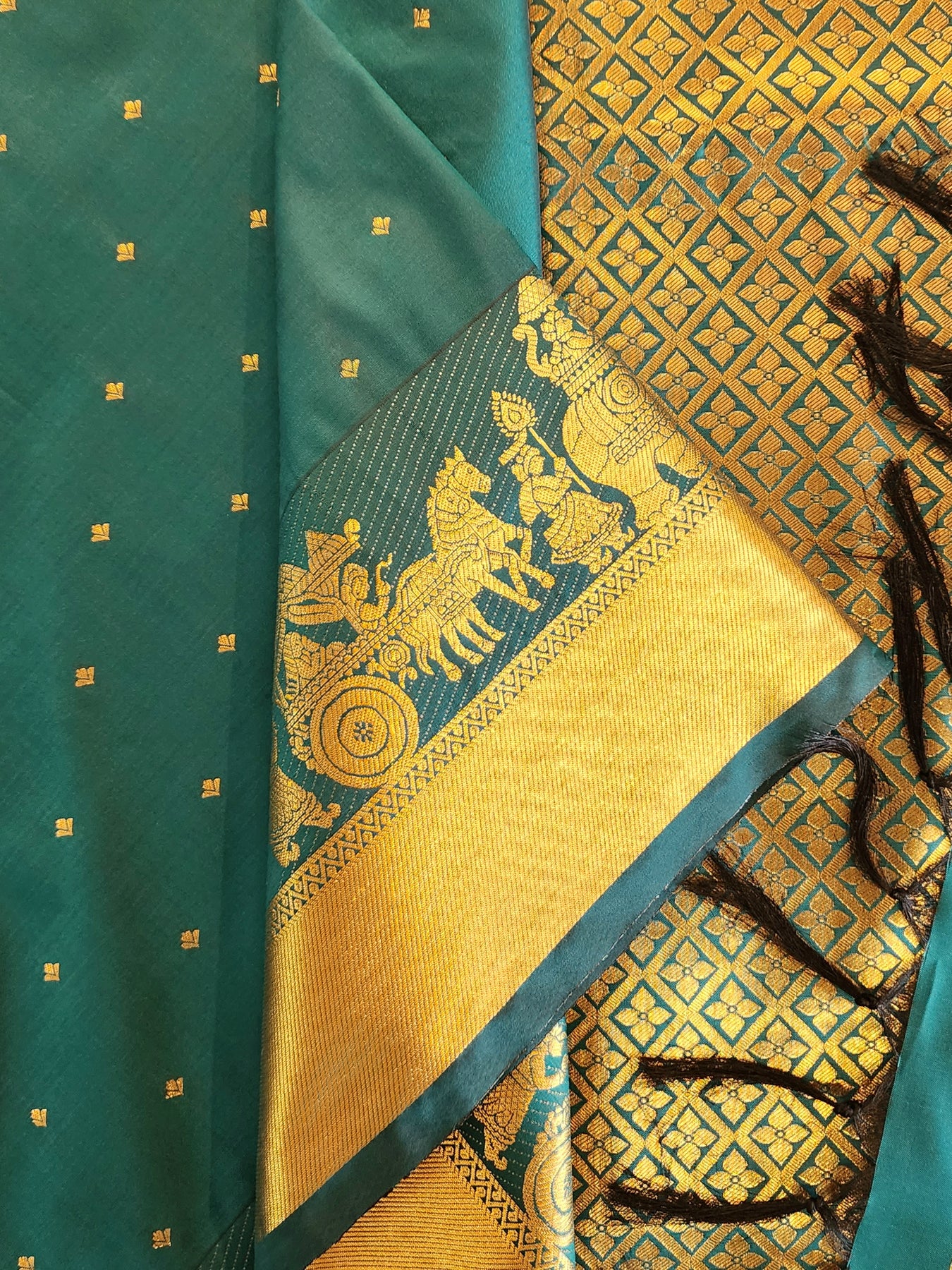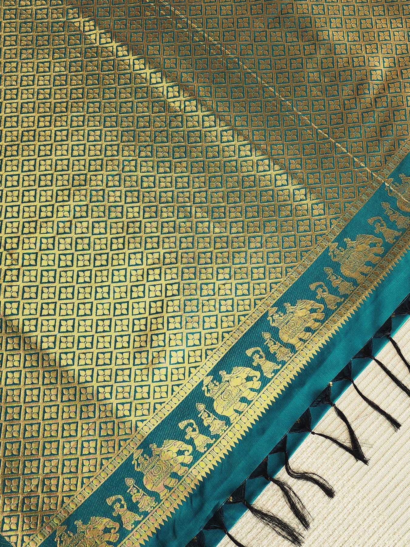 Teal Green Semi Silk Saree with woven borders and pallu, beautifully finished with tassels