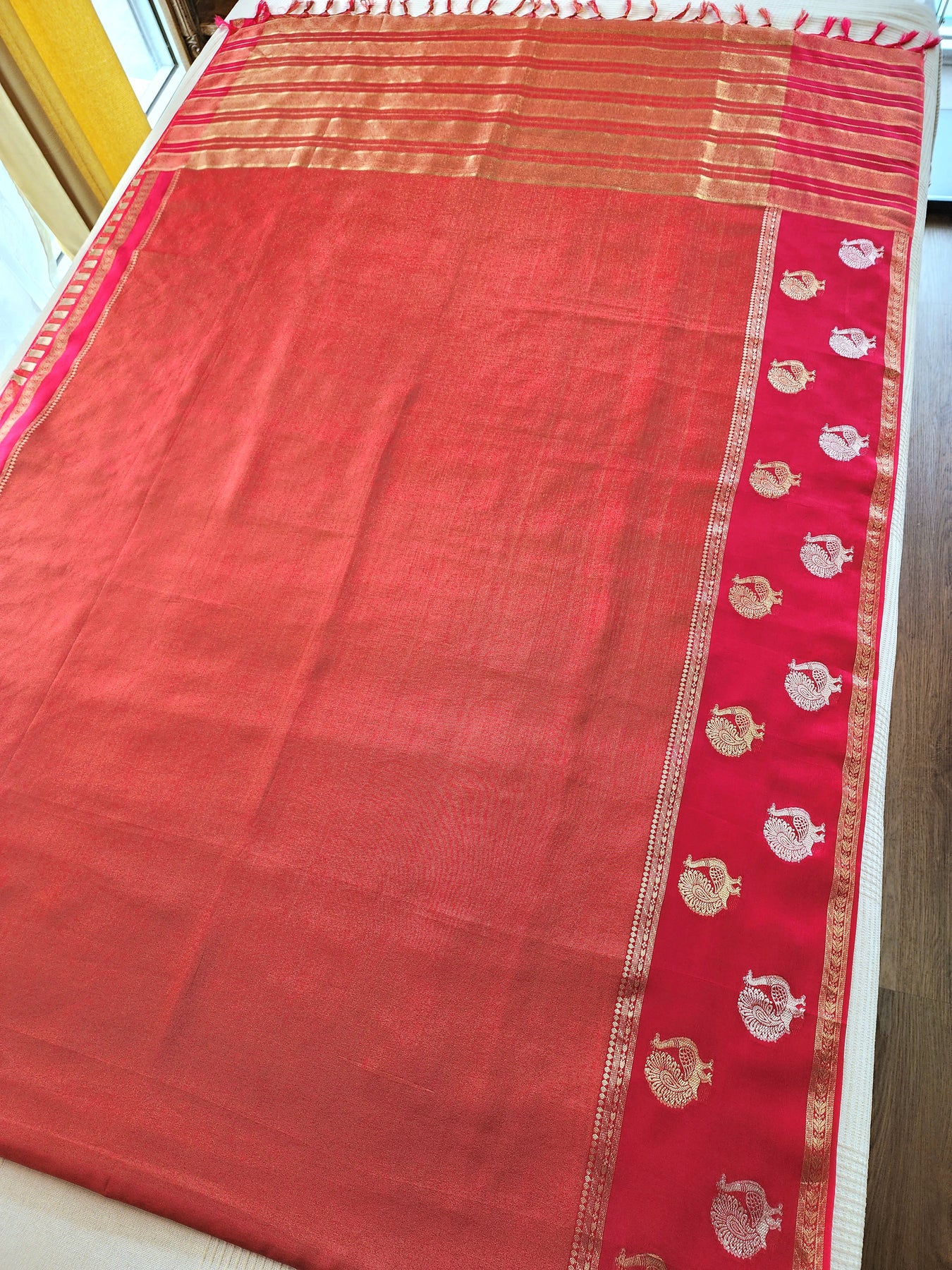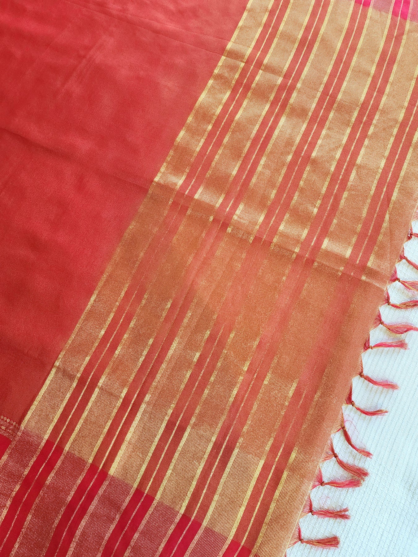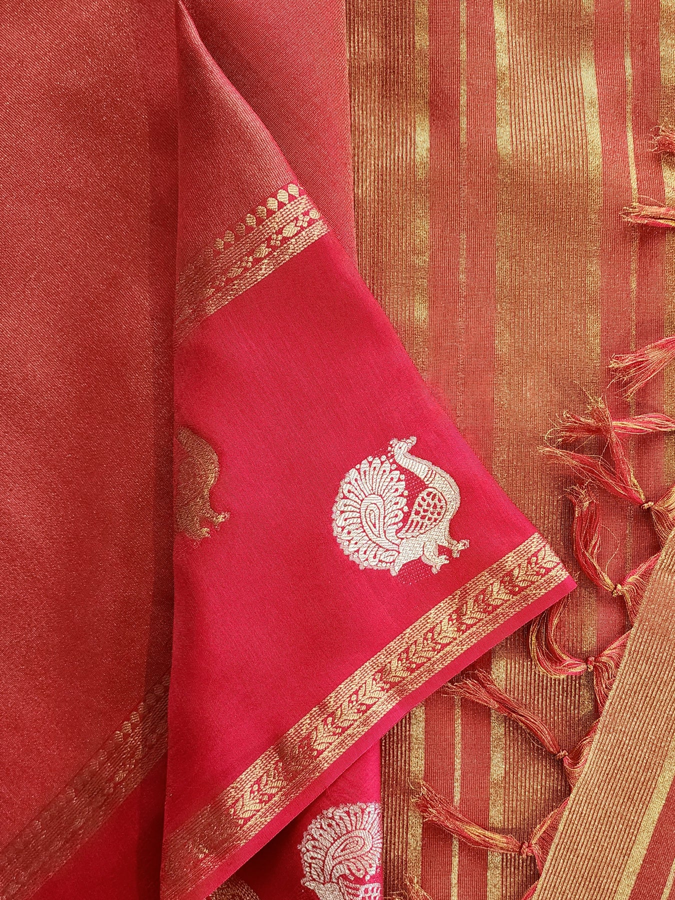 • An elegant Red Tissue Crepe Silk Saree with contrast borders