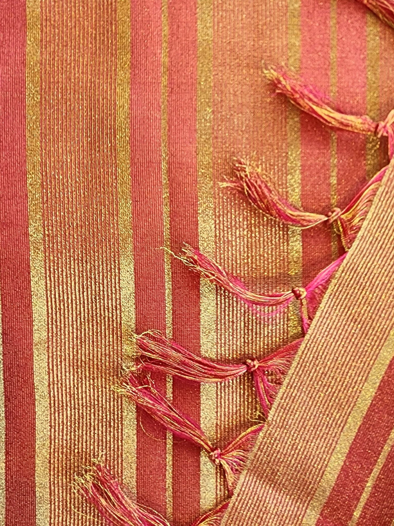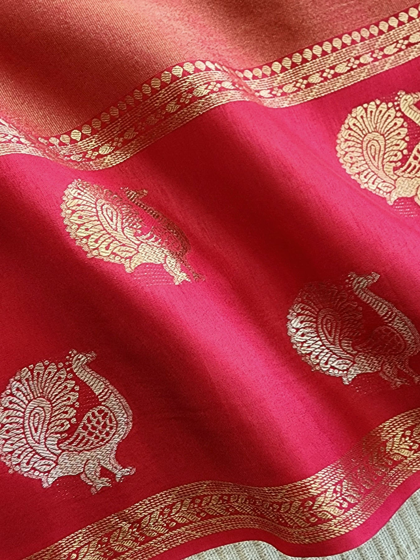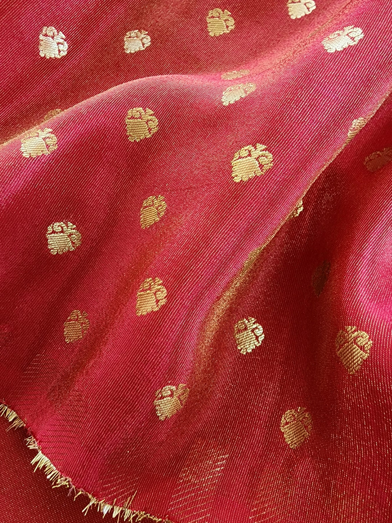 • An elegant Red Tissue Crepe Silk Saree with contrast borders