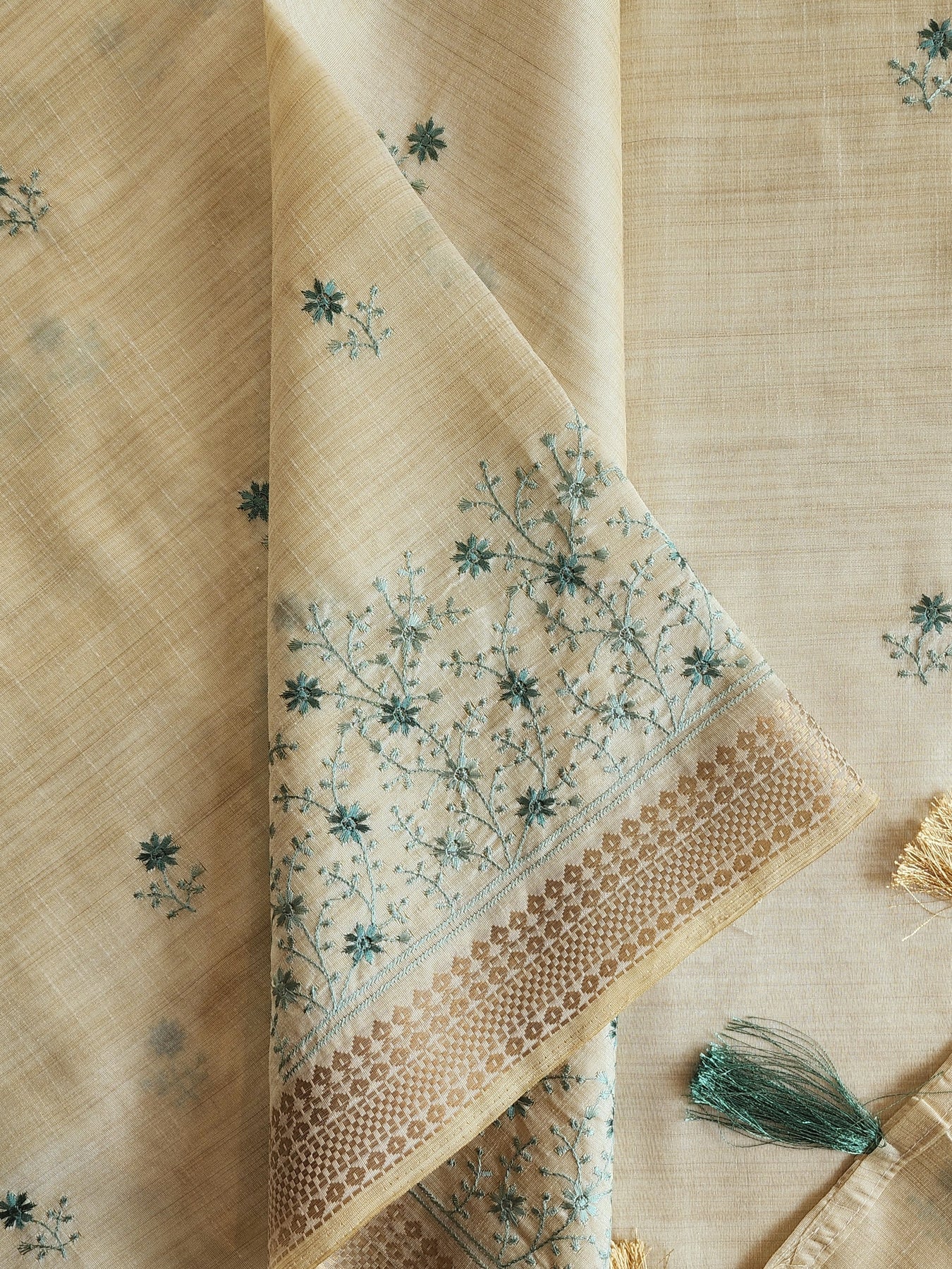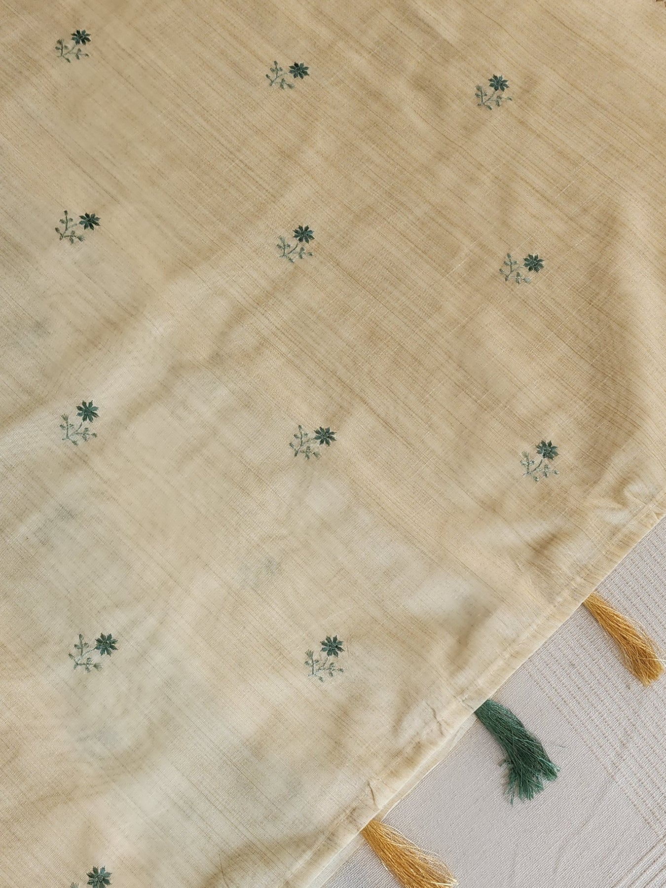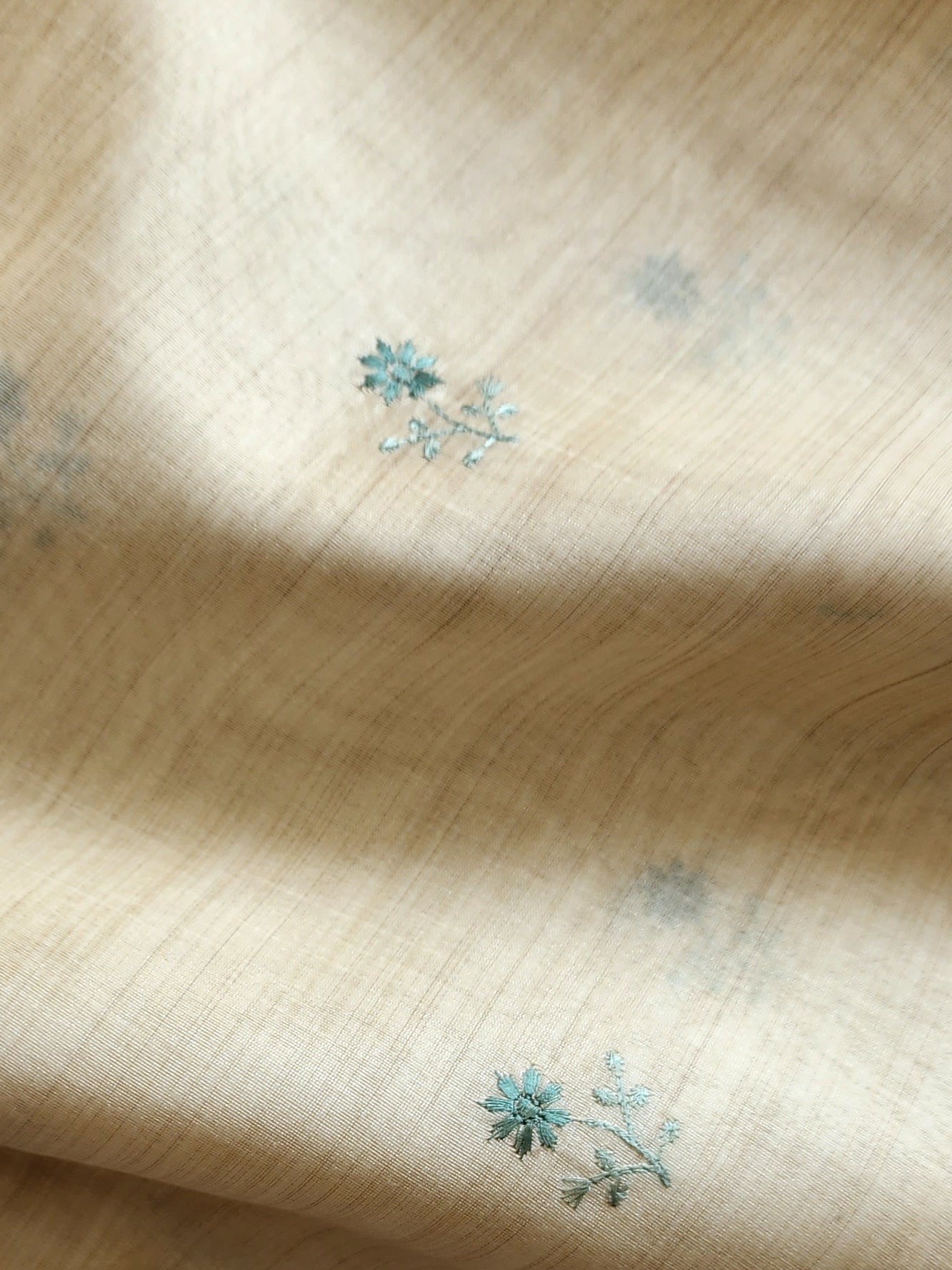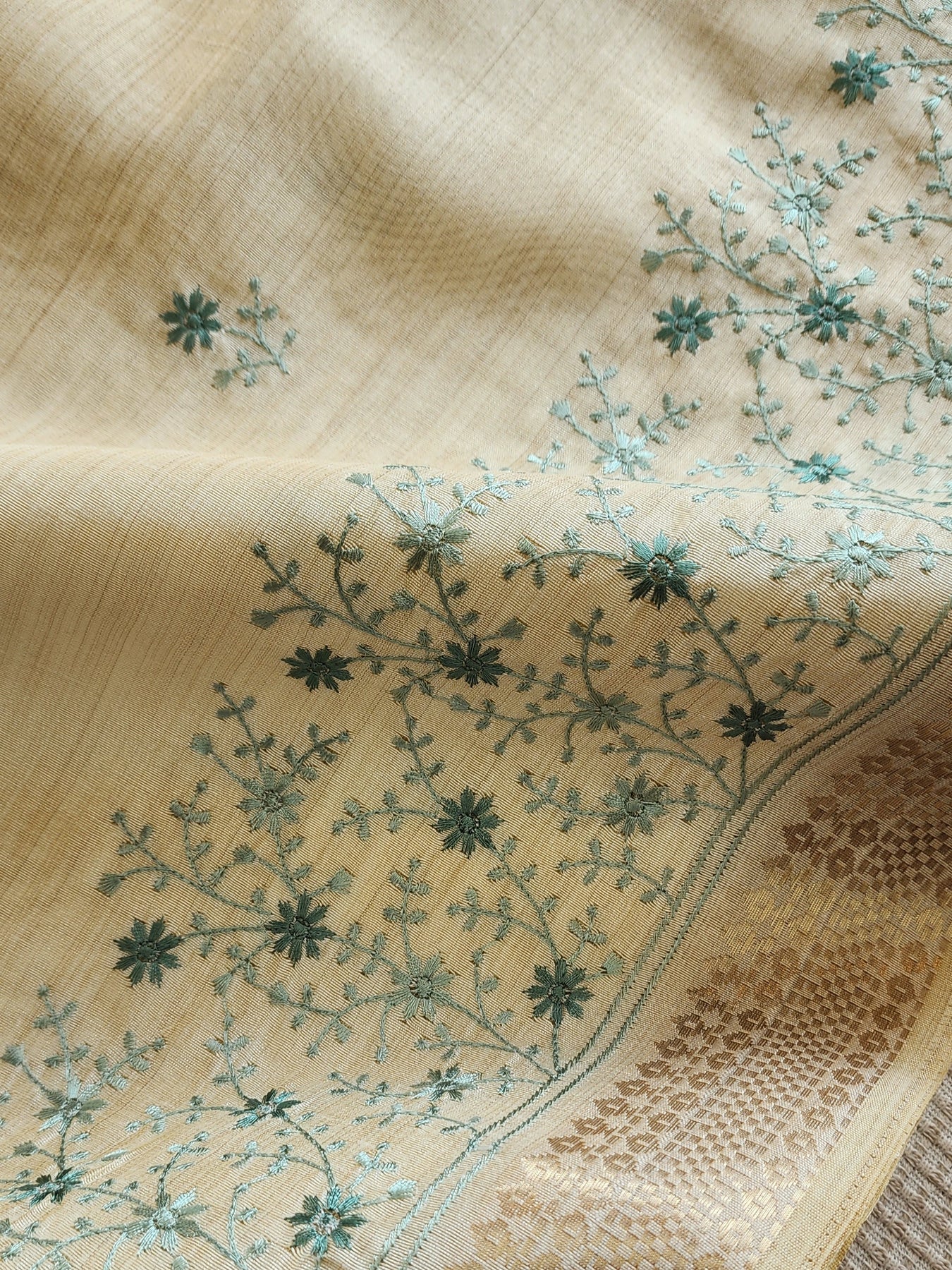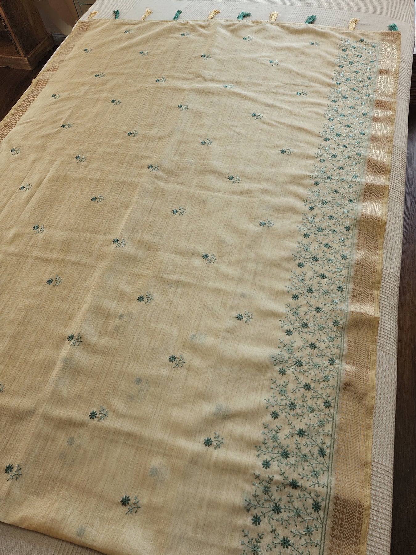 A beautiful Silk Cotton Saree with embroidered floral motifs on the body and pallu
