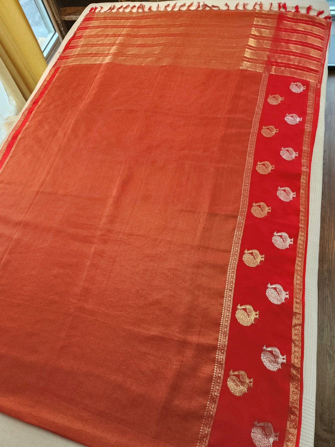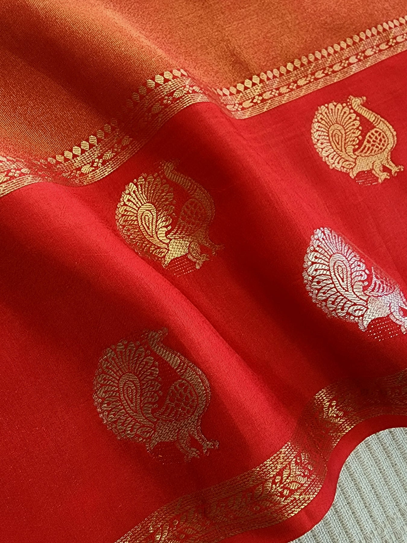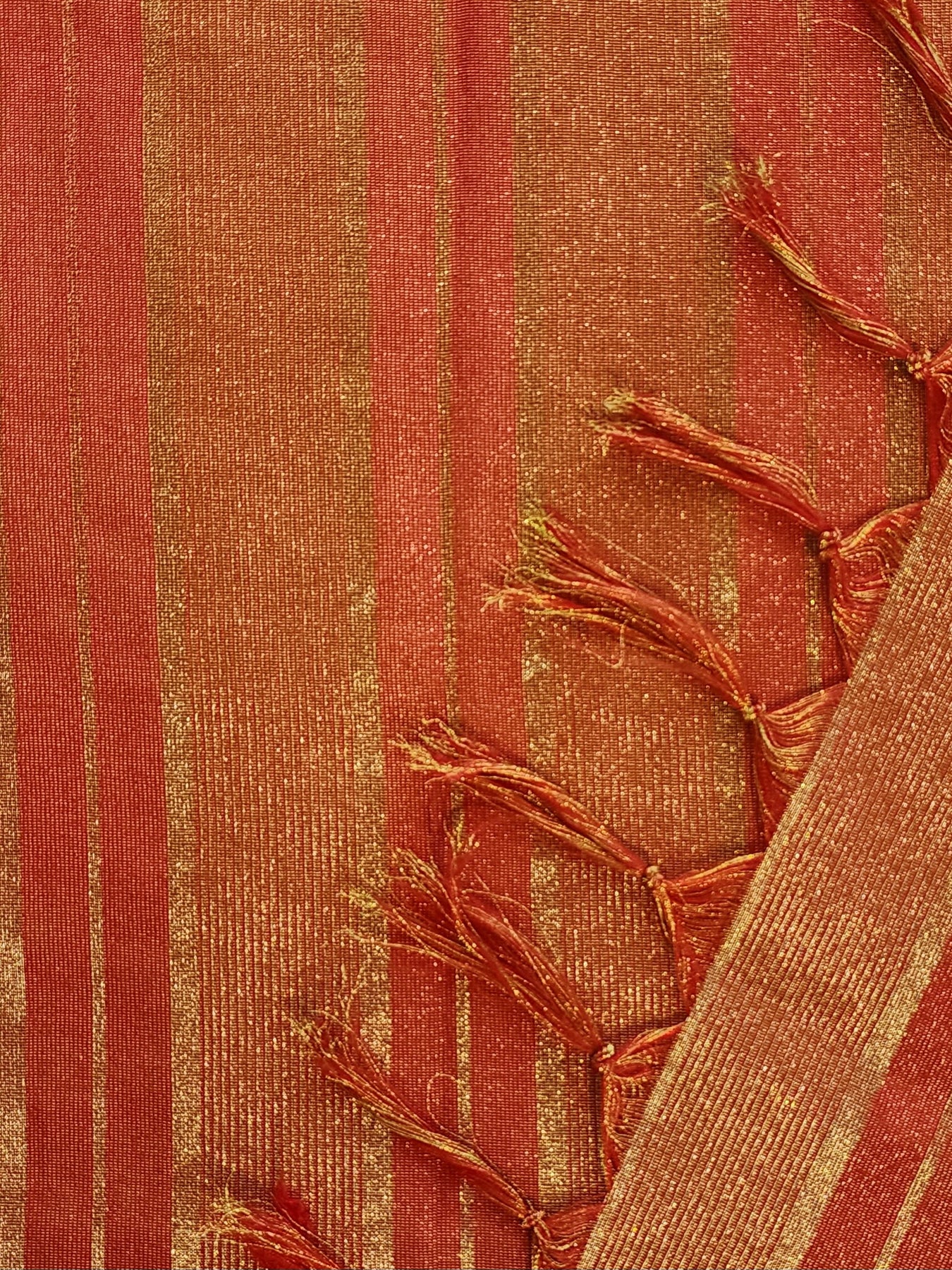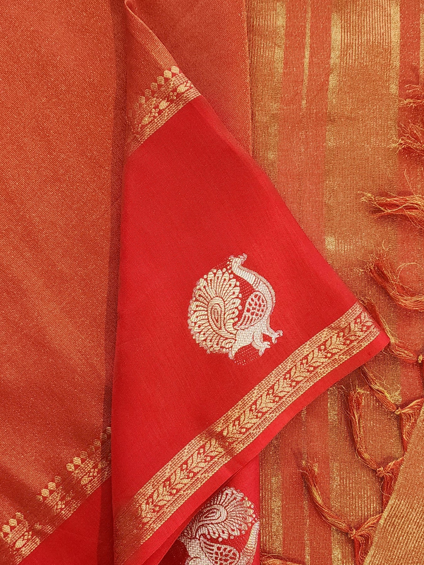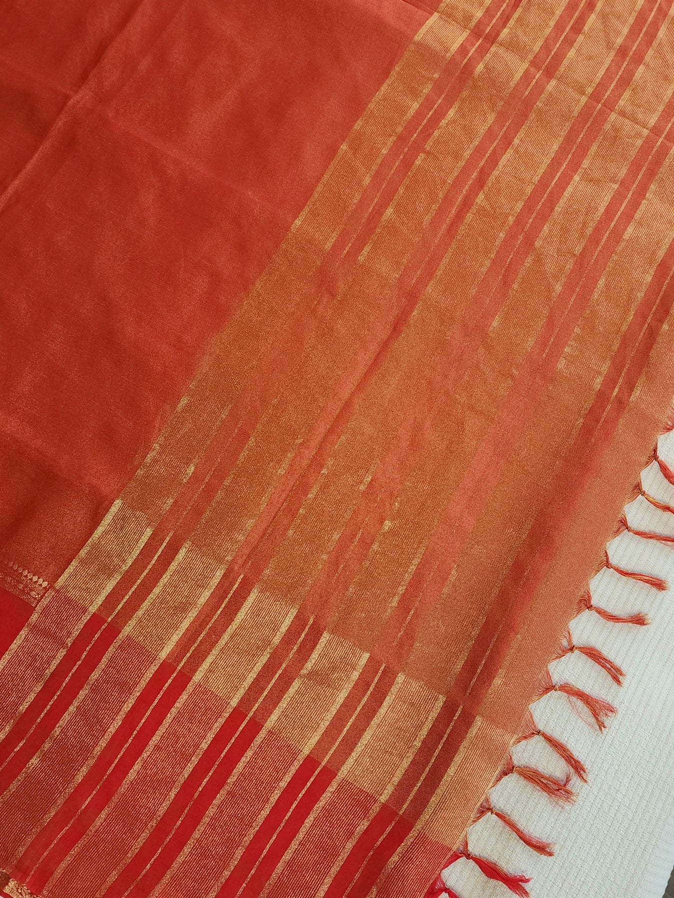 An elegant Red Tissue Crepe Silk Saree with contrast borders