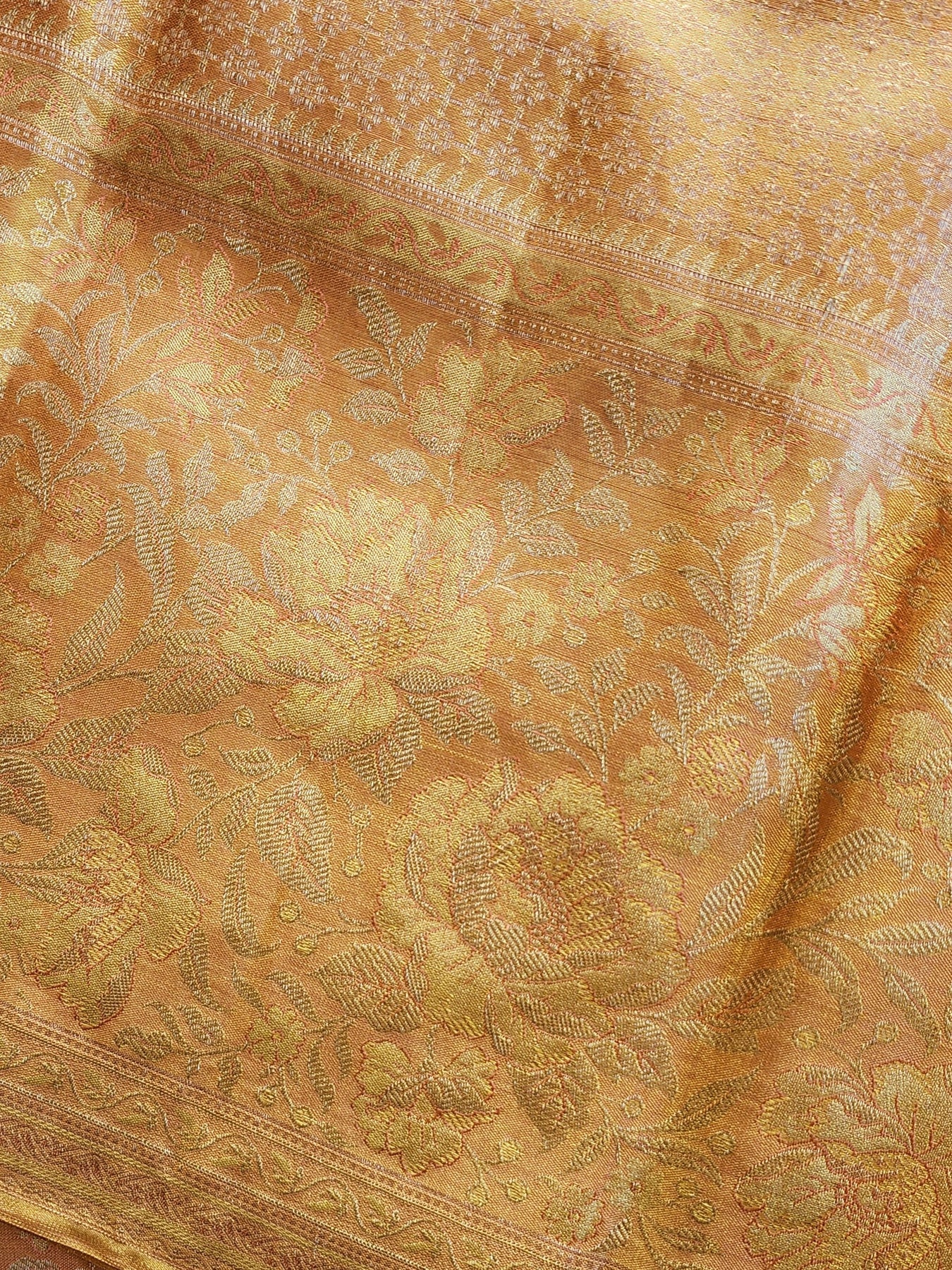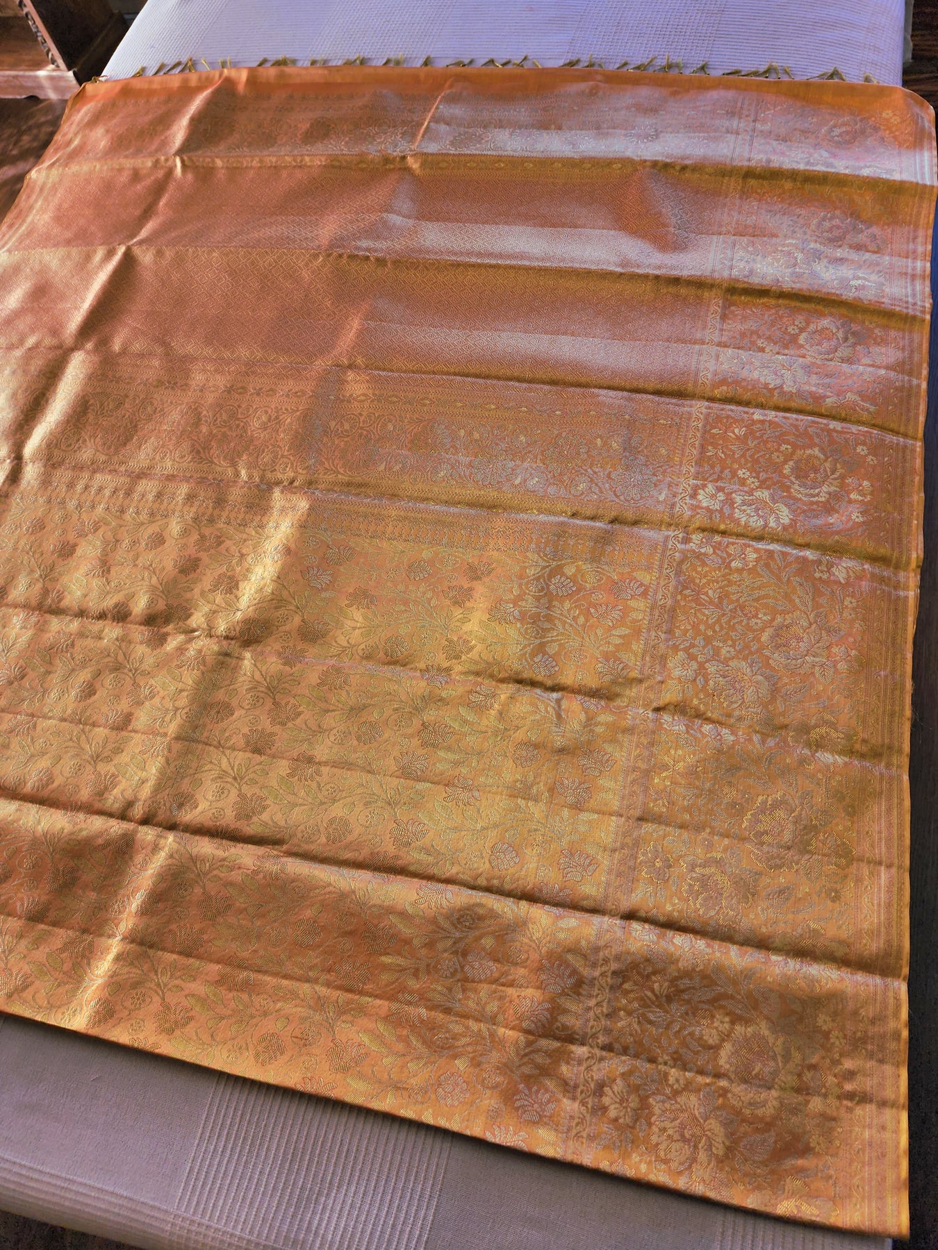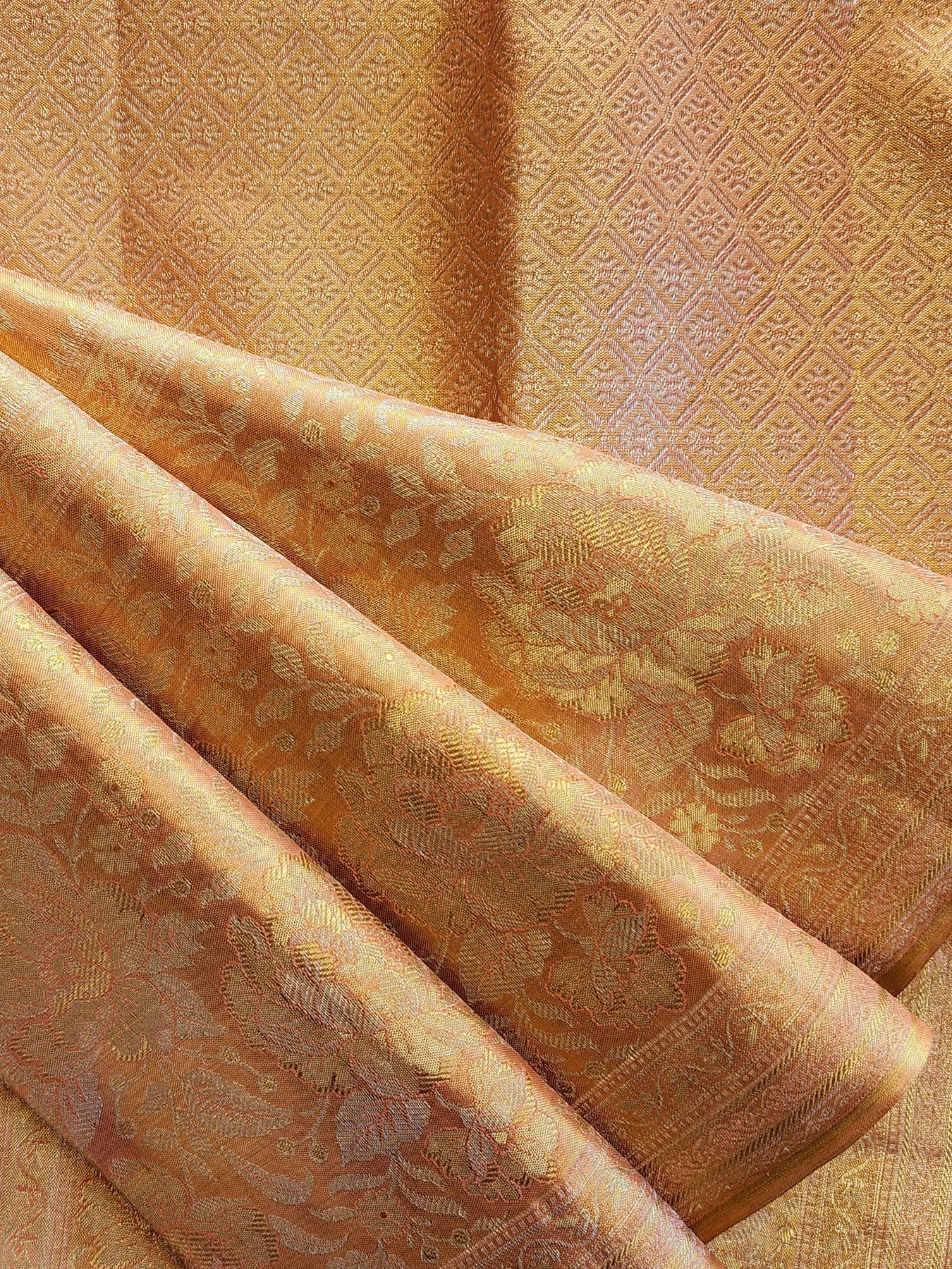 An elegant Tissue Kanjivaram Pure Silk Saree with woven Floral designs with Zari Borders and a Pallu.