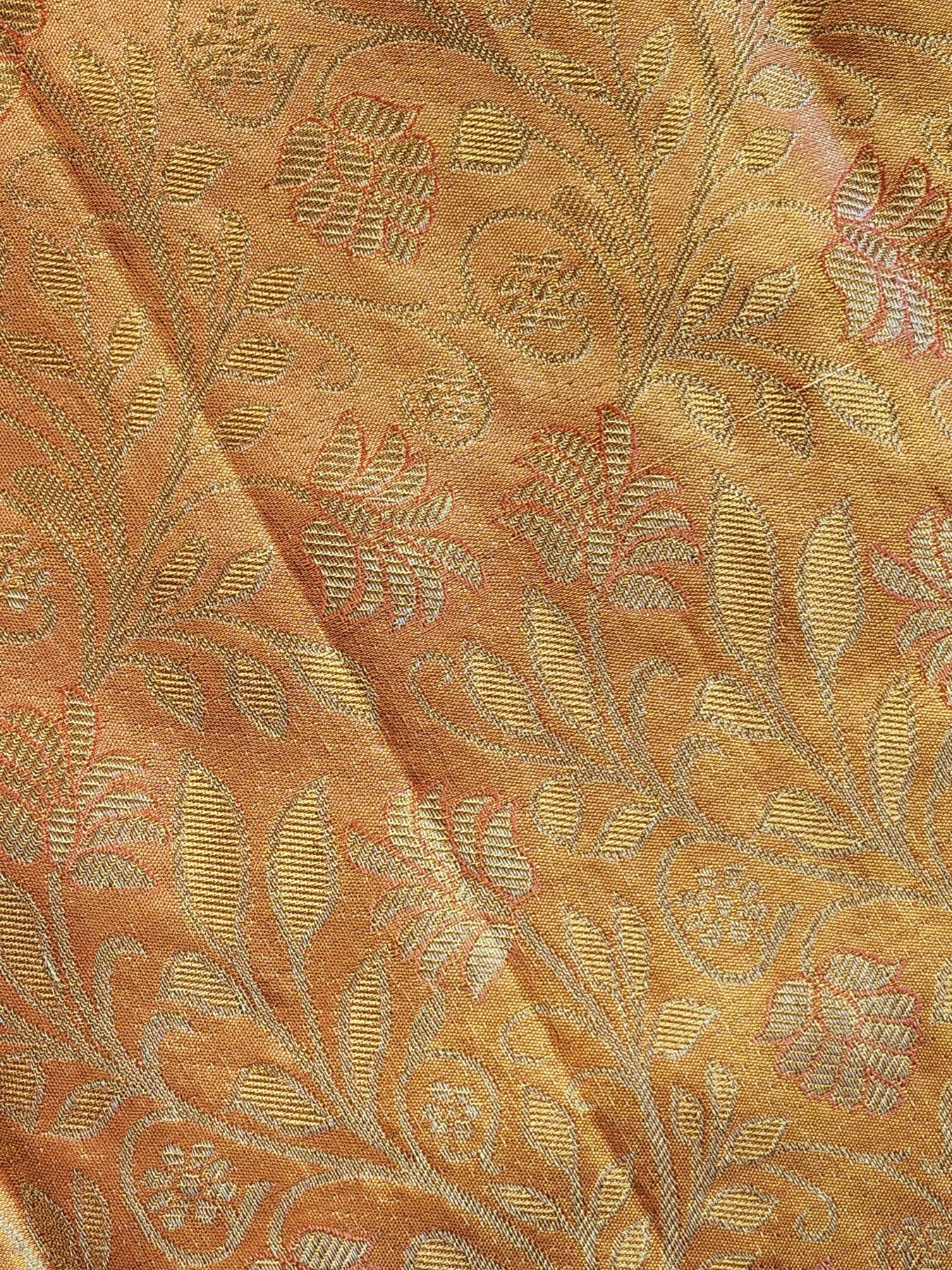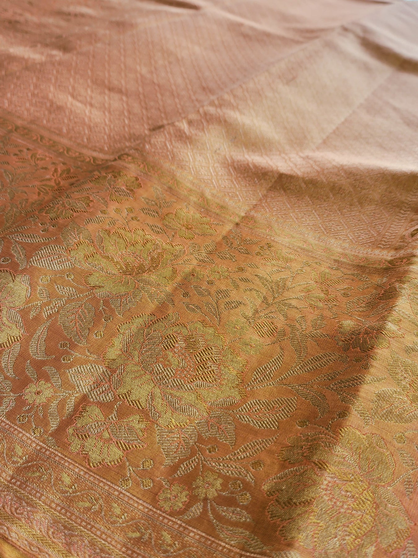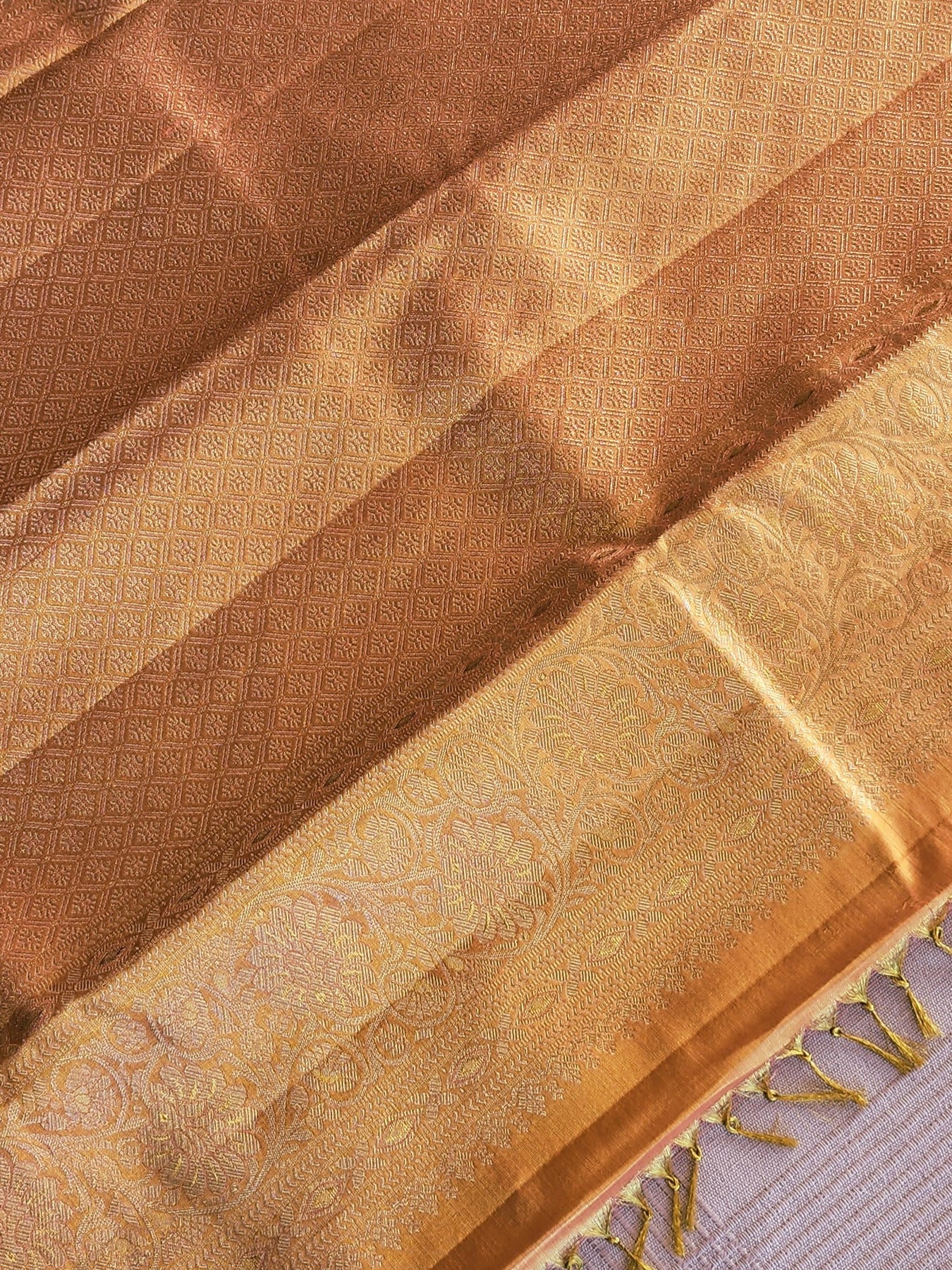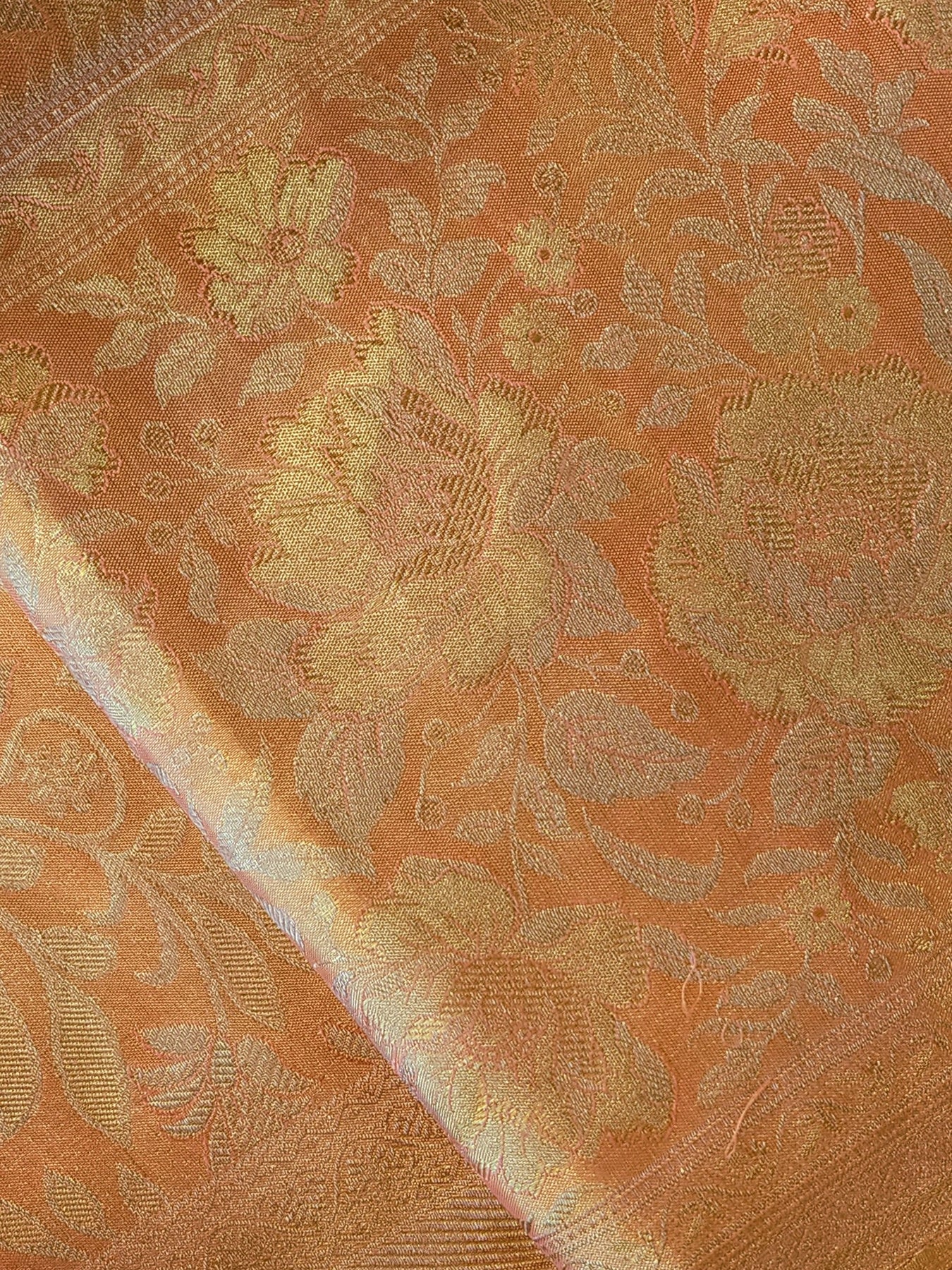 An elegant Tissue Kanjivaram Pure Silk Saree with woven Floral designs with Zari Borders and a Pallu.