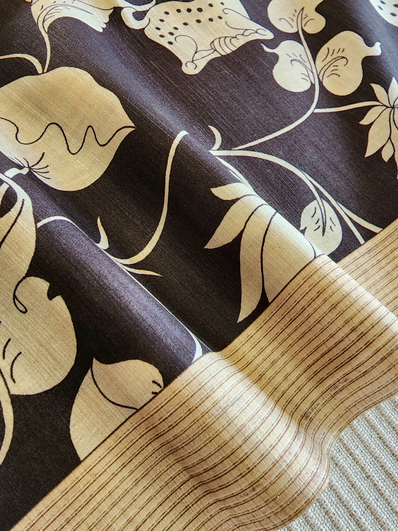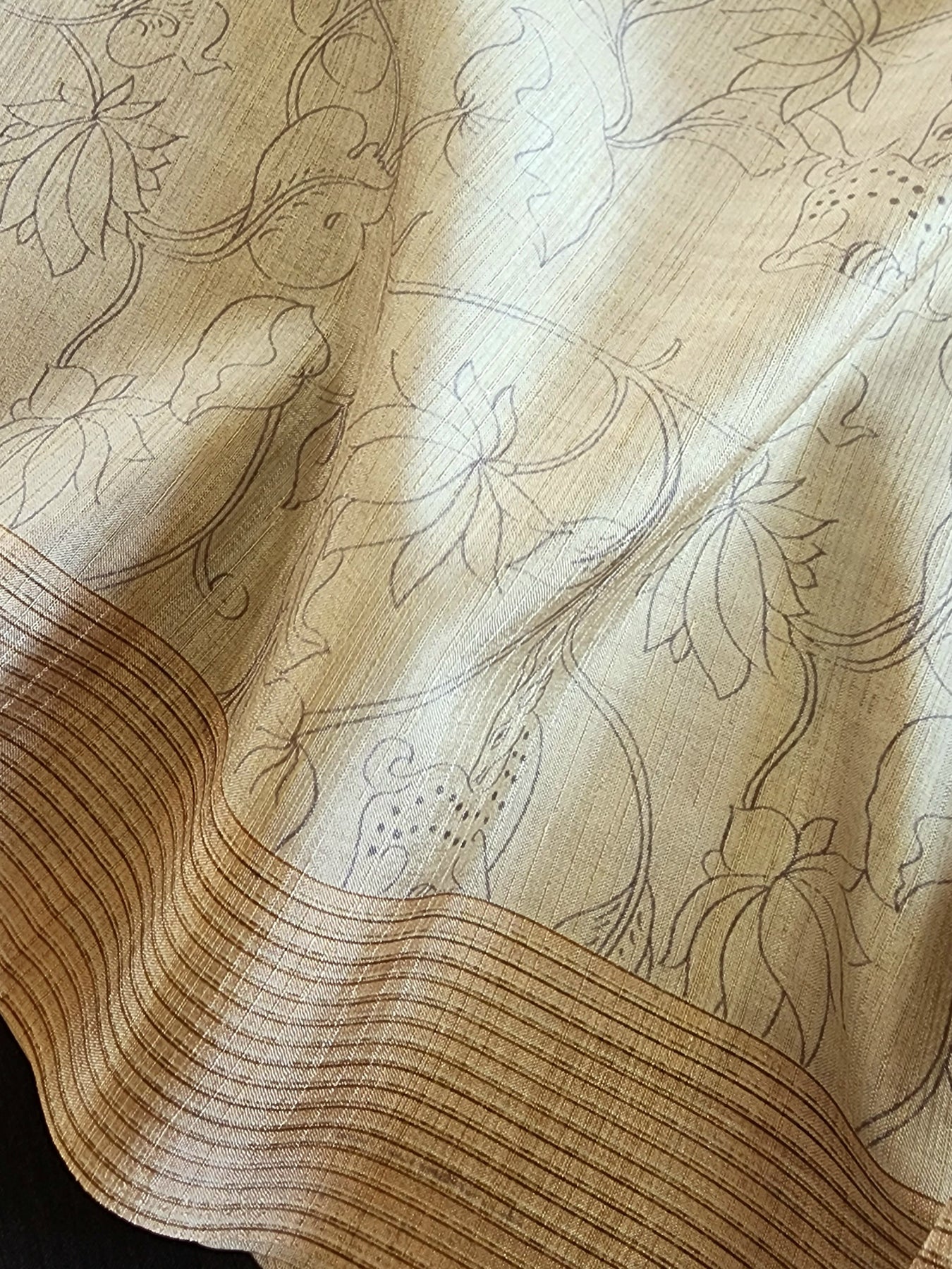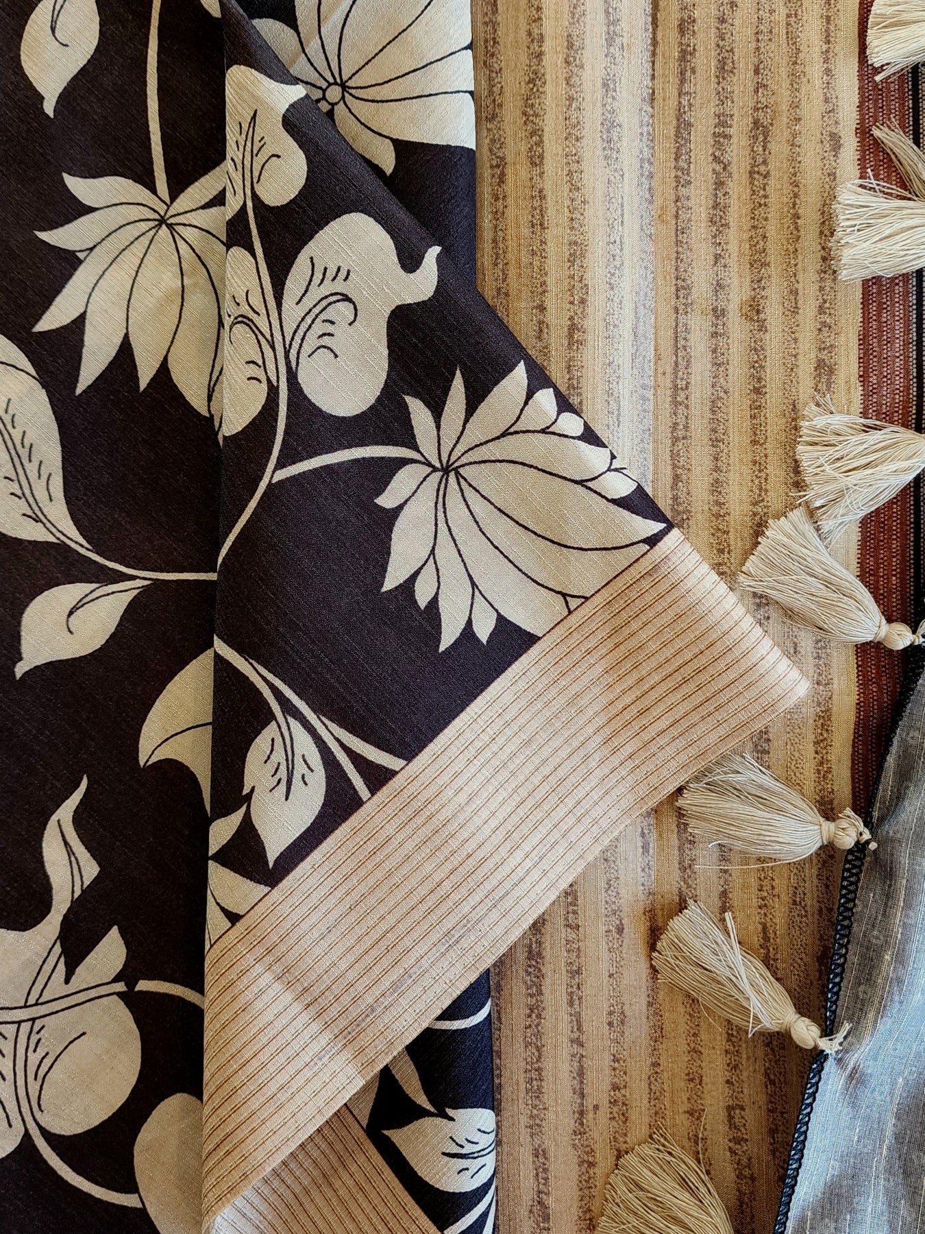 An elegant Semi Tussar Silk Saree with contrast borders and Digital Floral Prints on body of the saree