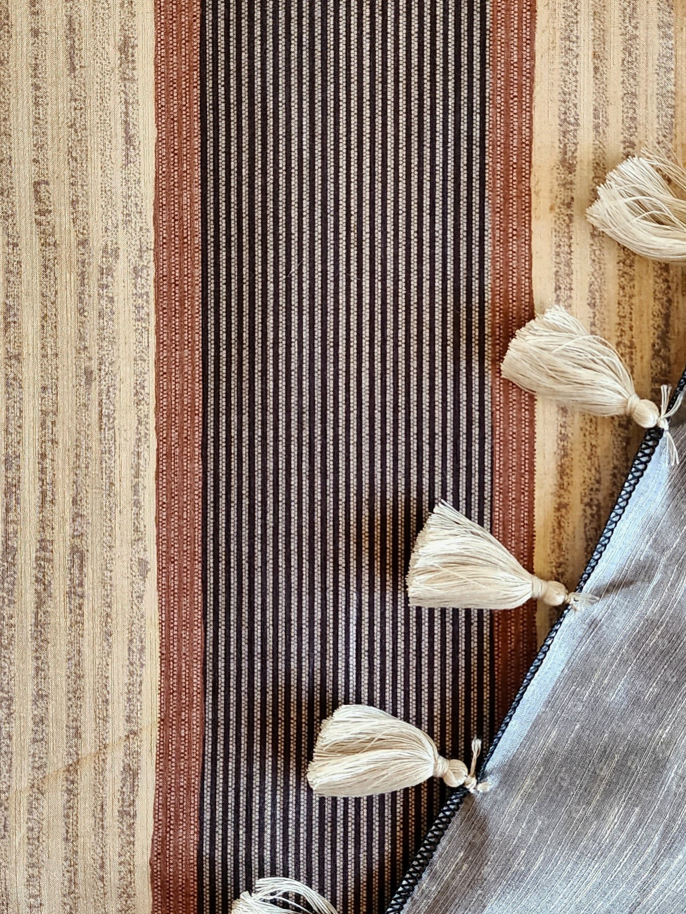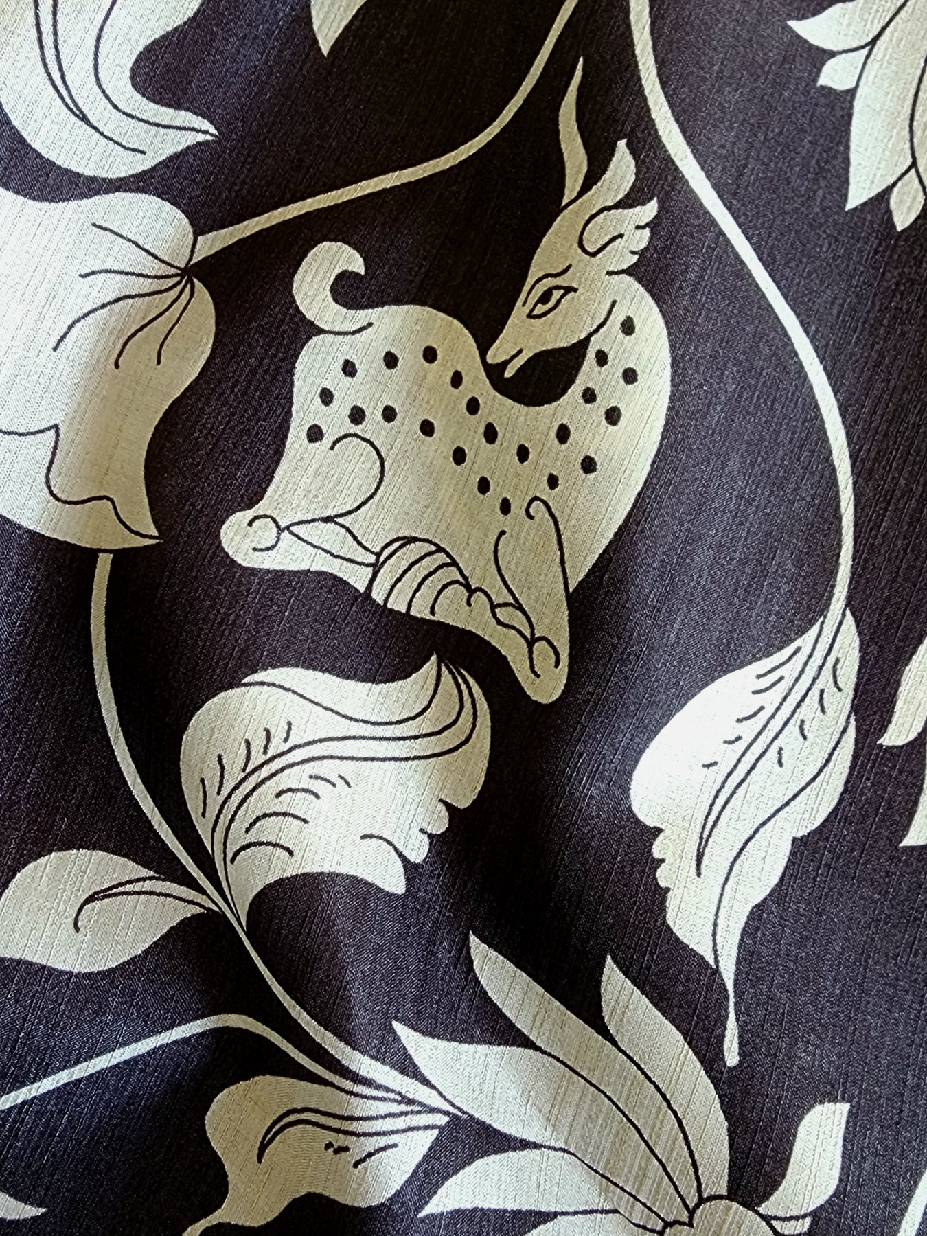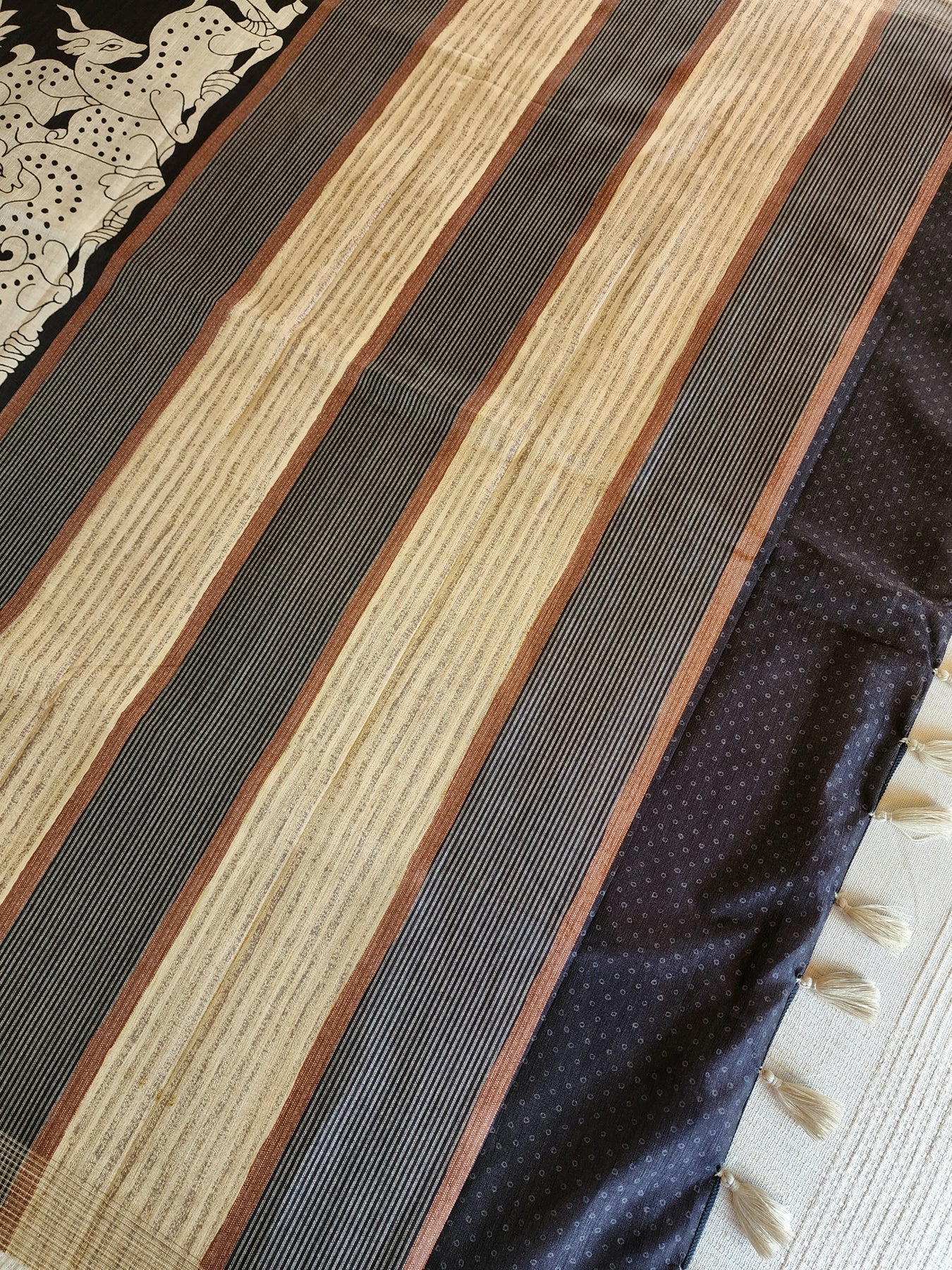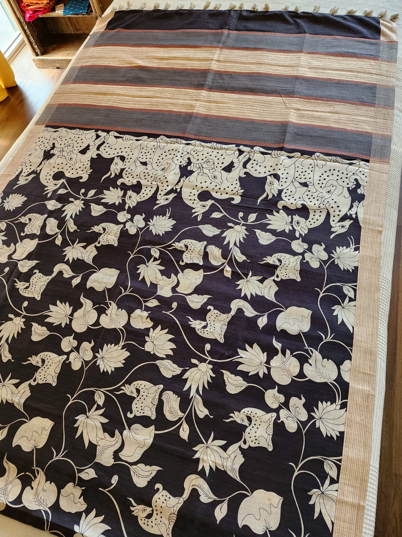An elegant Semi Tussar Silk Saree with contrast borders and Digital Floral Prints on body of the saree