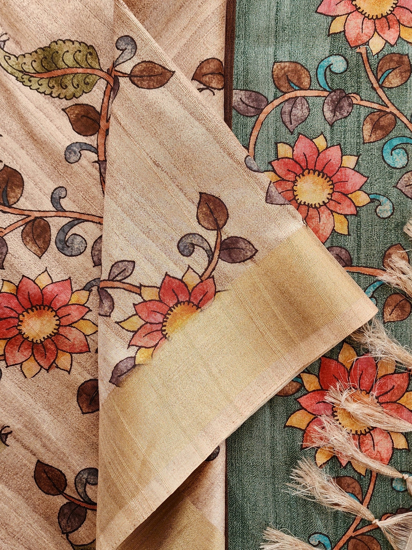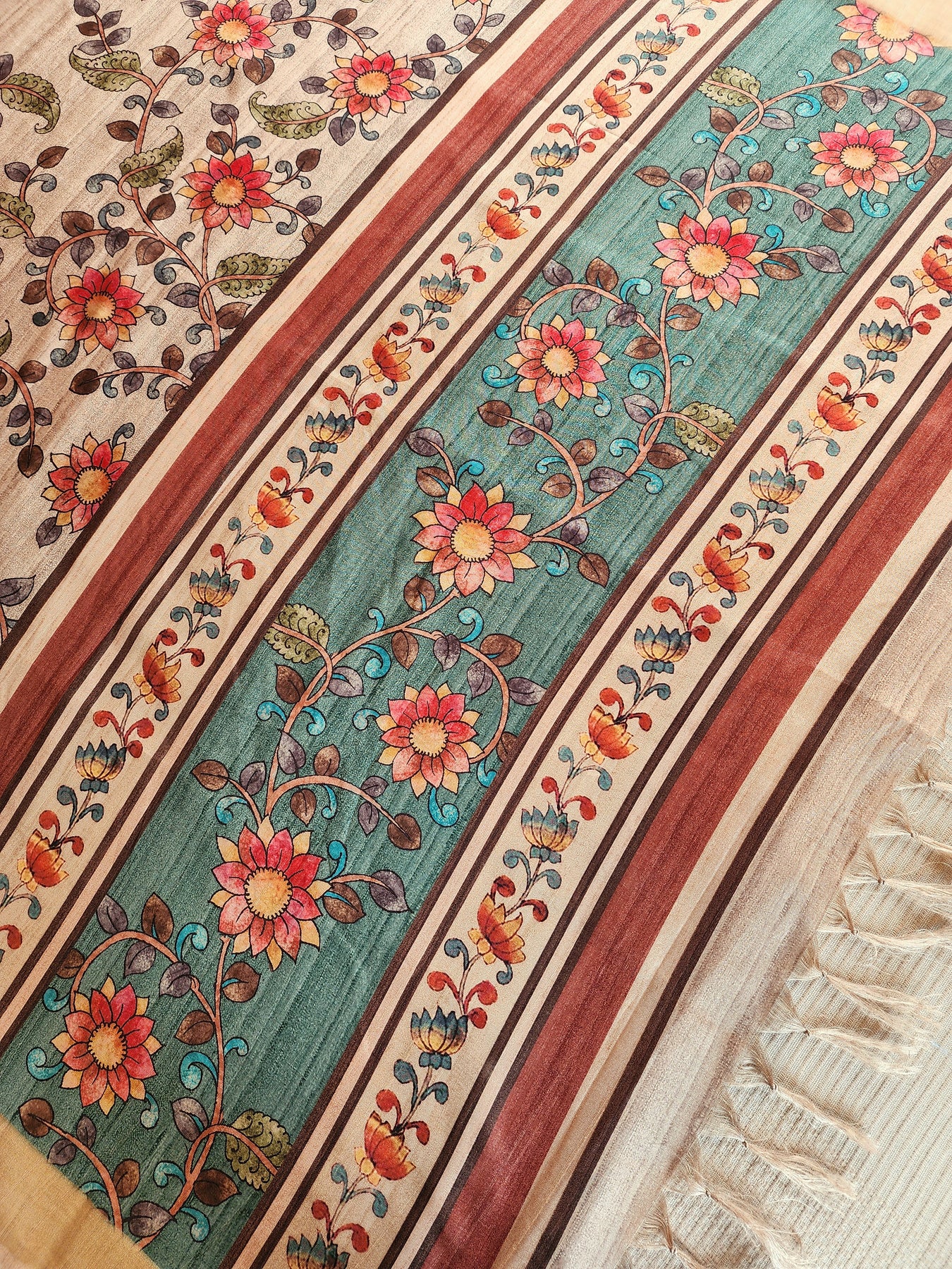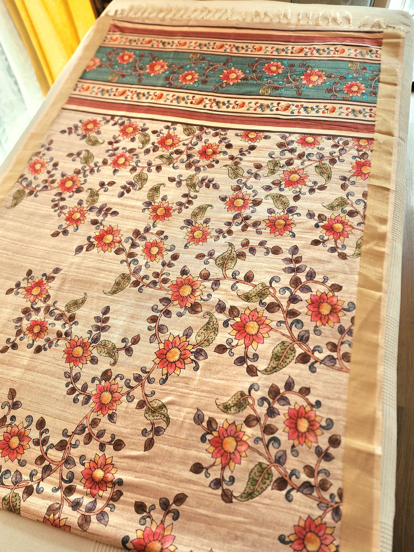 An elegant Semi Tussar Silk Saree with contrast borders and Digital Floral Prints on body of the saree