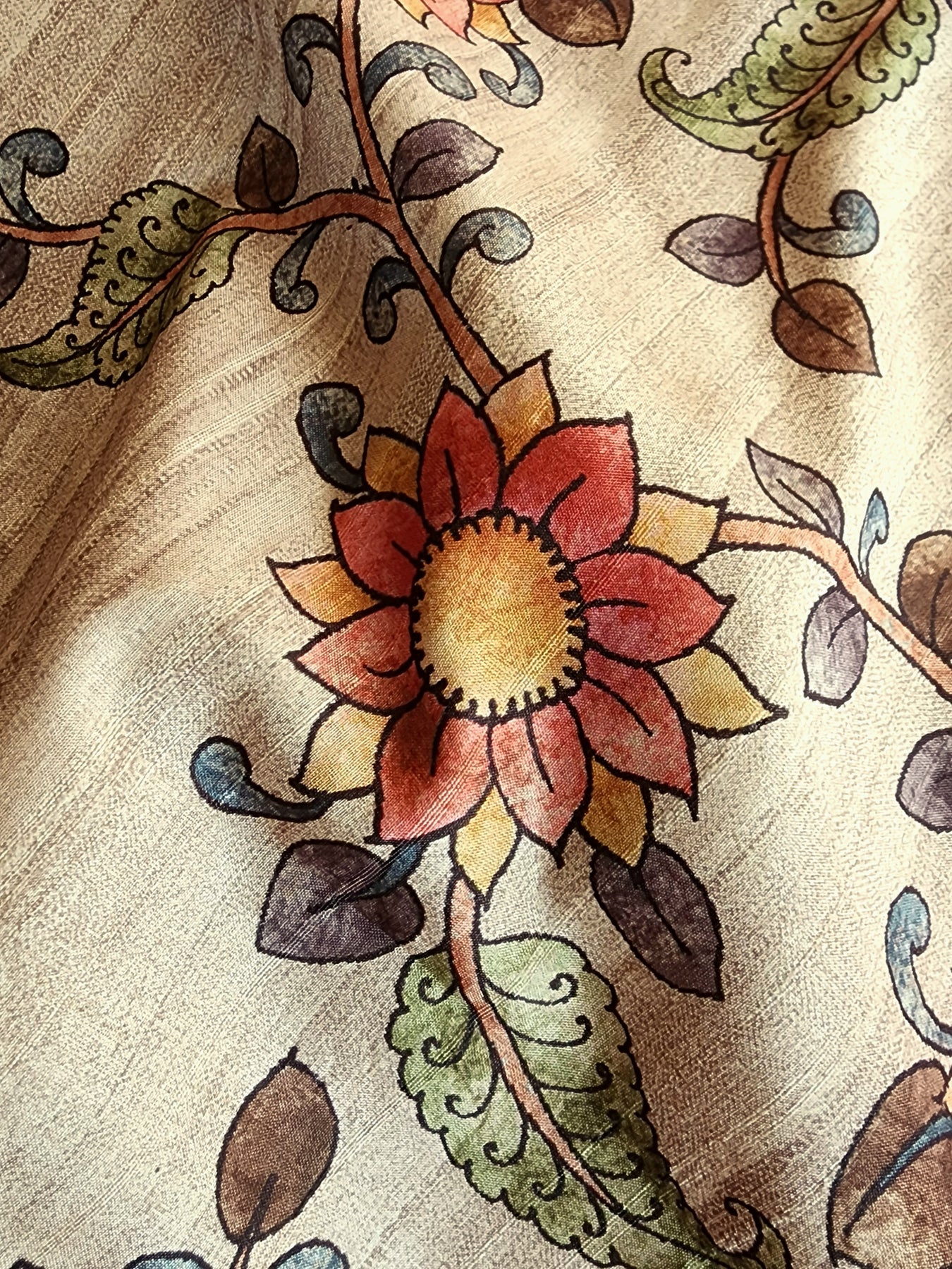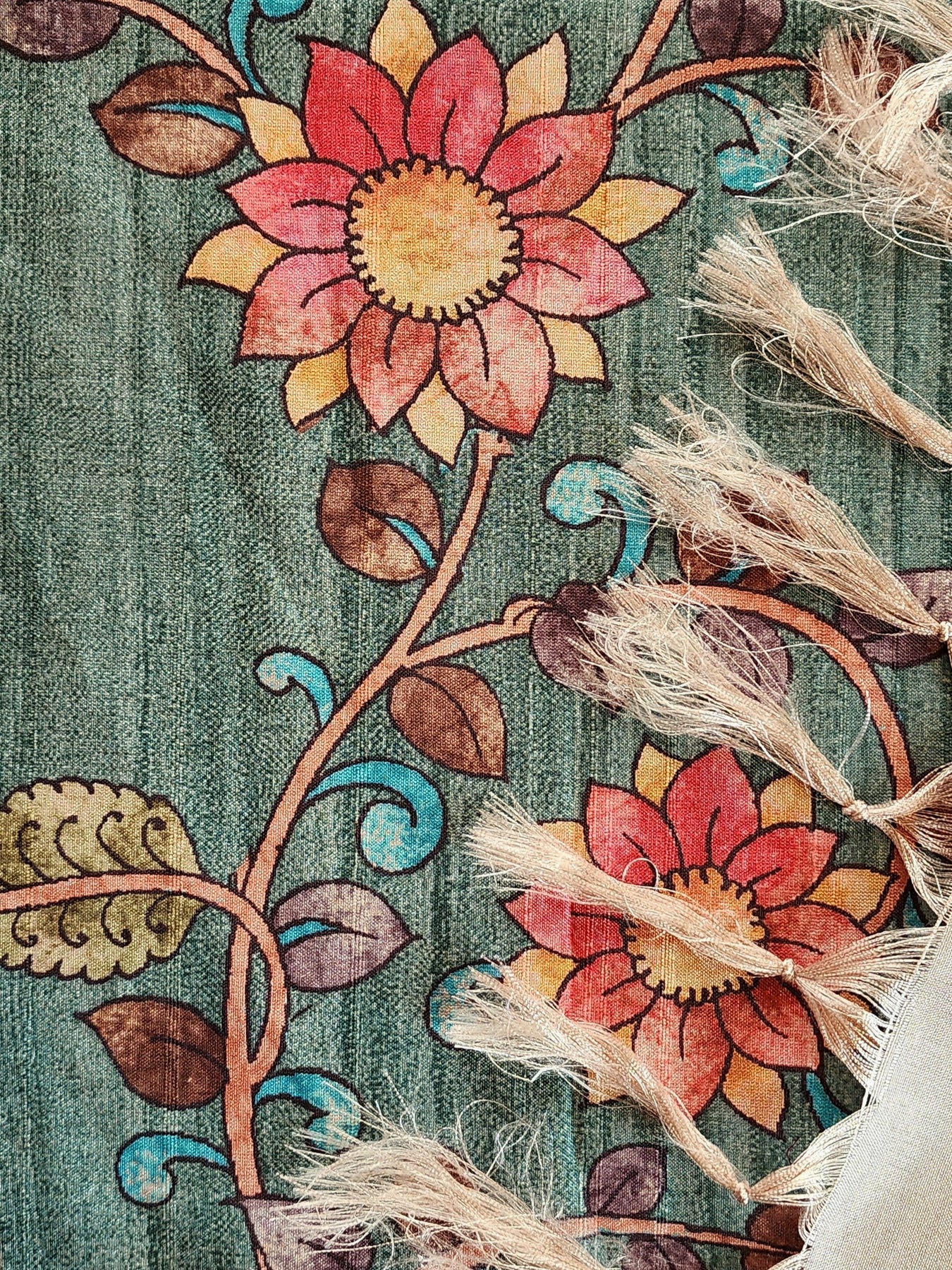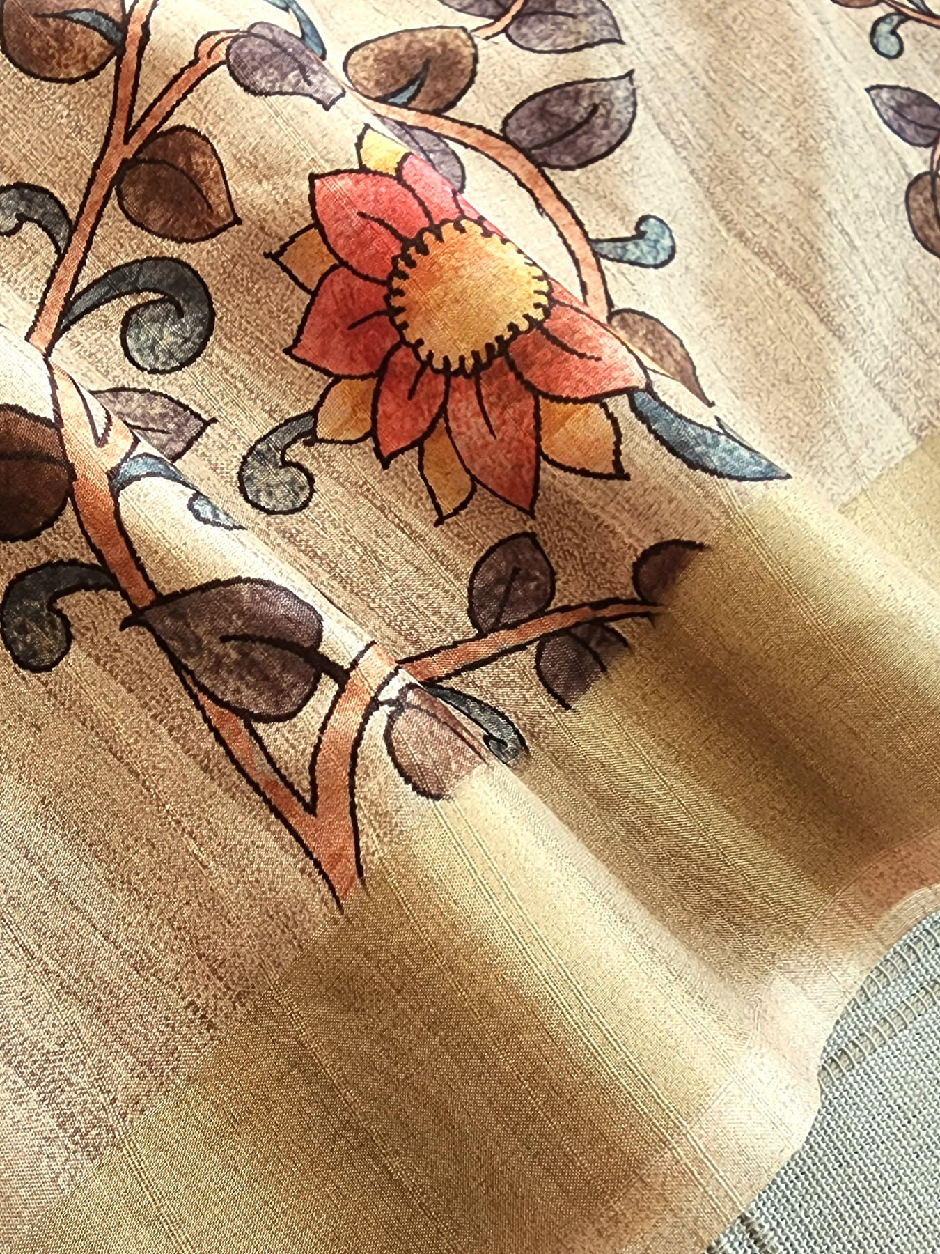 An elegant Semi Tussar Silk Saree with contrast borders and Digital Floral Prints on body of the saree