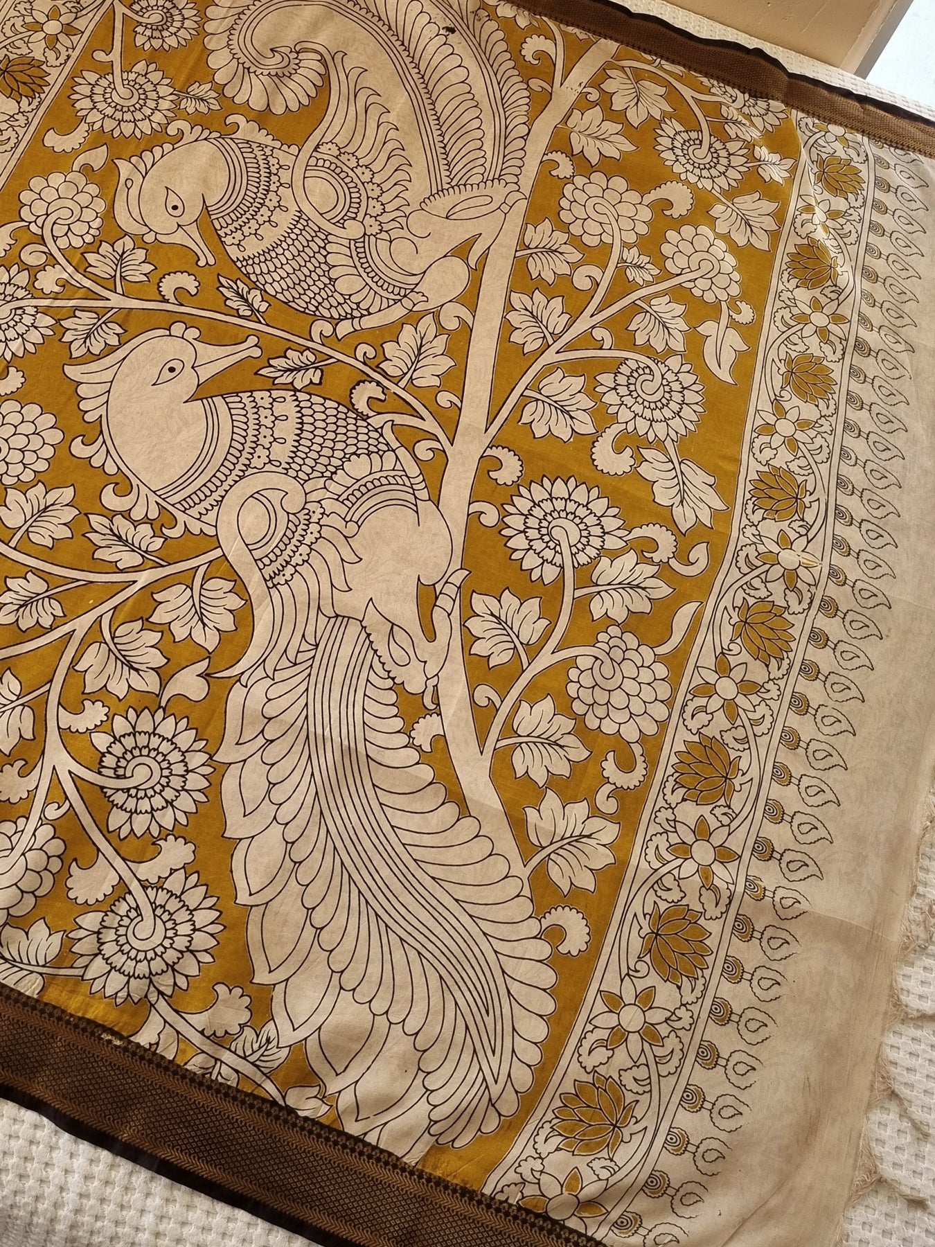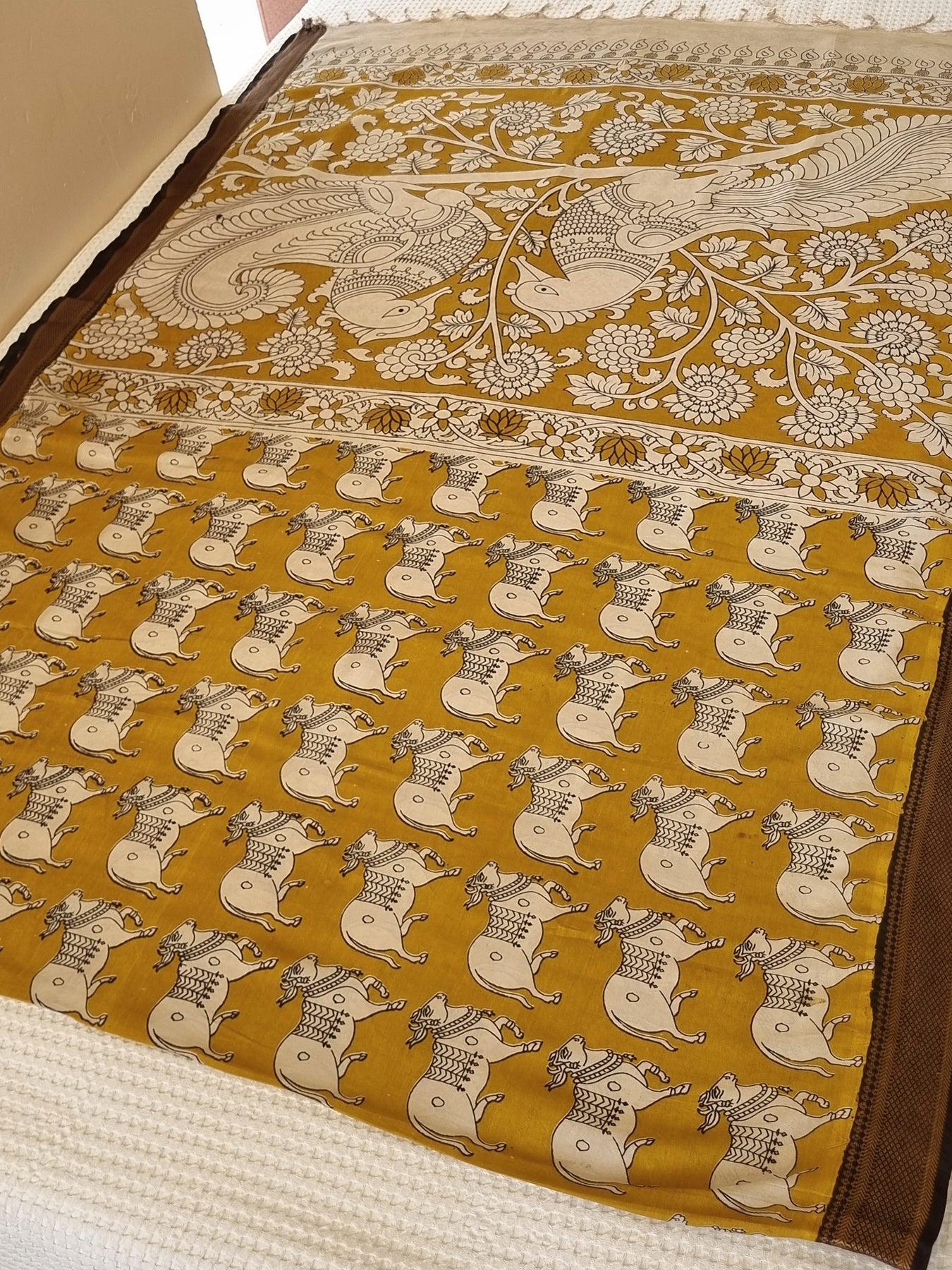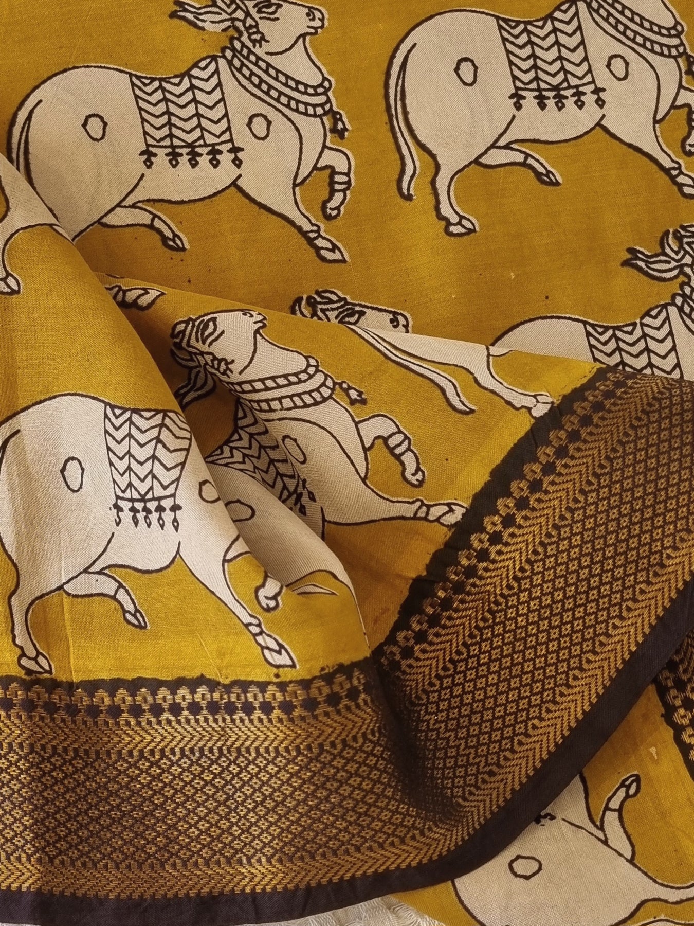 Beautiful saree with contrast borders and Kalamkari Prints on the Body & Pallu