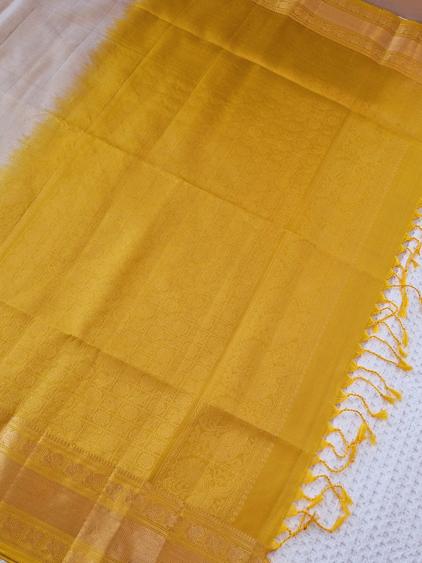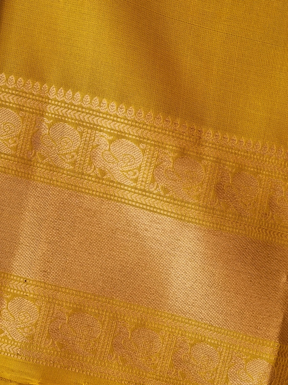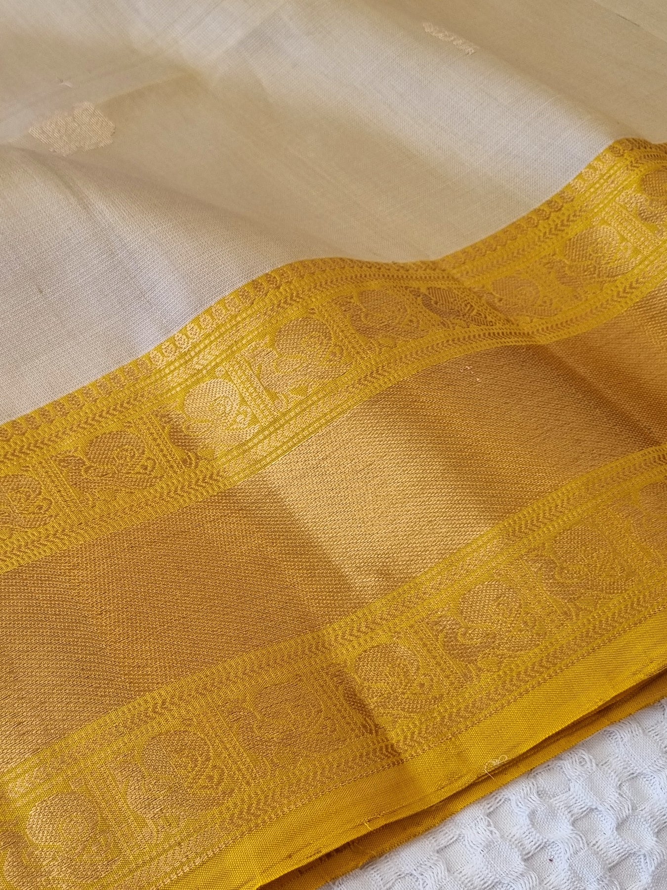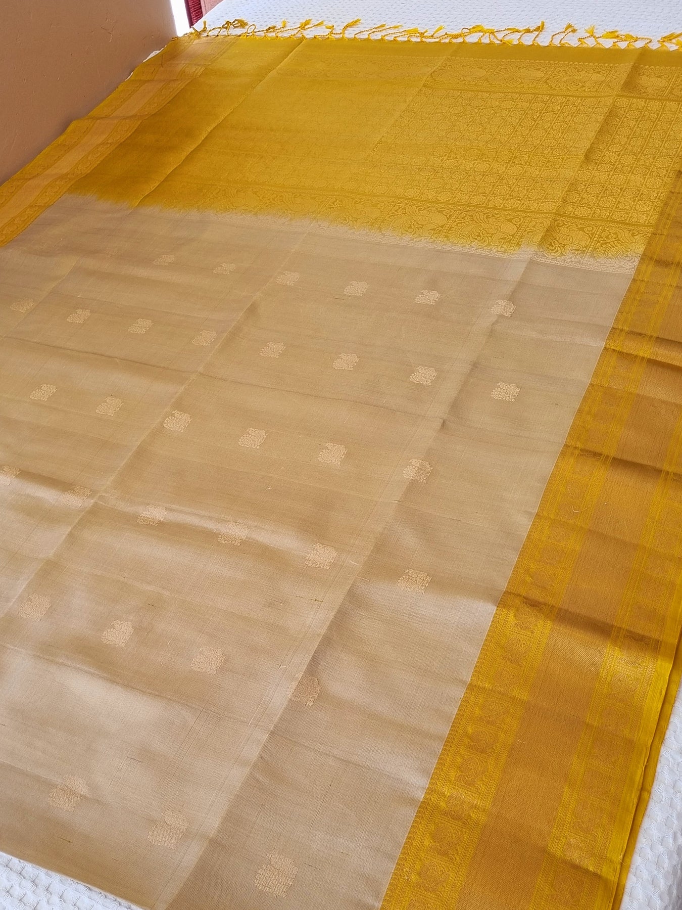 Beautiful Handwoven Soft Silk Saree with a contrast edgings and intricately woven gold motifs on the body and a rich woven pallu