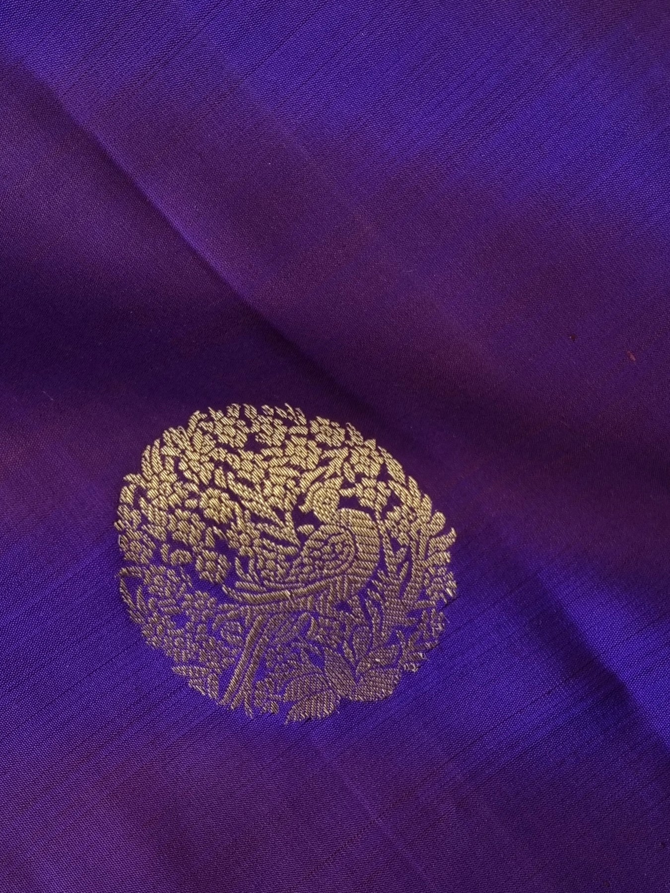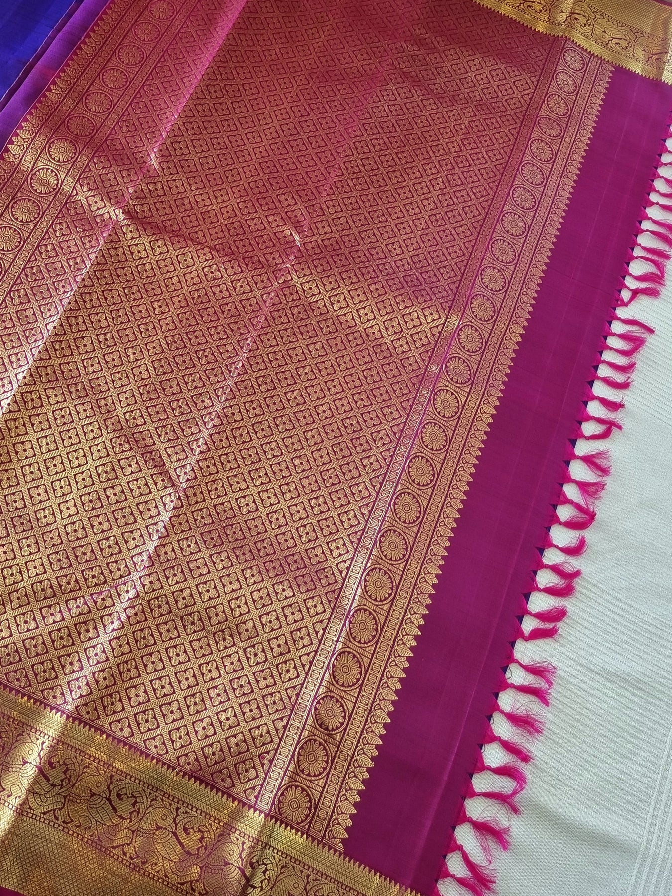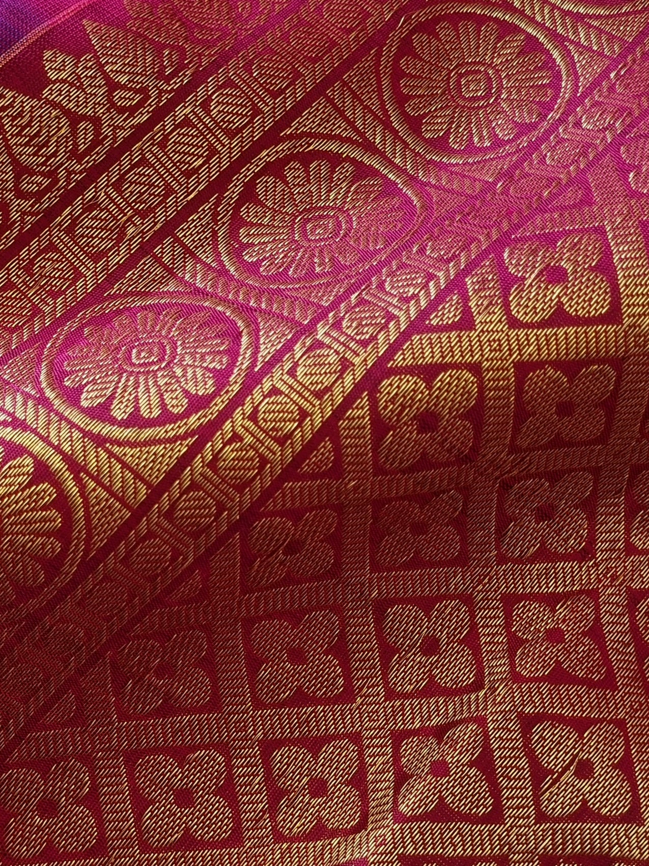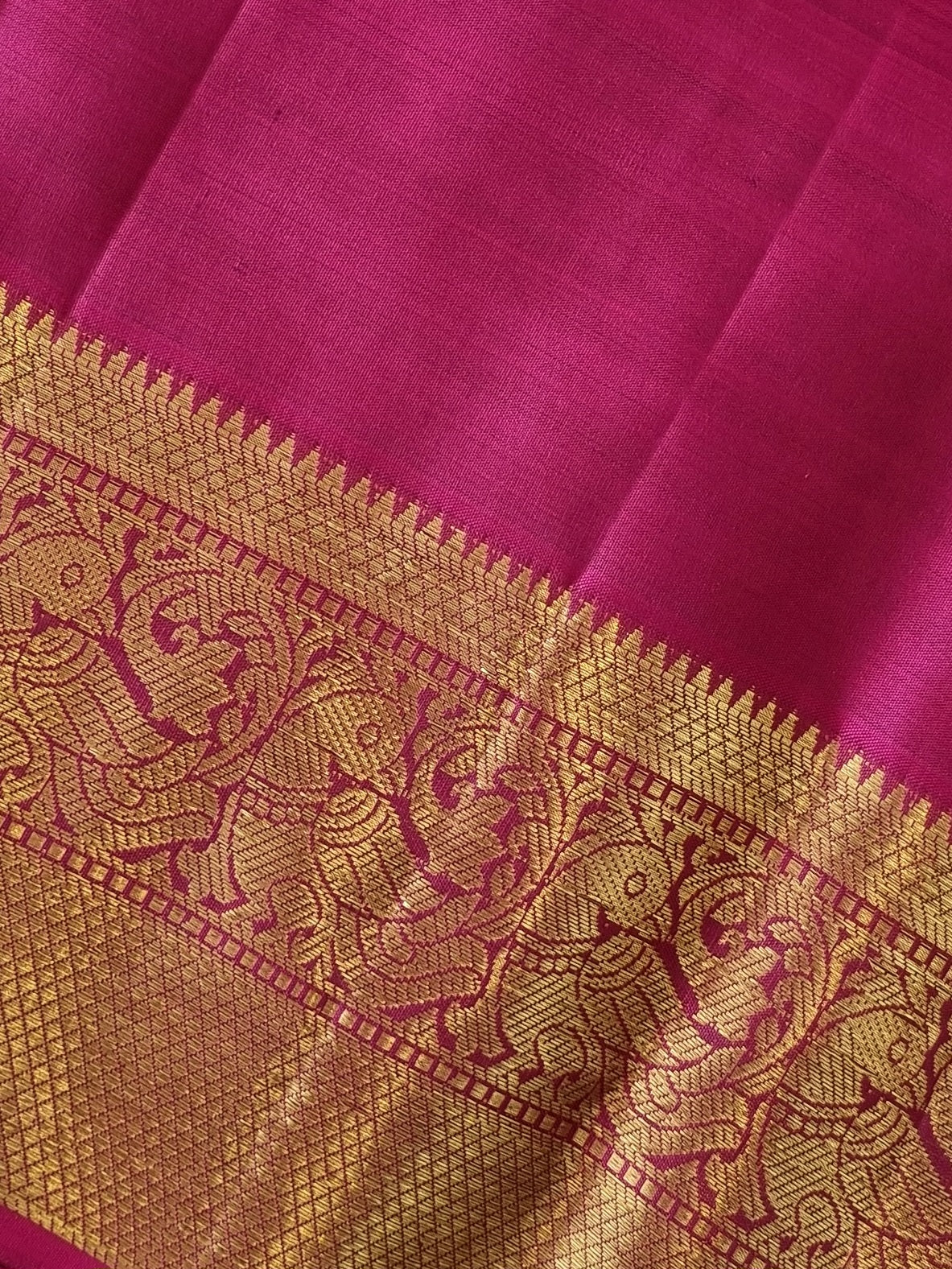 An elegant Kanjivaram Pure Silk Saree with Contrast borders and Gold Motifs on the Body and Pallu.