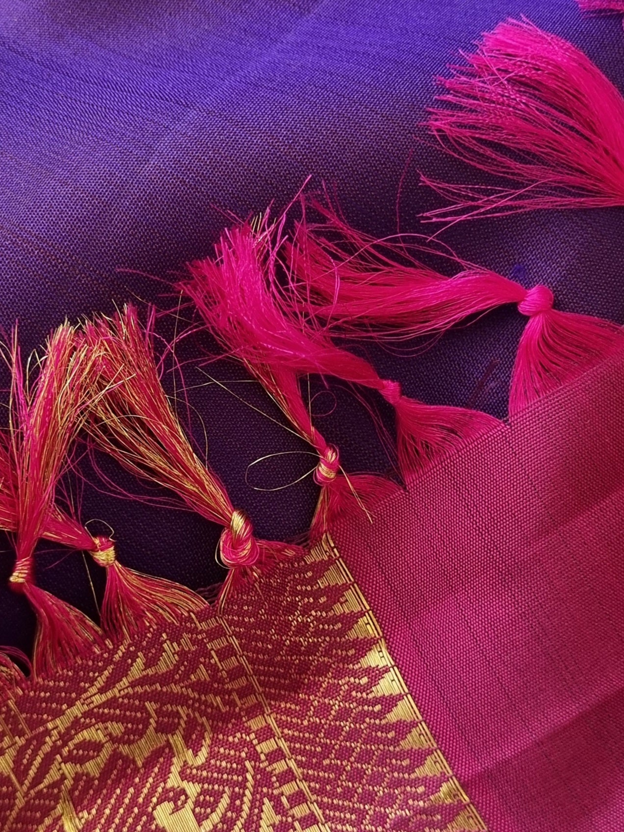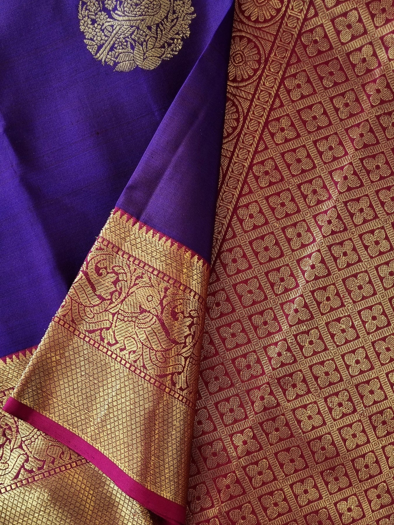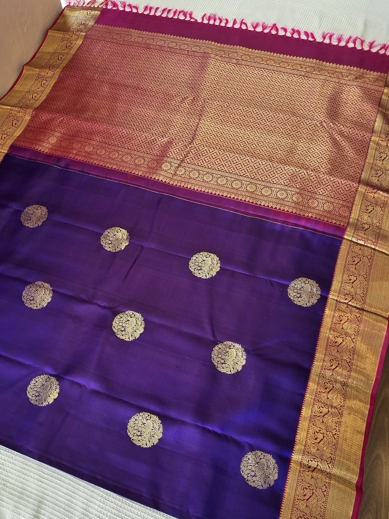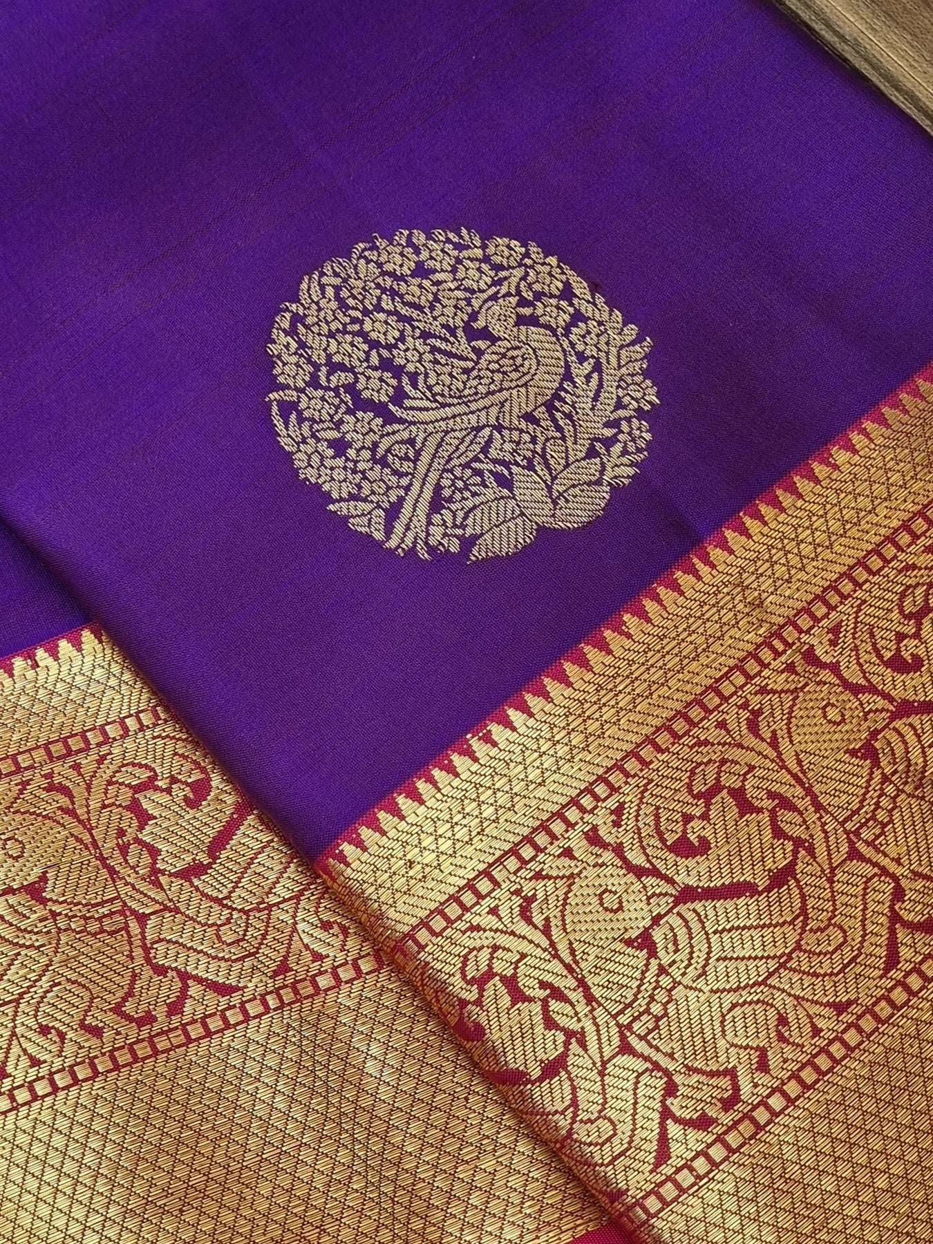 An elegant Kanjivaram Pure Silk Saree with Contrast borders and Gold Motifs on the Body and Pallu.