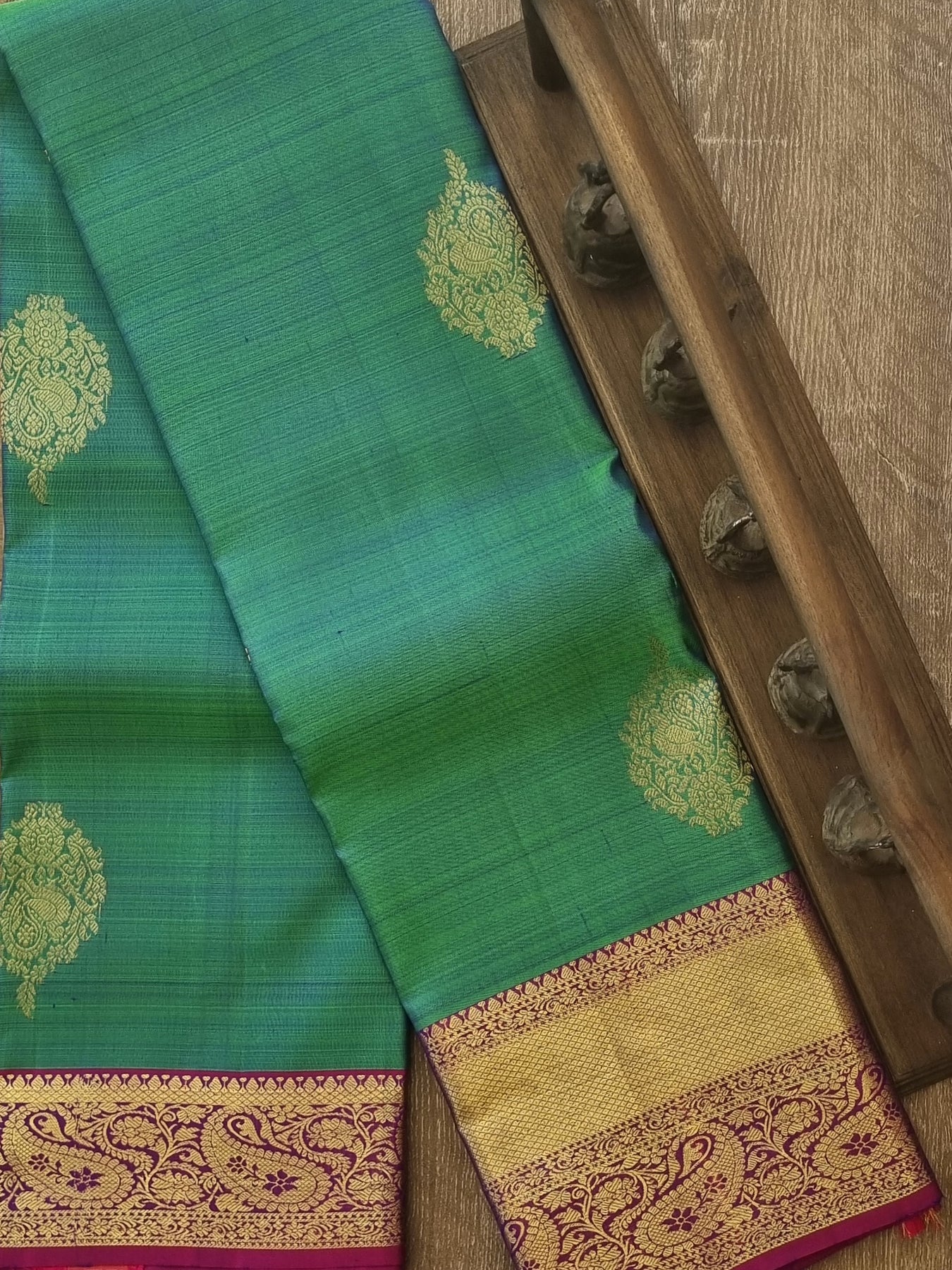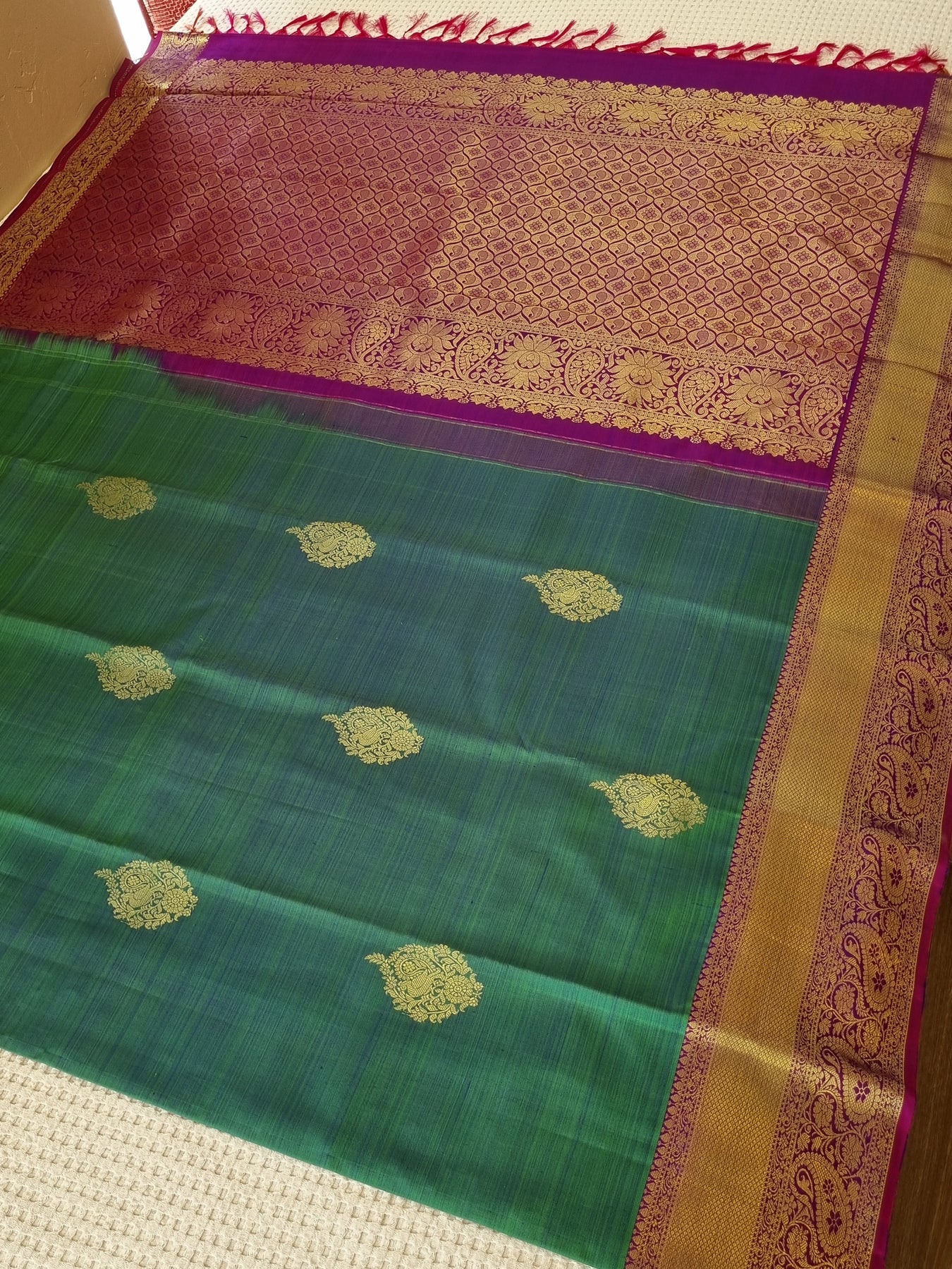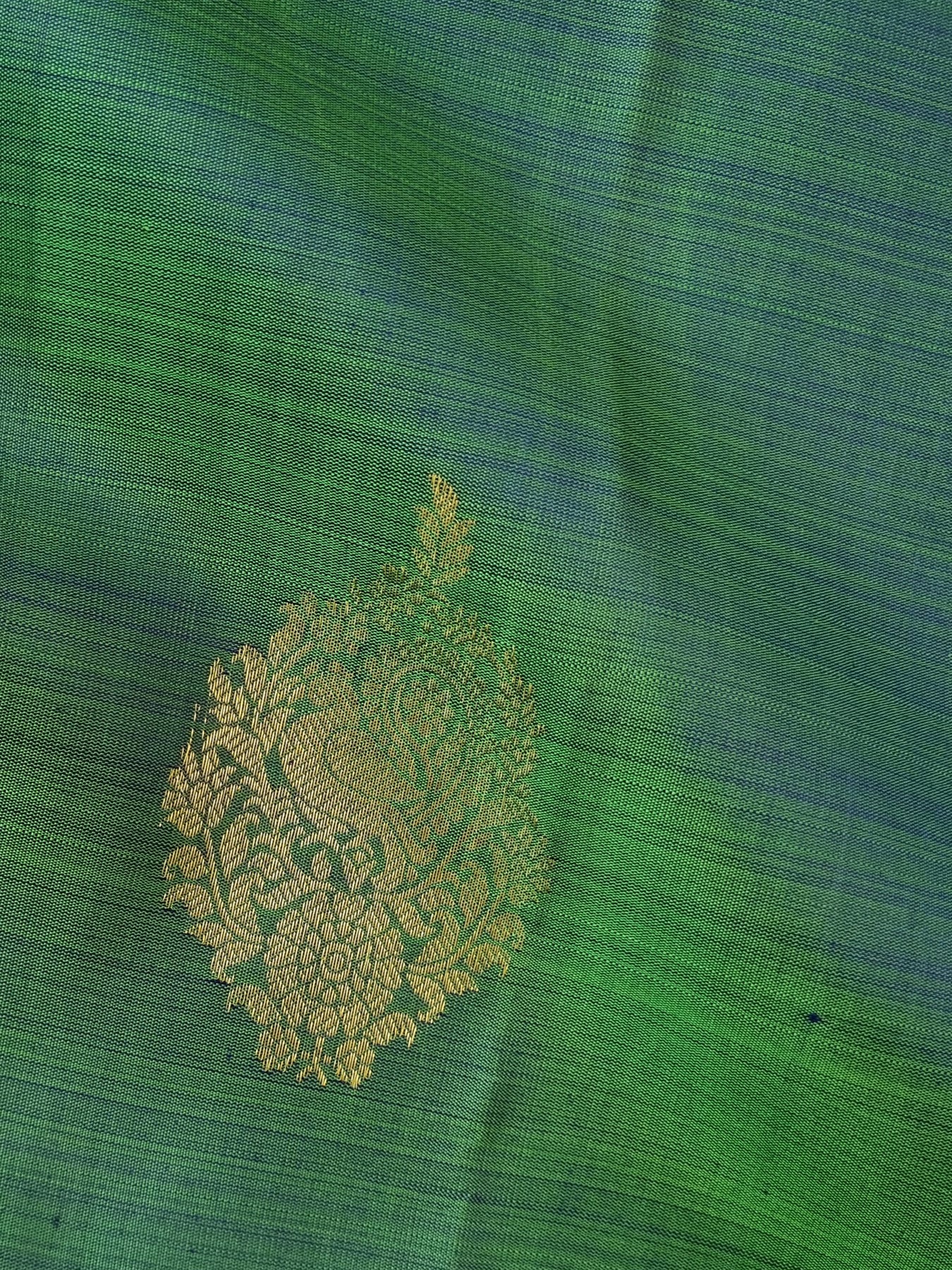 • An elegant Kanjivaram Pure Silk Saree with Contrast borders and Gold Motifs on the Body and Pallu.