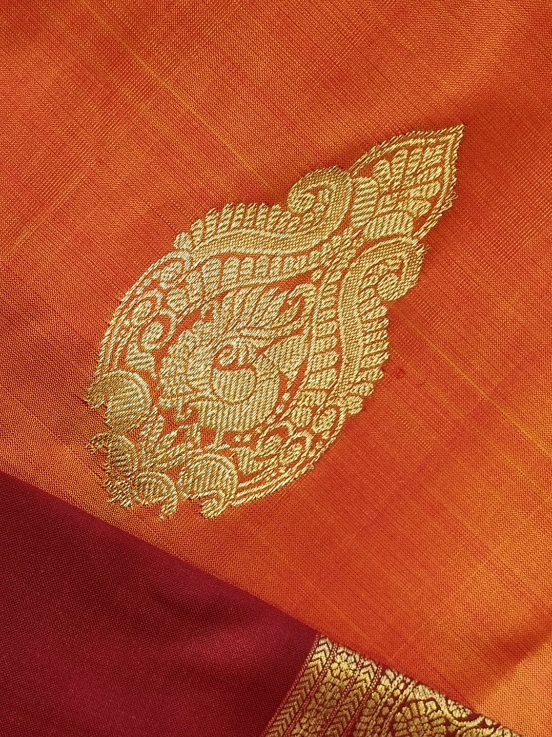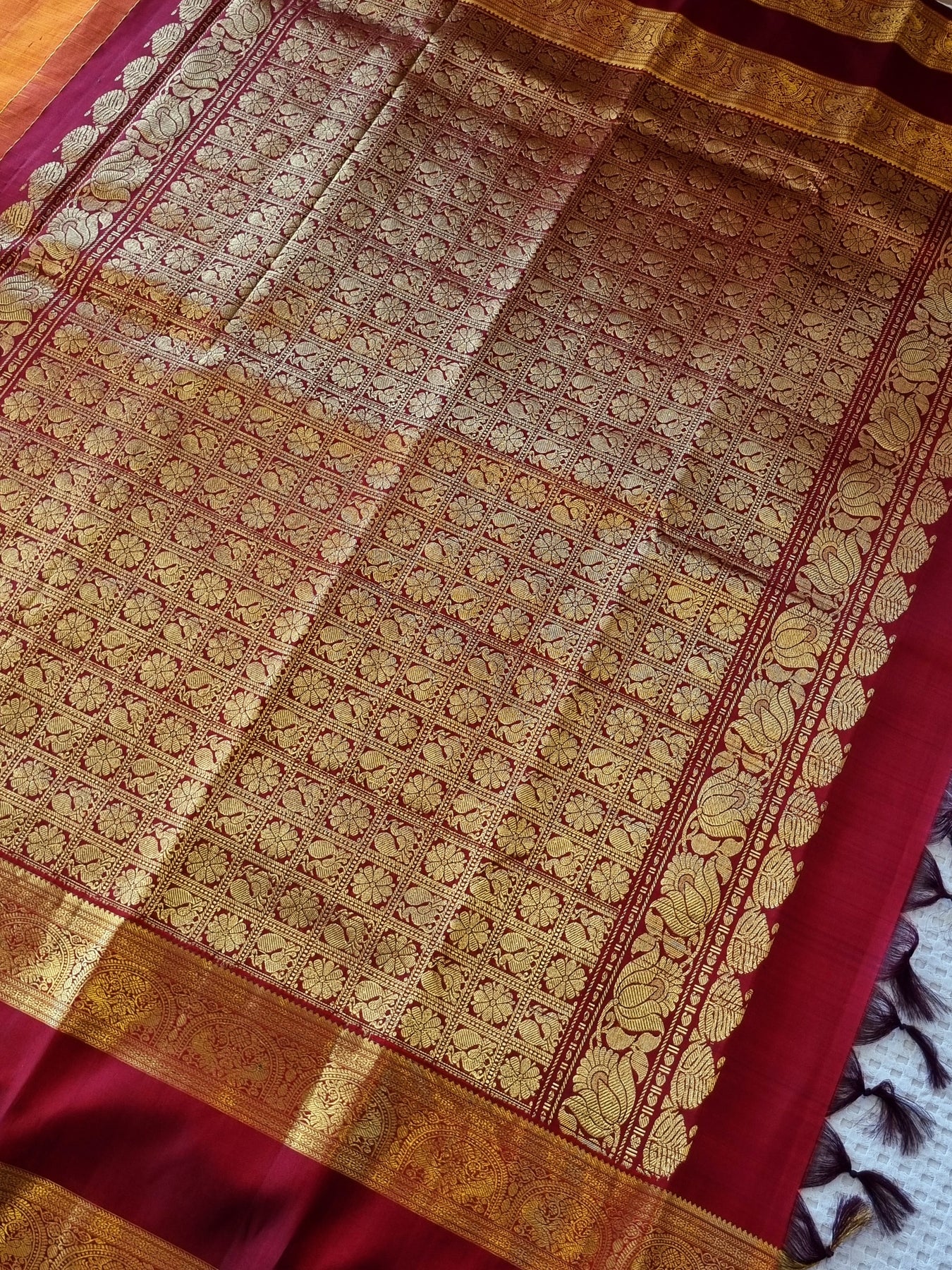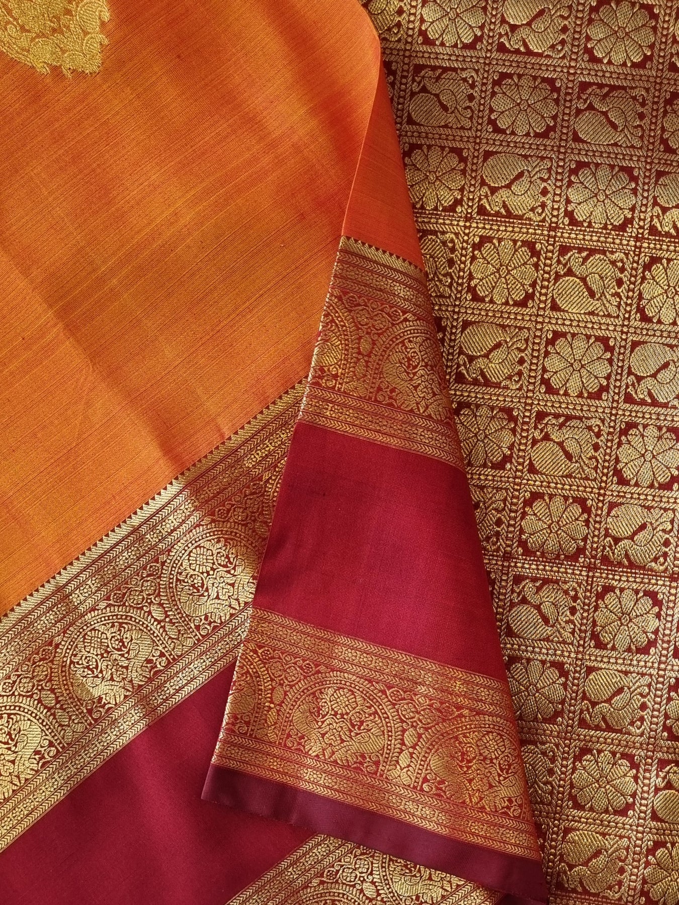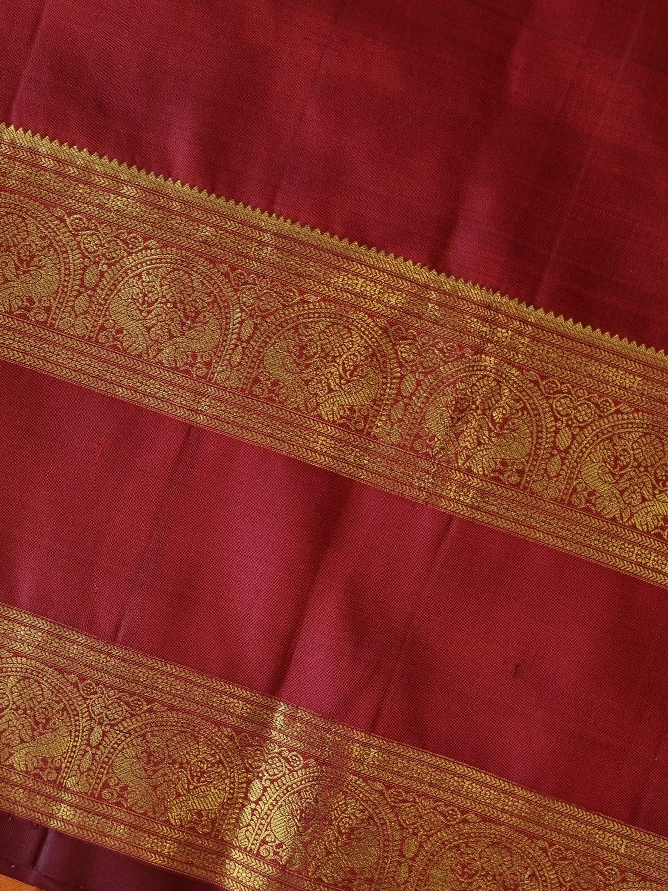 An elegant Kanjivaram Pure Silk Saree with Contrast borders and Gold Motifs on the Body and Pallu.